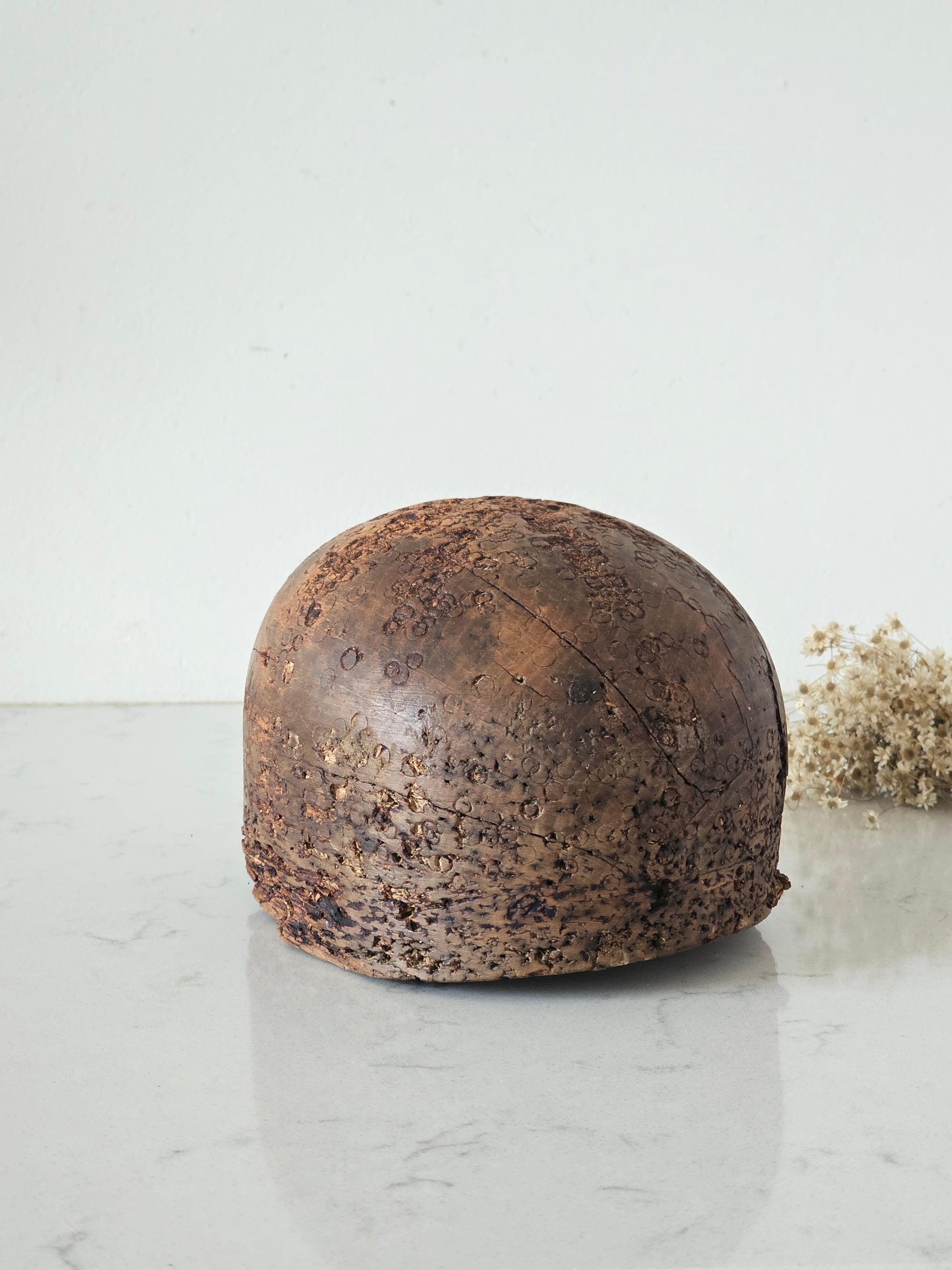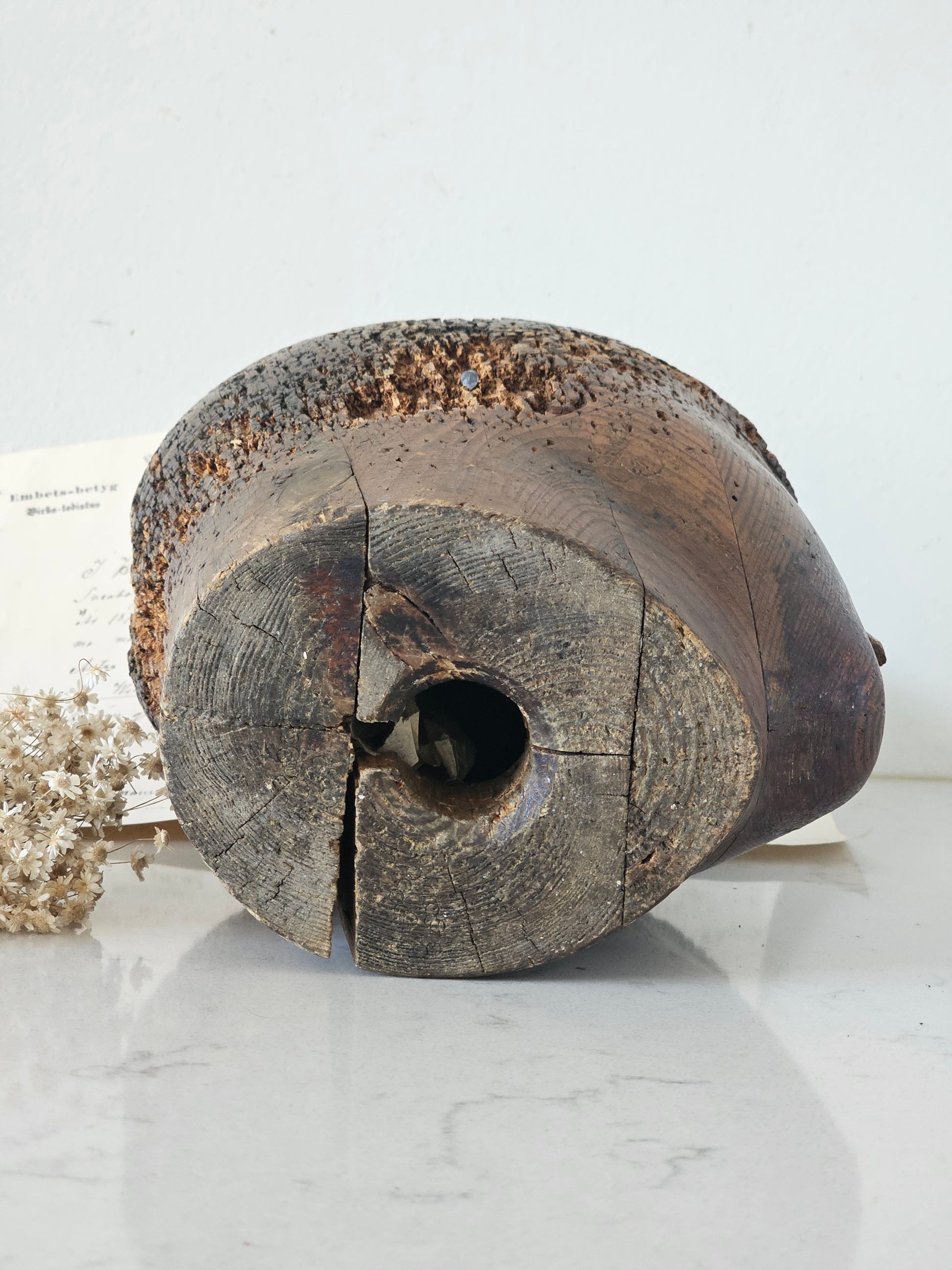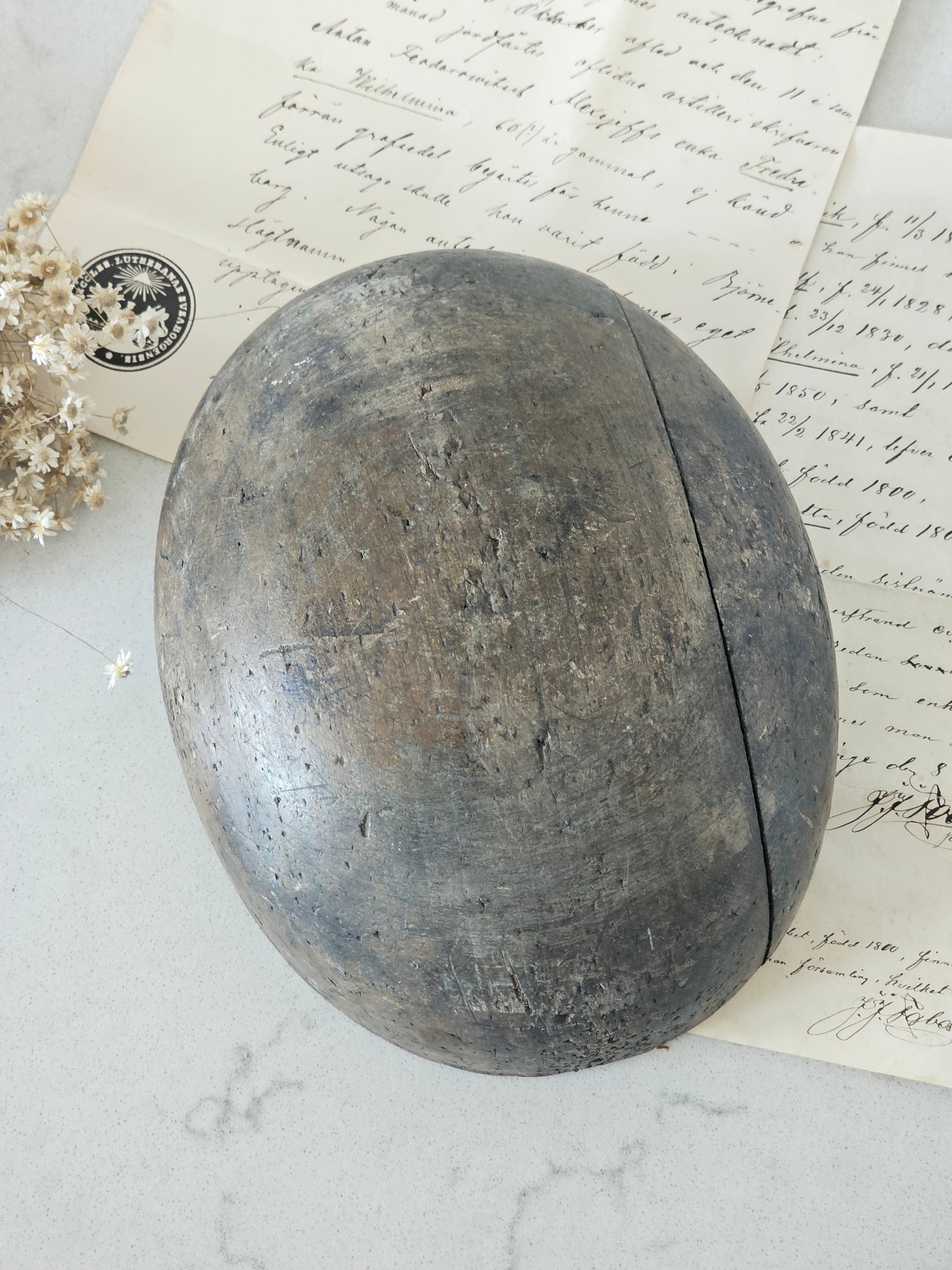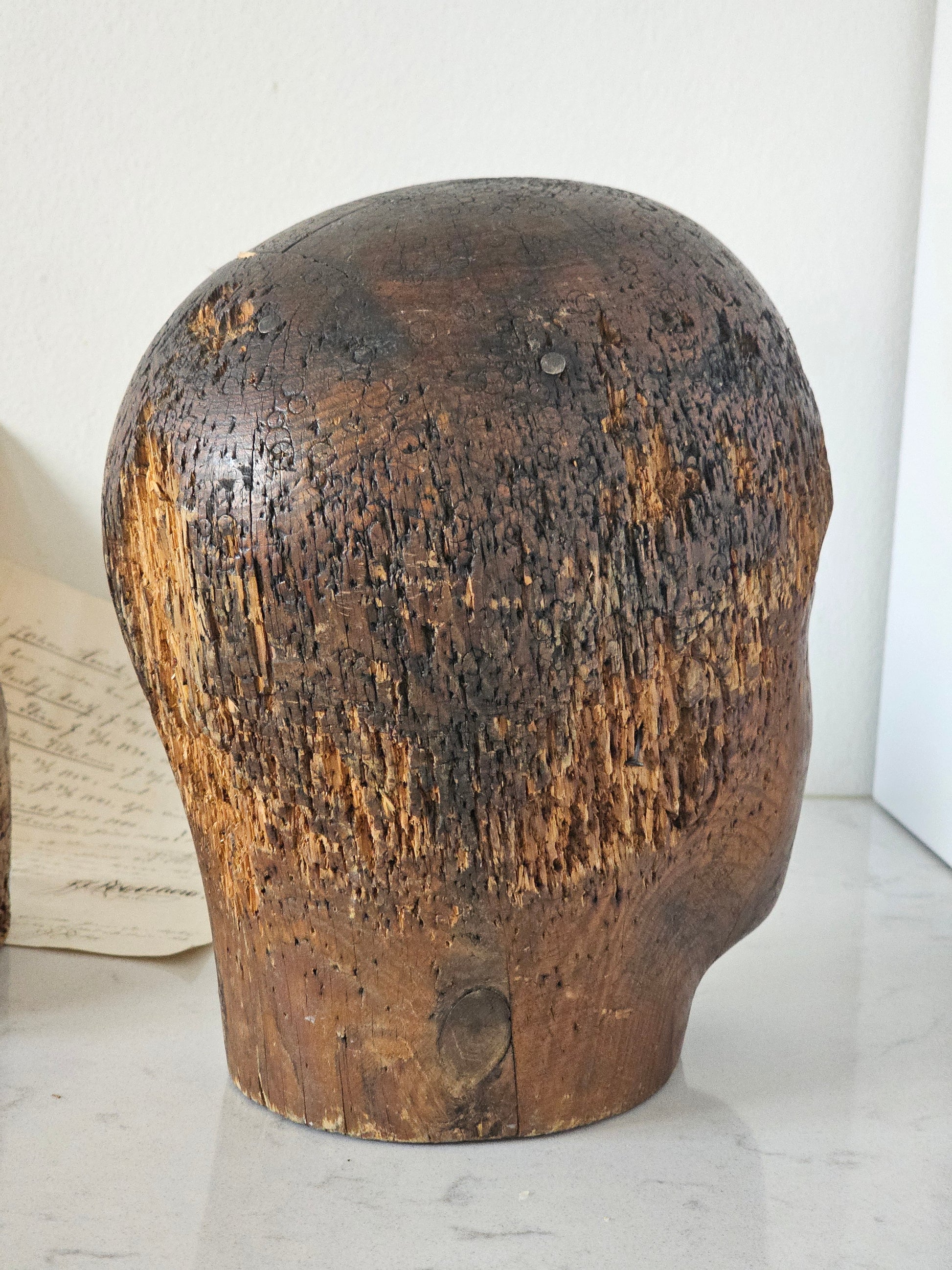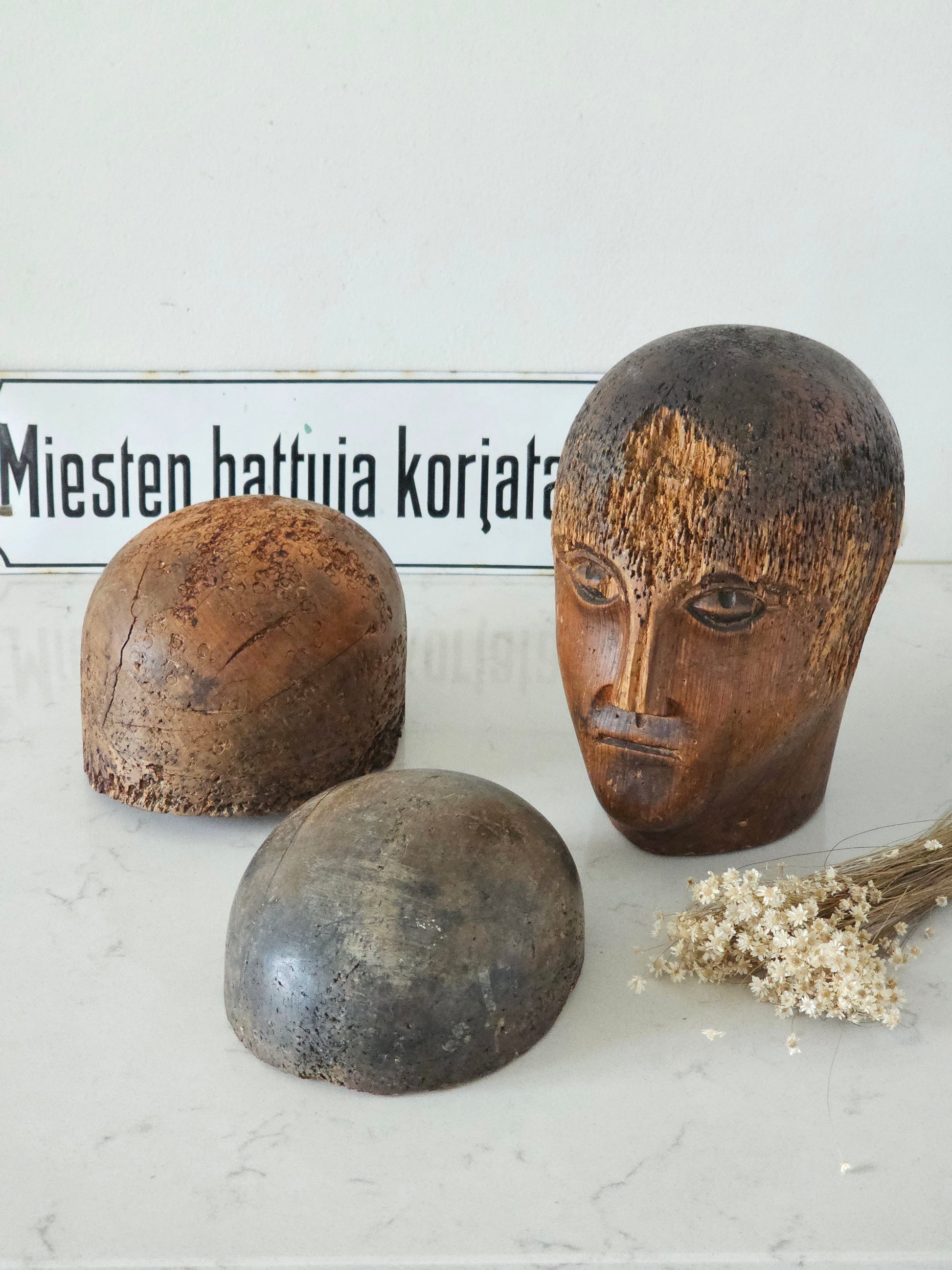 Kolme erilaista päänmuotoista hattutukkia. Tukit ovat vanhoja, peräisin lahtelaisesta 1960-luvulla lopettaneesta hattukaupasta.