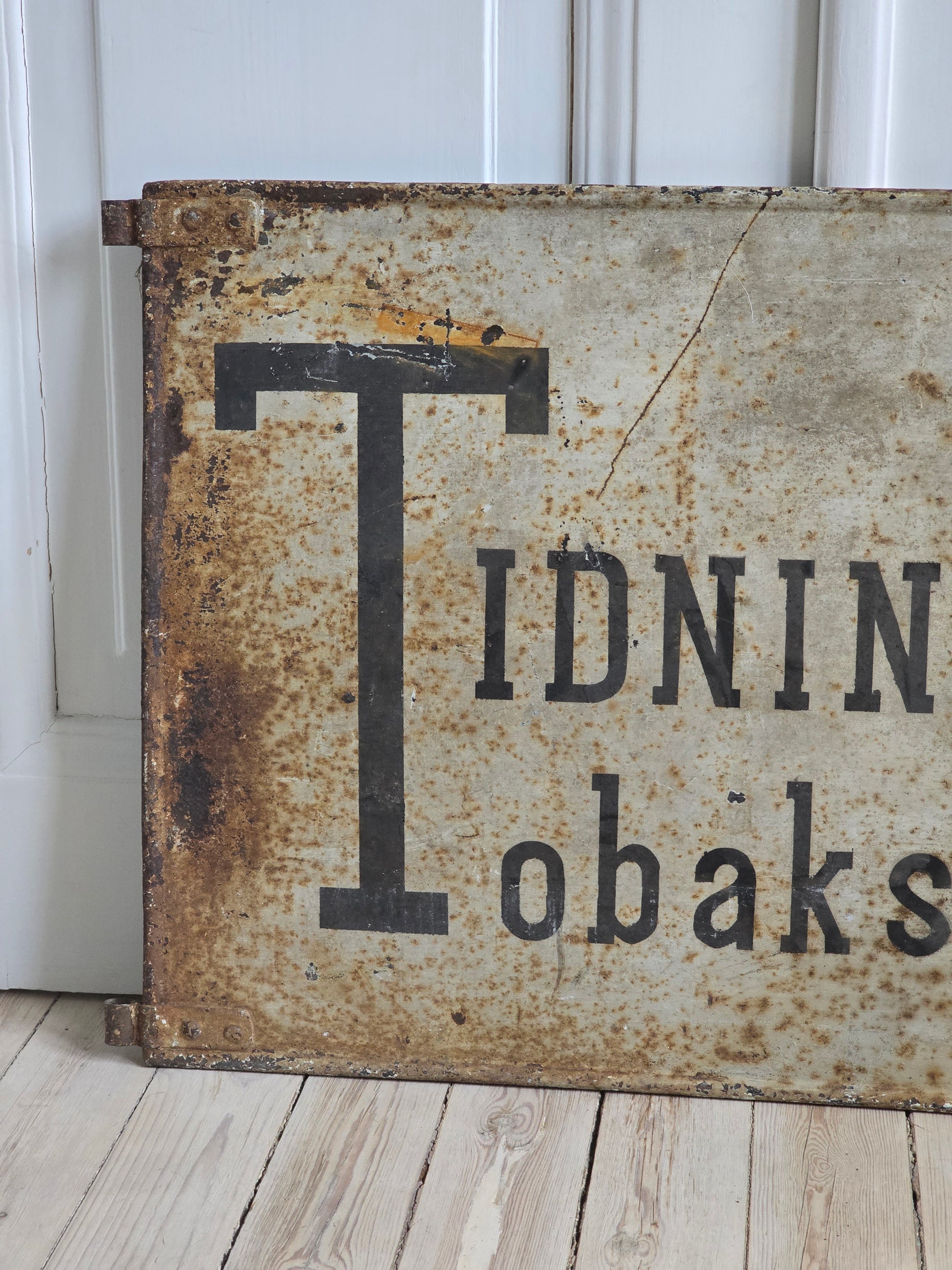 Vanha, reilusti patinoitunut, metallinen Tidningar Tobaksvaror -kyltti, jonka molemmilla puolilla on sama teksti. Tämä ruotsinkielinen kyltti on ollut sivusta kiinni kaupan ulkoseinällä.