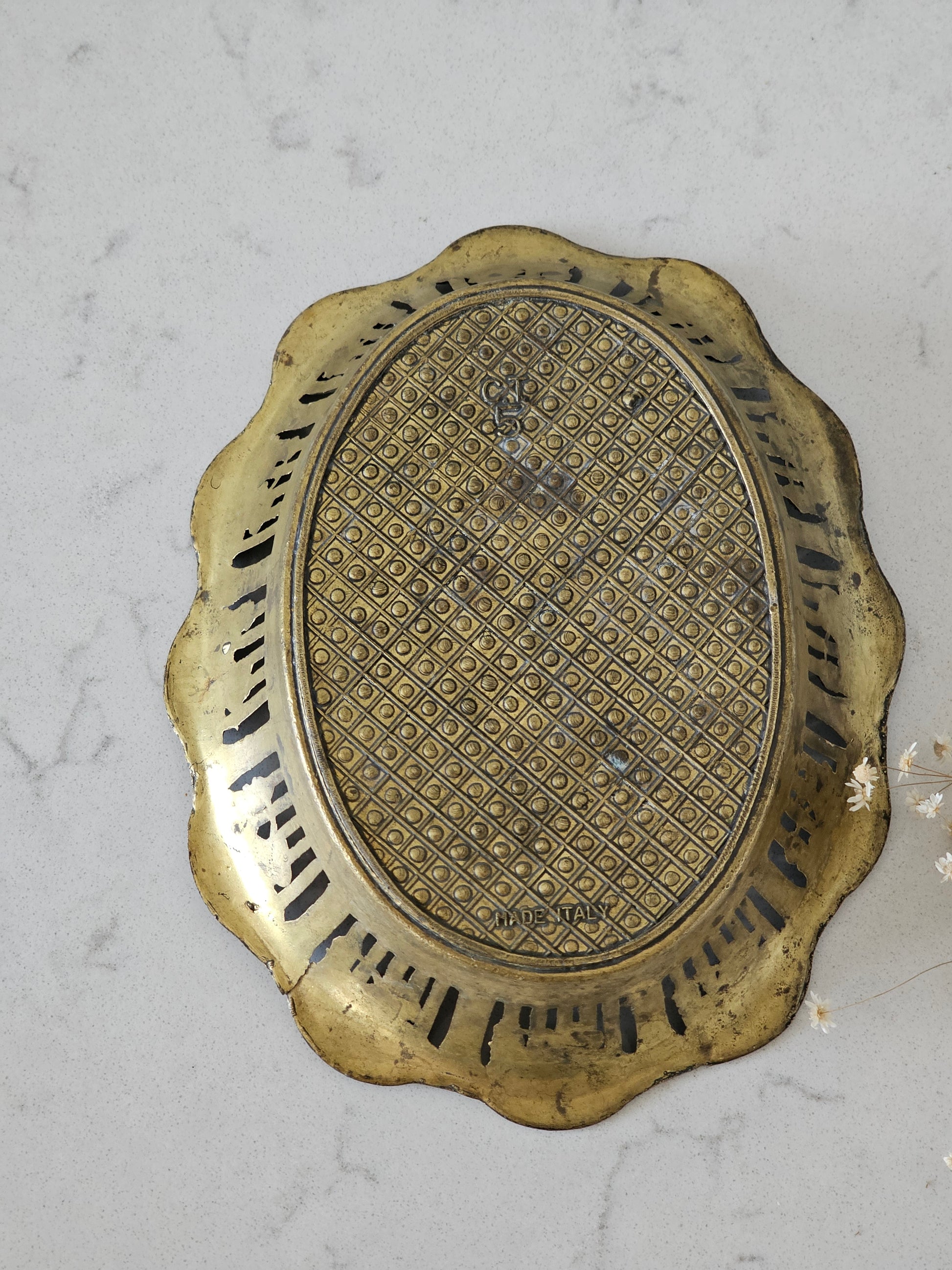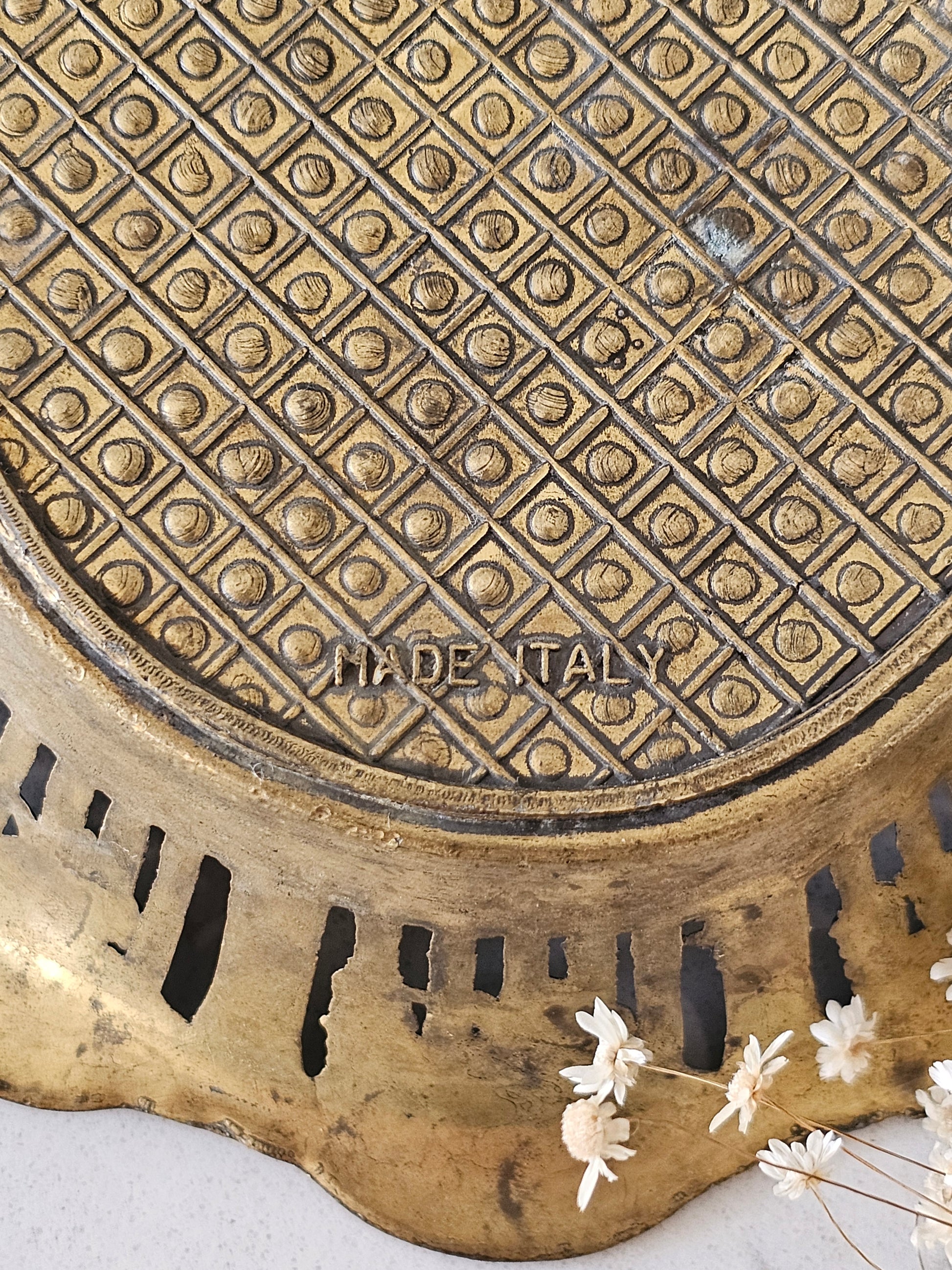 Vanha messinkiastia Italiasta, pohjassa leima "made in Italy".