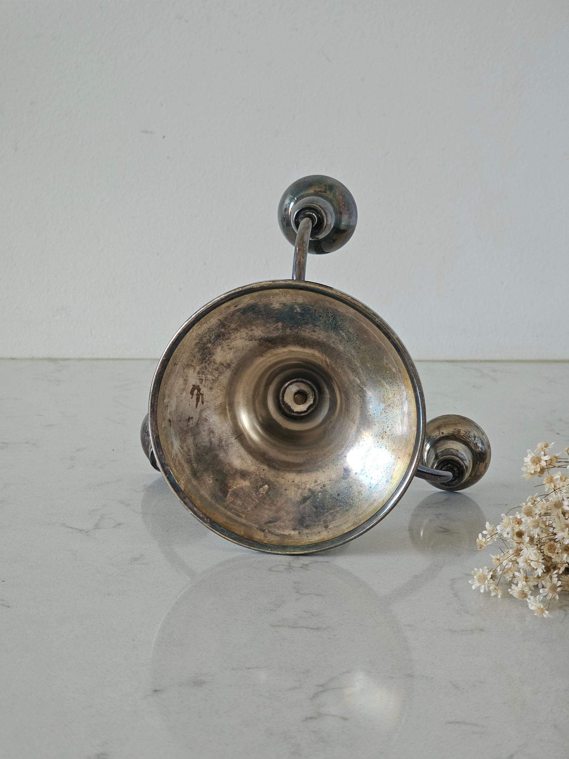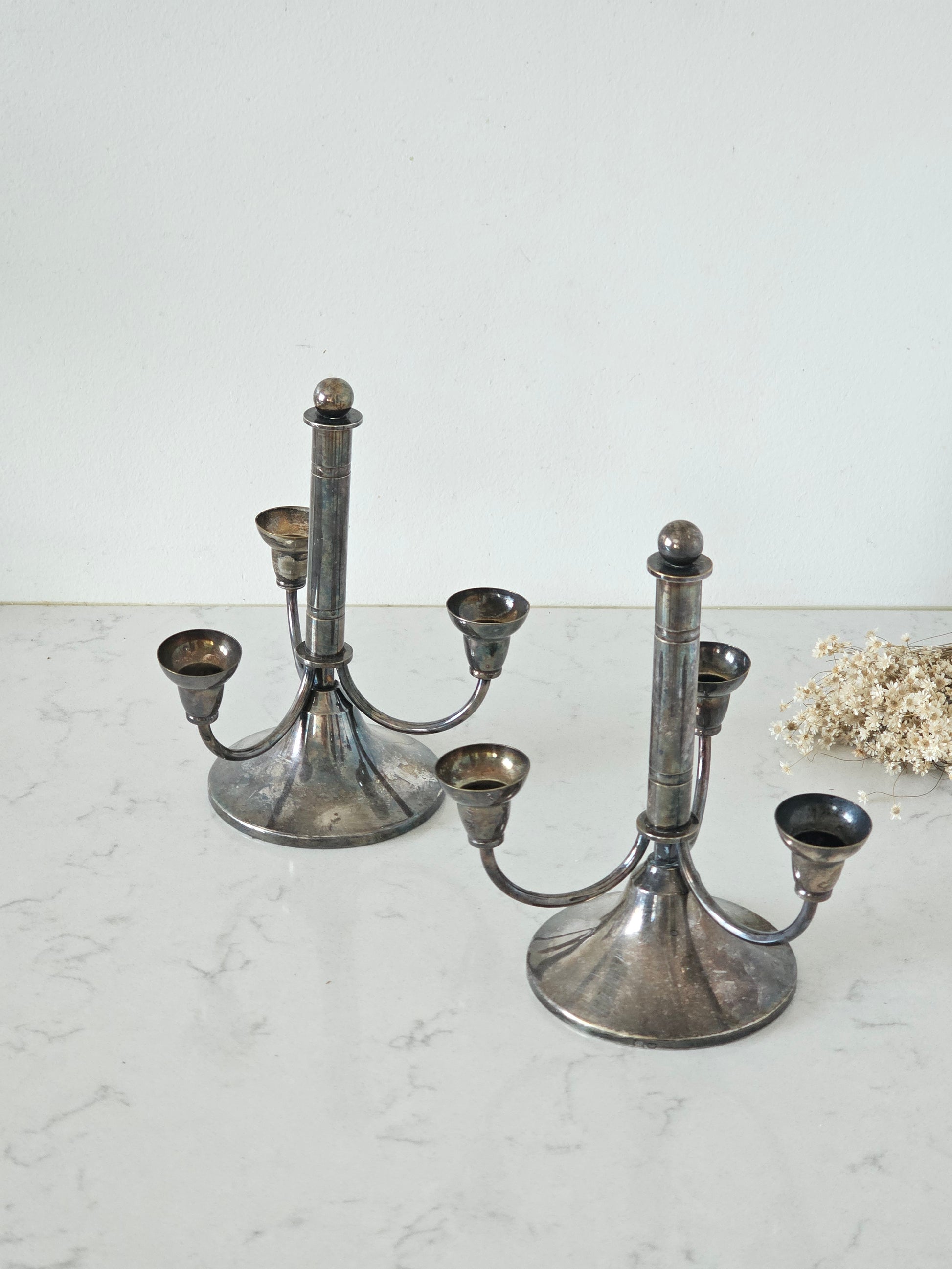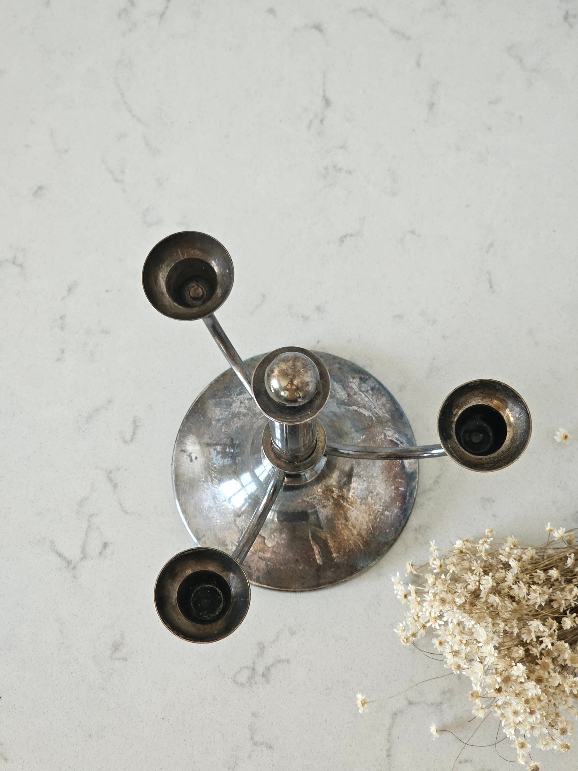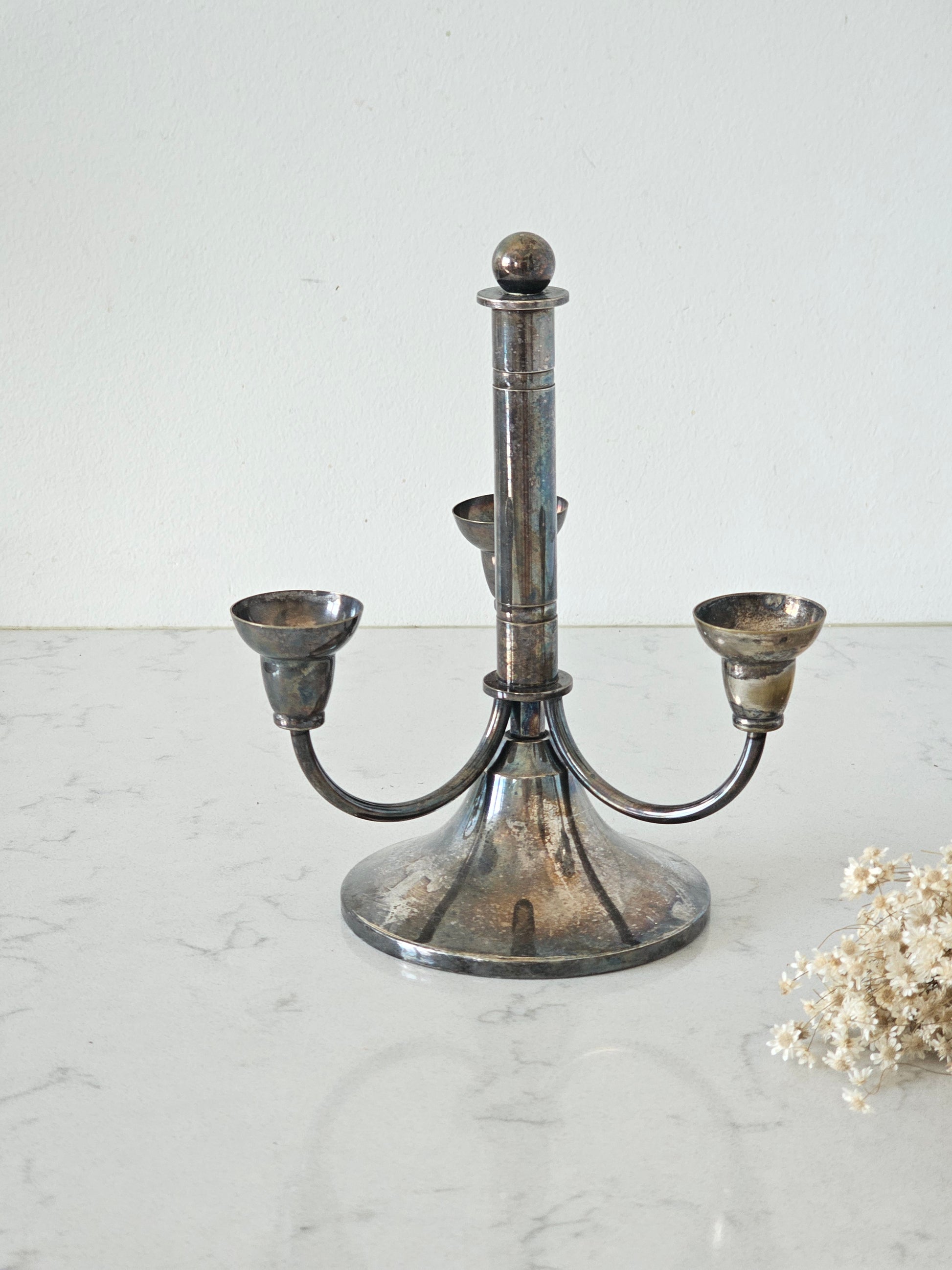 Hienosti muotoillut kyntteliköt kolmelle kynttilälle. Materiaaliltaan ne ovat alpakkaa ja melko painavat. Kaiverrus kertoo kynttelikön olevan 1930-luvulta.