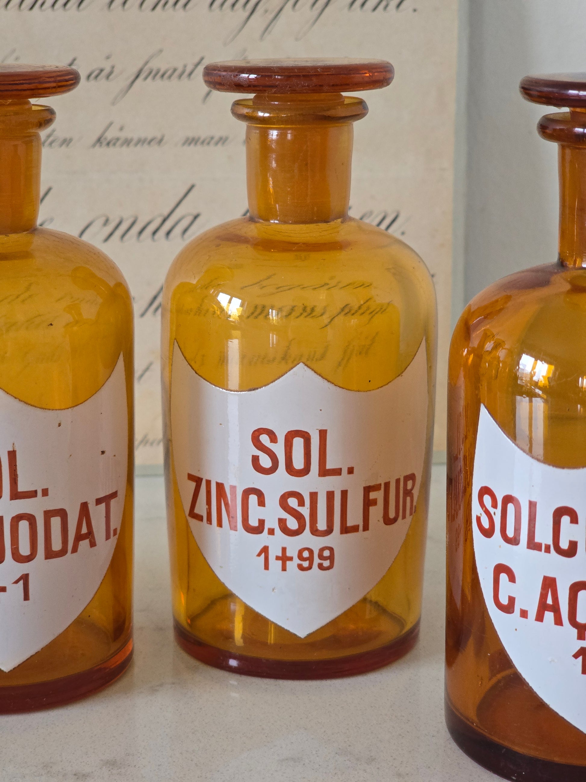 Kauniit vanhat apteekkipullot sisustuksen yksityiskohdaksi. Pulloissa on lasiset korkit ja etiketit hienossa kunnossa. Sol cod phosph c.aq.destill. -pullon korkki ei irtoa. Muissa pulloissa korkki on irrotettavissa. Pullot myydään erikseen eli hinta on kappaleelle.