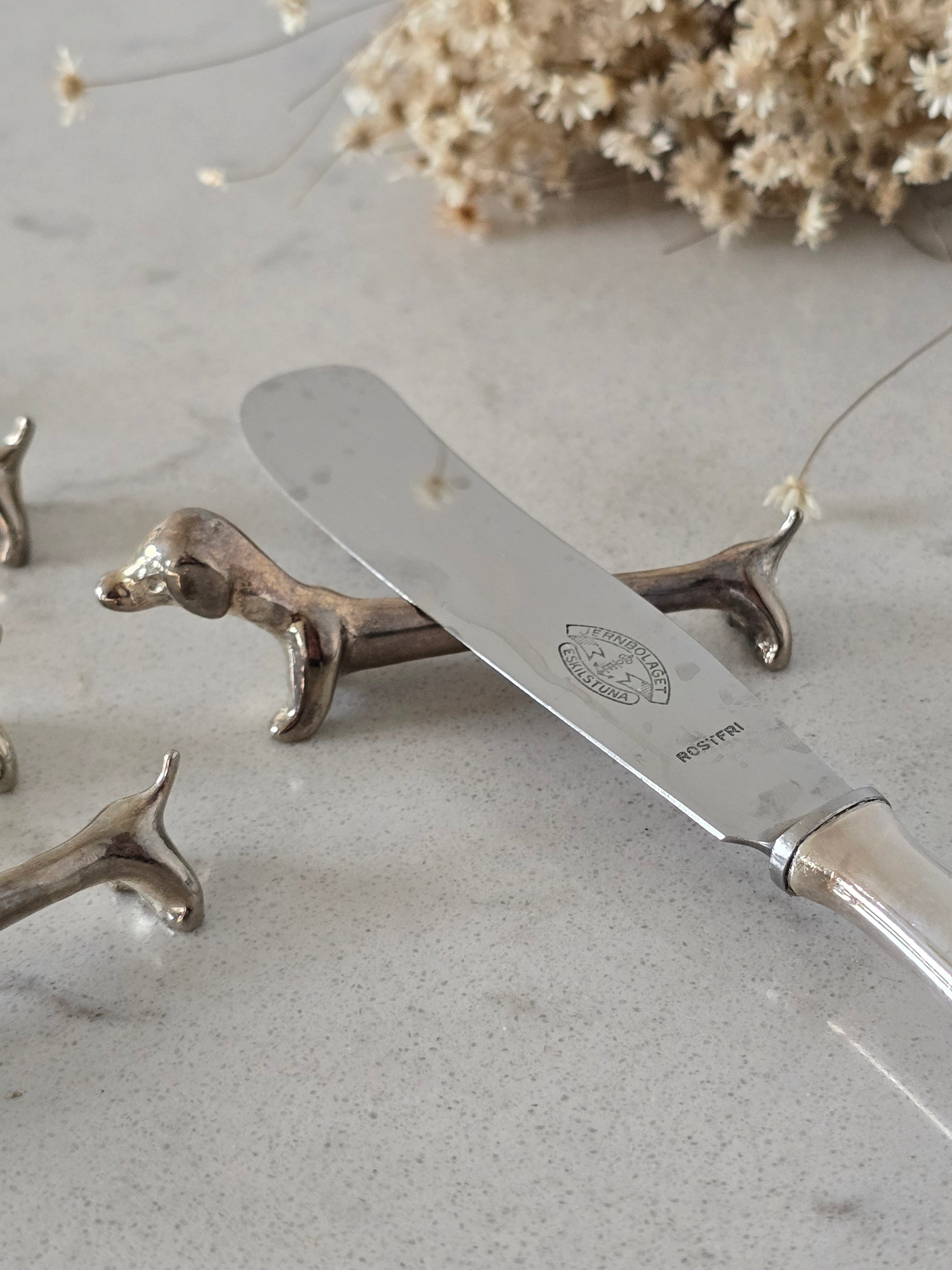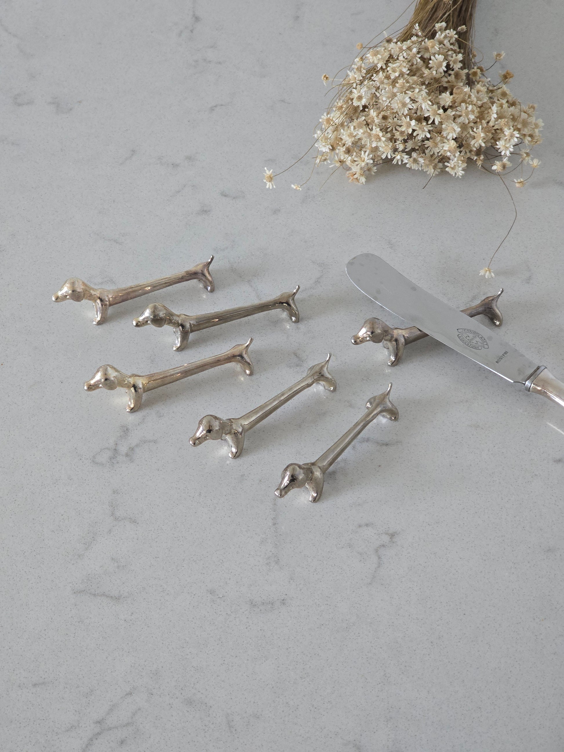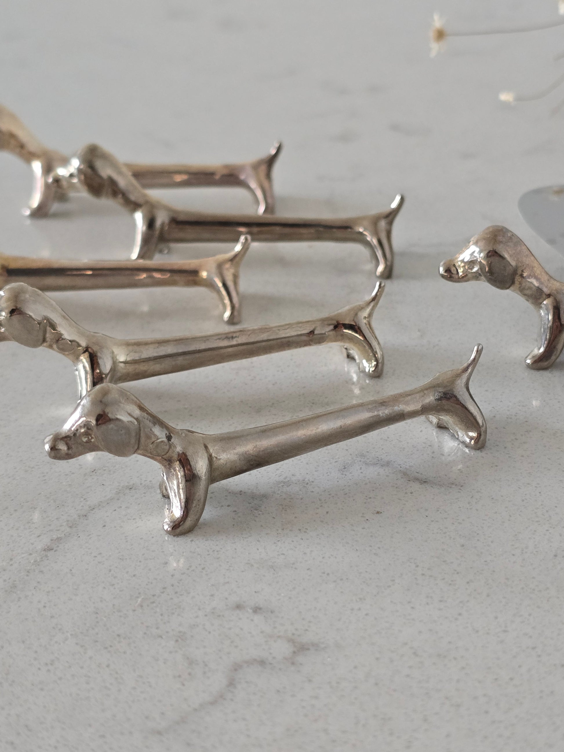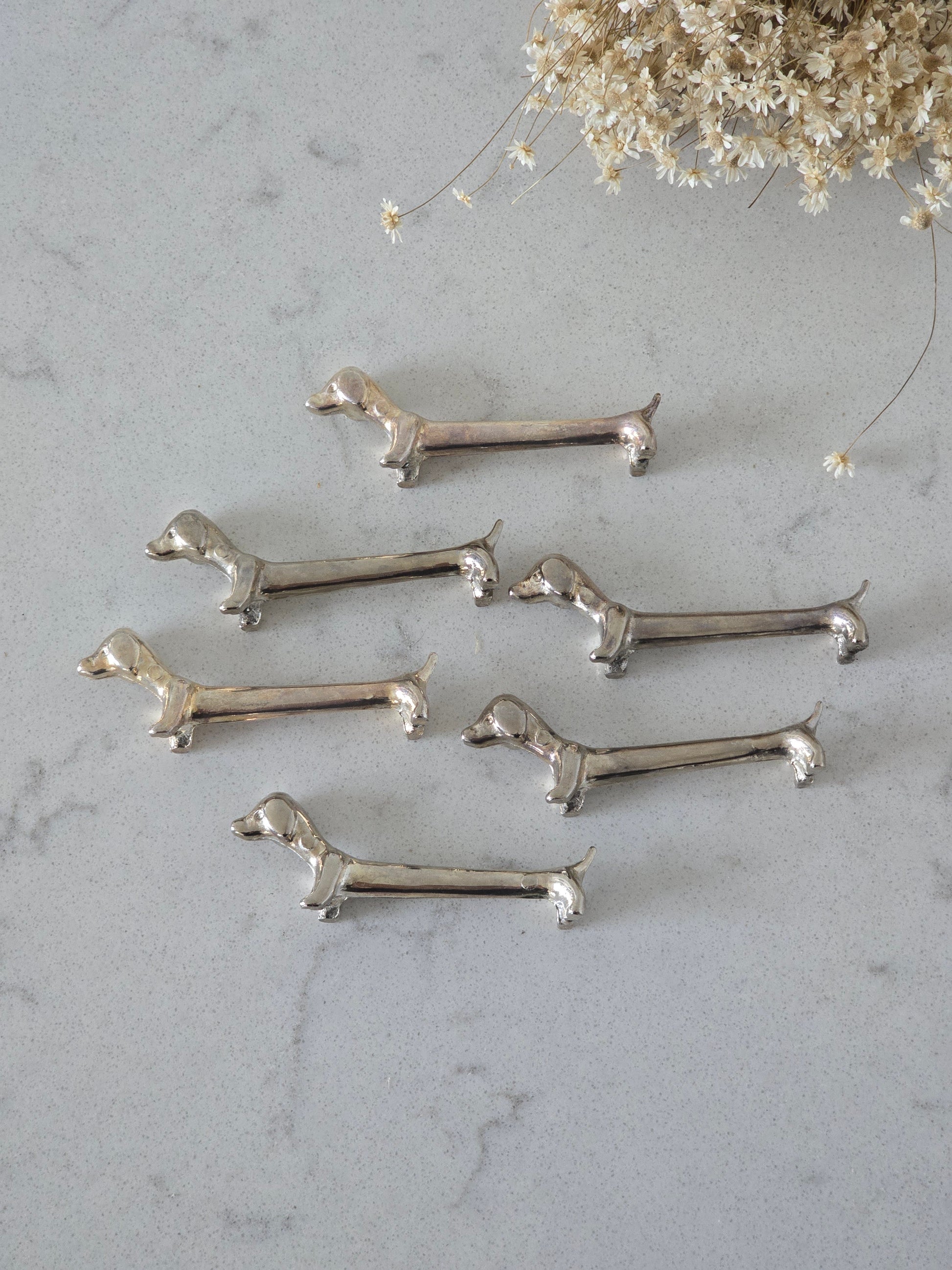 Metalliset mäyräkoira-aterinlepuuttajat. Metallipinta on kauniisti patinoitunut. Nämä täysin ehjät mäyrikset myydään erikseen eli hinta on kappaleelle. Lahjaidea mäyräkoiran omistajalle!