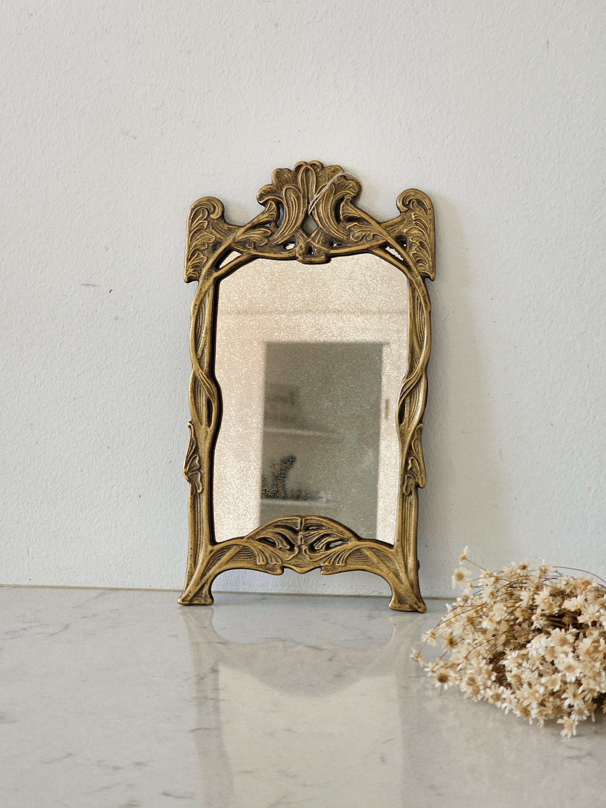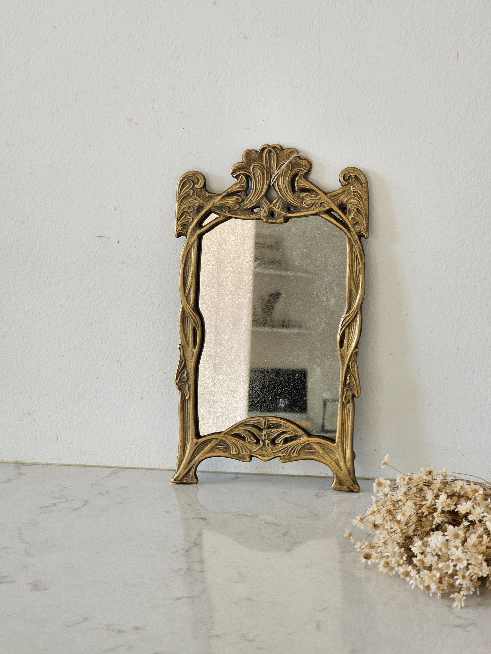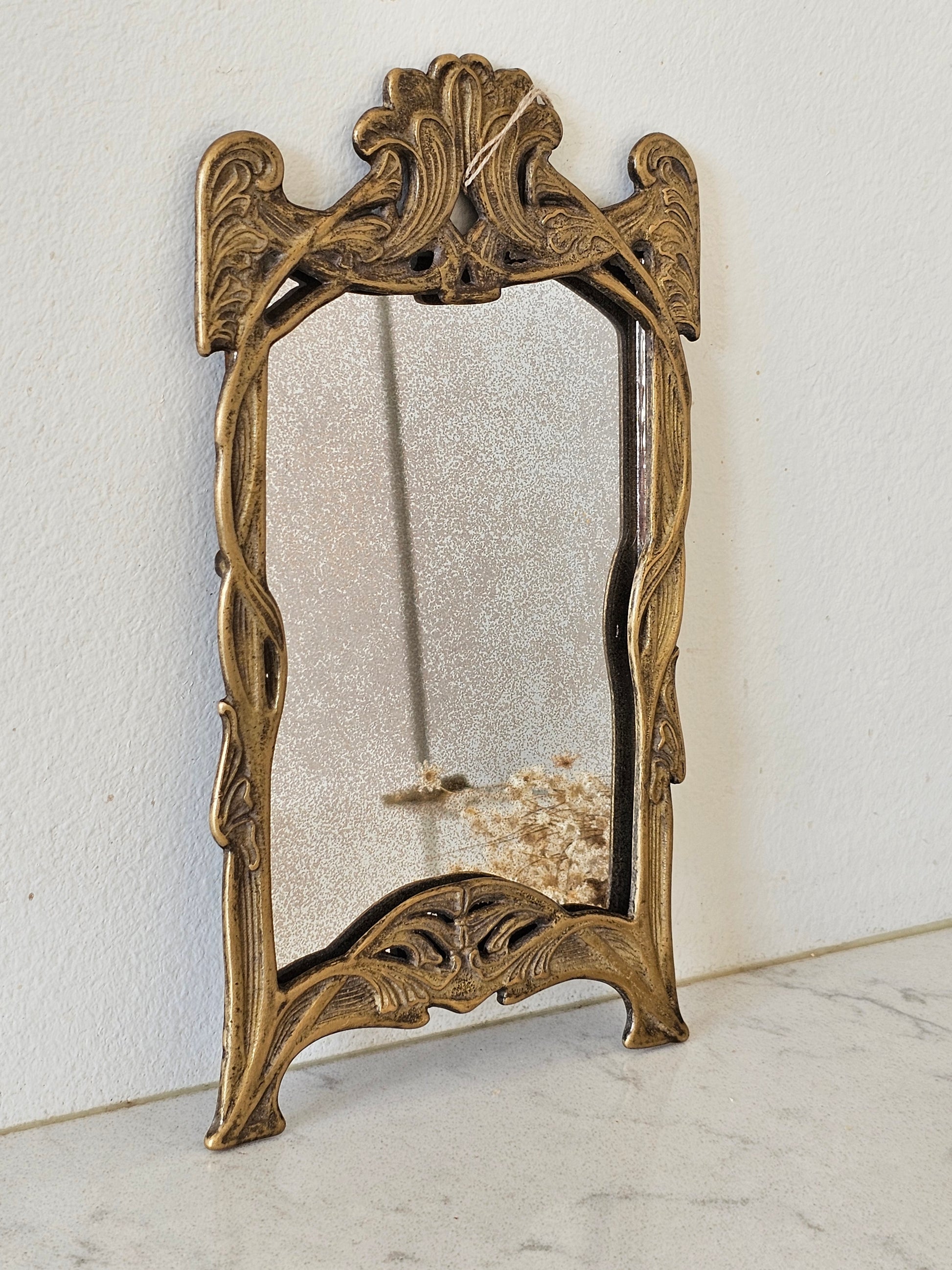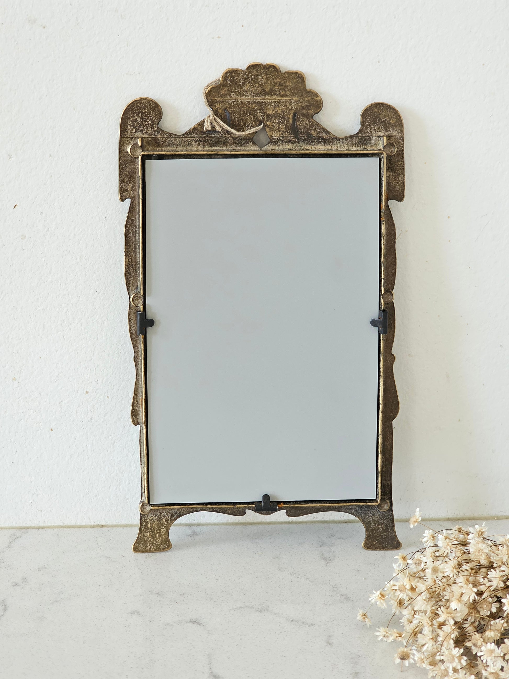Messinkinen peili. Peililasi on krakeloitunut sopivasti. Peilin saa narulla seinälle roikkumaan tai nojaamaan seinää vasten.