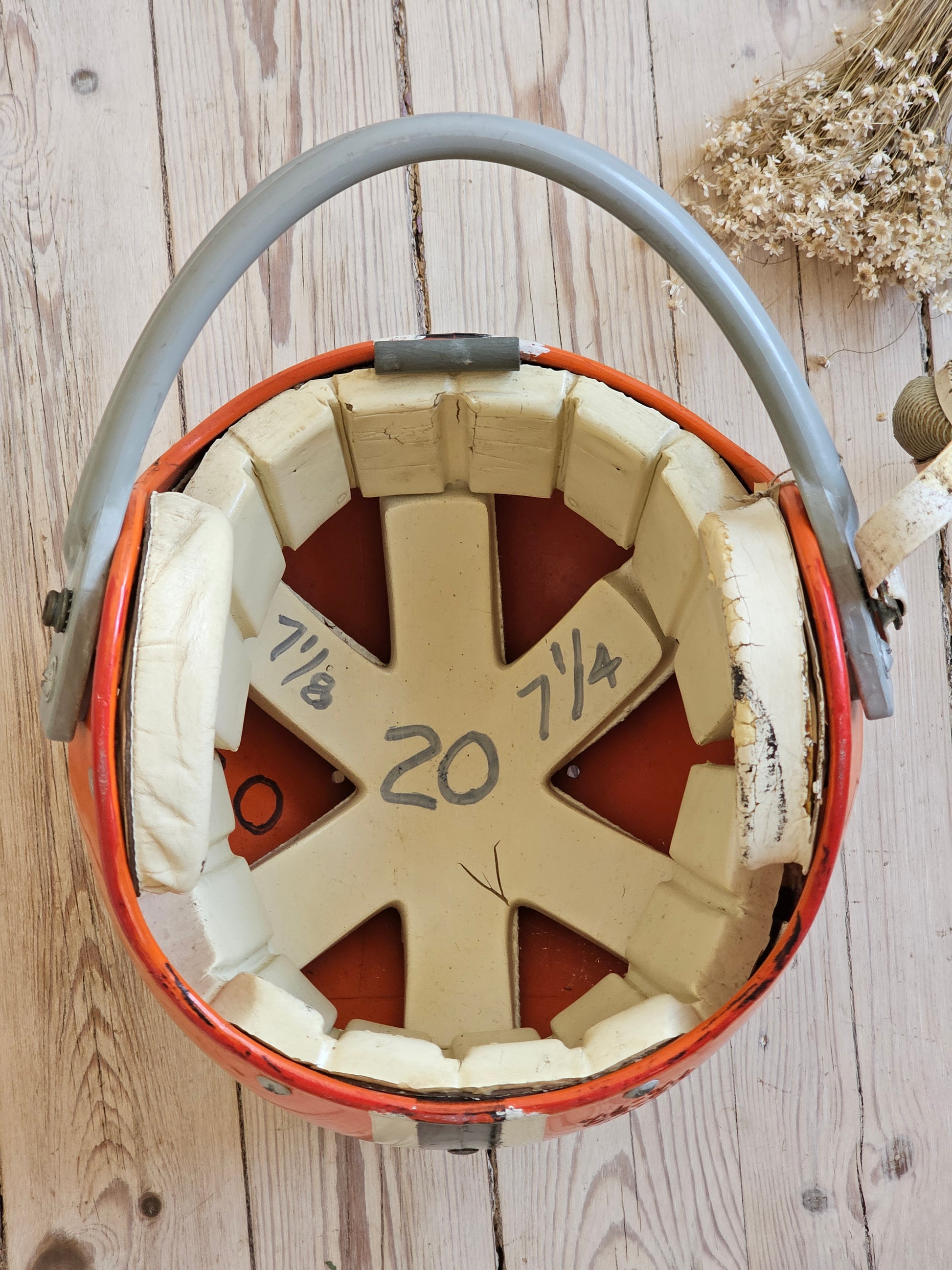 Amerikkalainen jalkapallokypärä Cleveland Brownsin väreissä. Kypärä on 1960-luvulta.