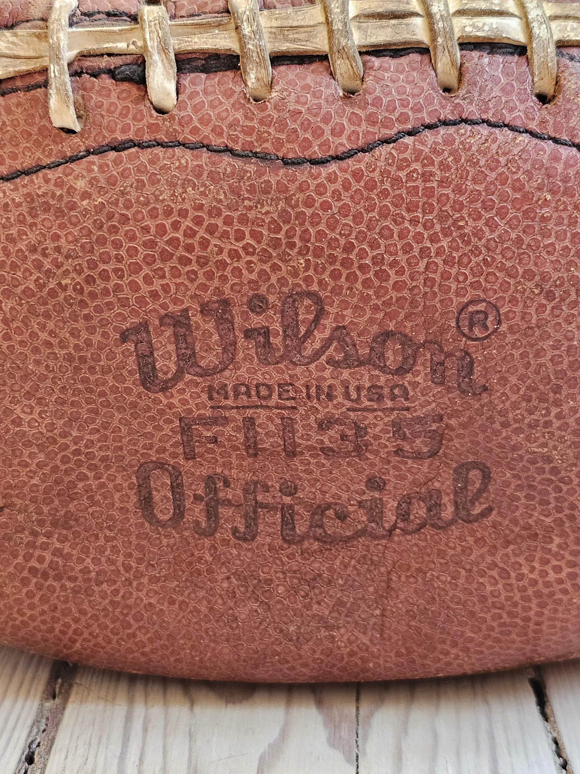 Nahkainen Wilson amerikkalainen jalkapallo Gale Sayersin signeerauksella. Pallo on selvityksen mukaan 1960-luvulta.