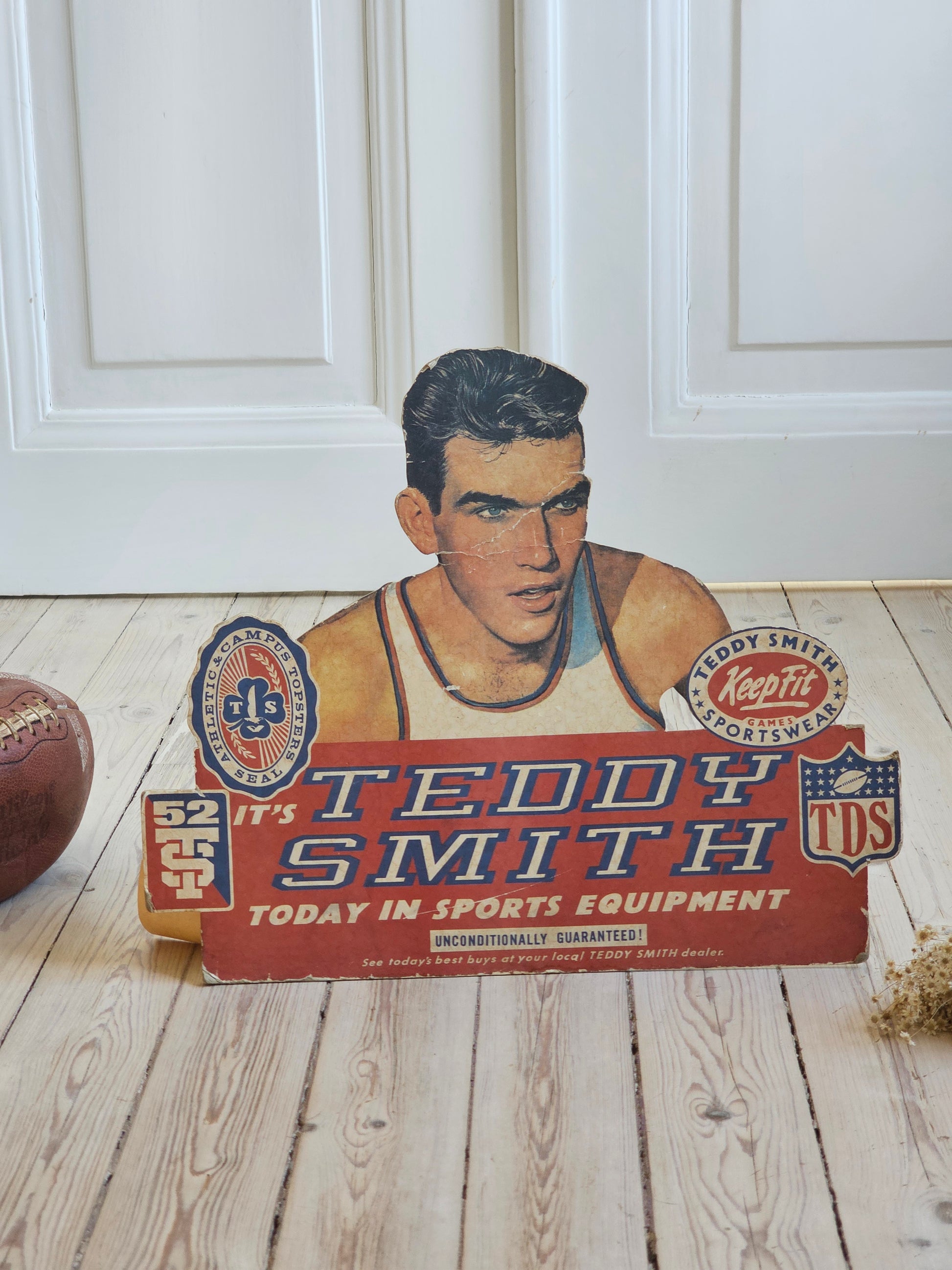 Hieno pahvinen urheilukaupan Teddy Smith -mainos. Mainoksen saa pystyyn takana olevan jalan varaan. Sävy ja patina on jotain mielettömän hienoa. Todella harvinainen NFL-aiheinen mainos, jota Suomessa tuskin koskaan tulee vastaan.