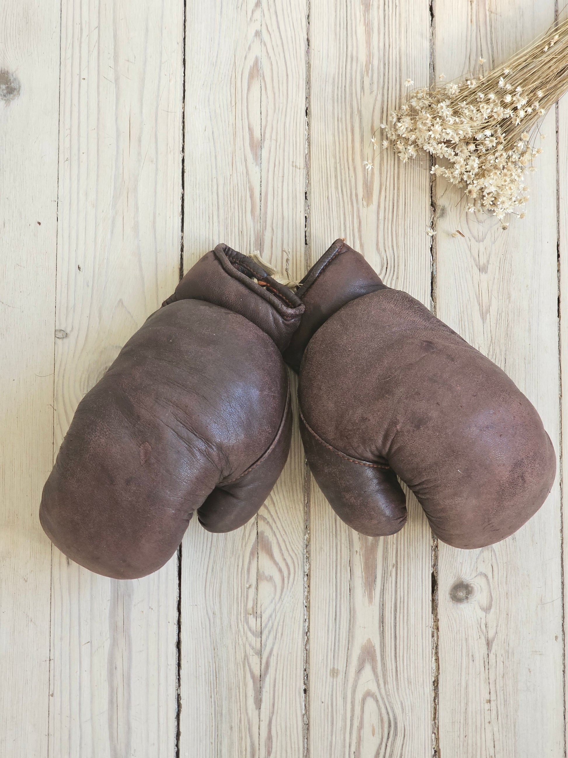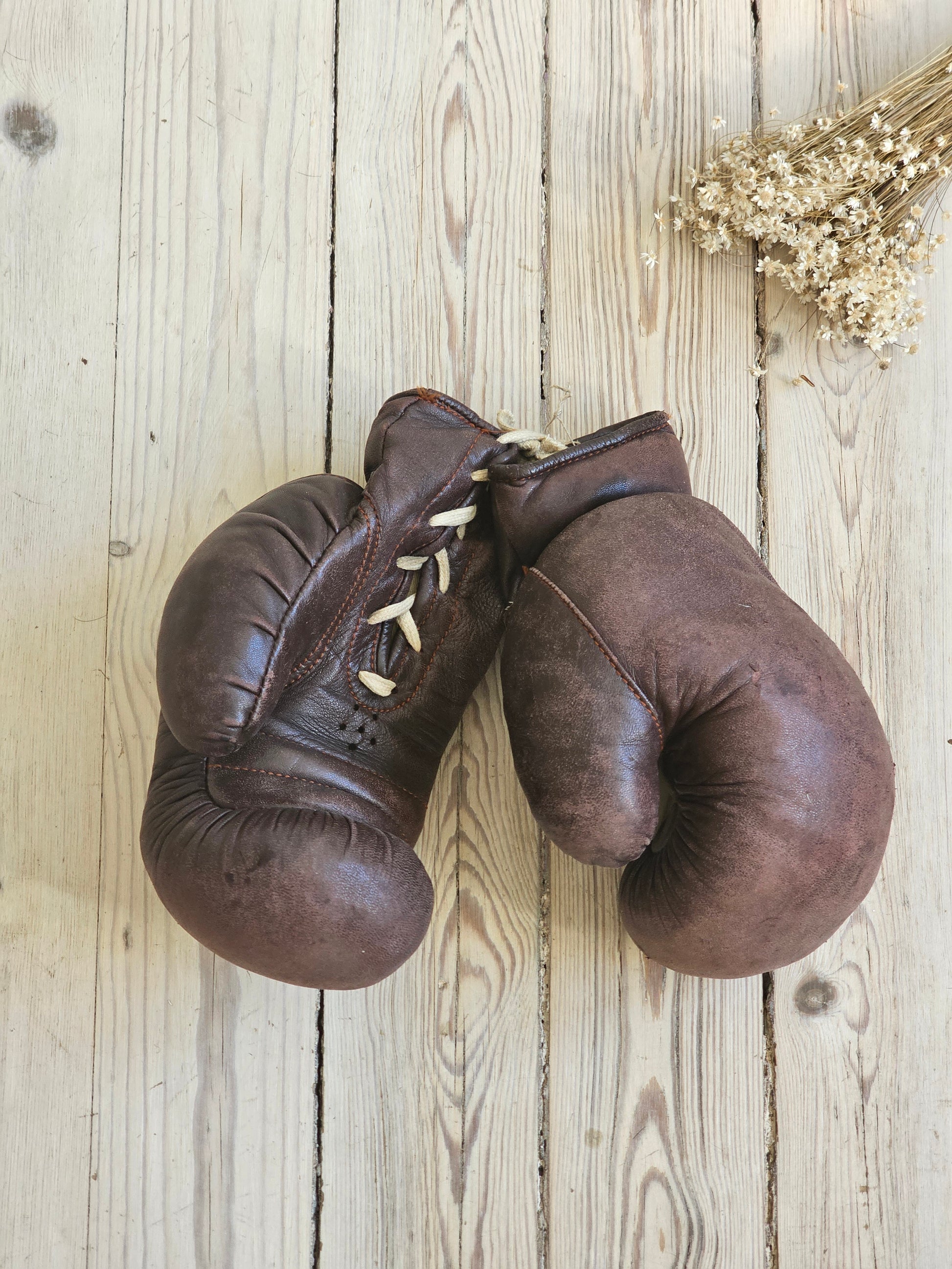 Upeat hyväkuntoiset nahkaiset nyrkkeilyhanskat. Ikäisekseen hanskat ovat hyväkuntoiset ja ruskea nahka on ajanpatinoima.
