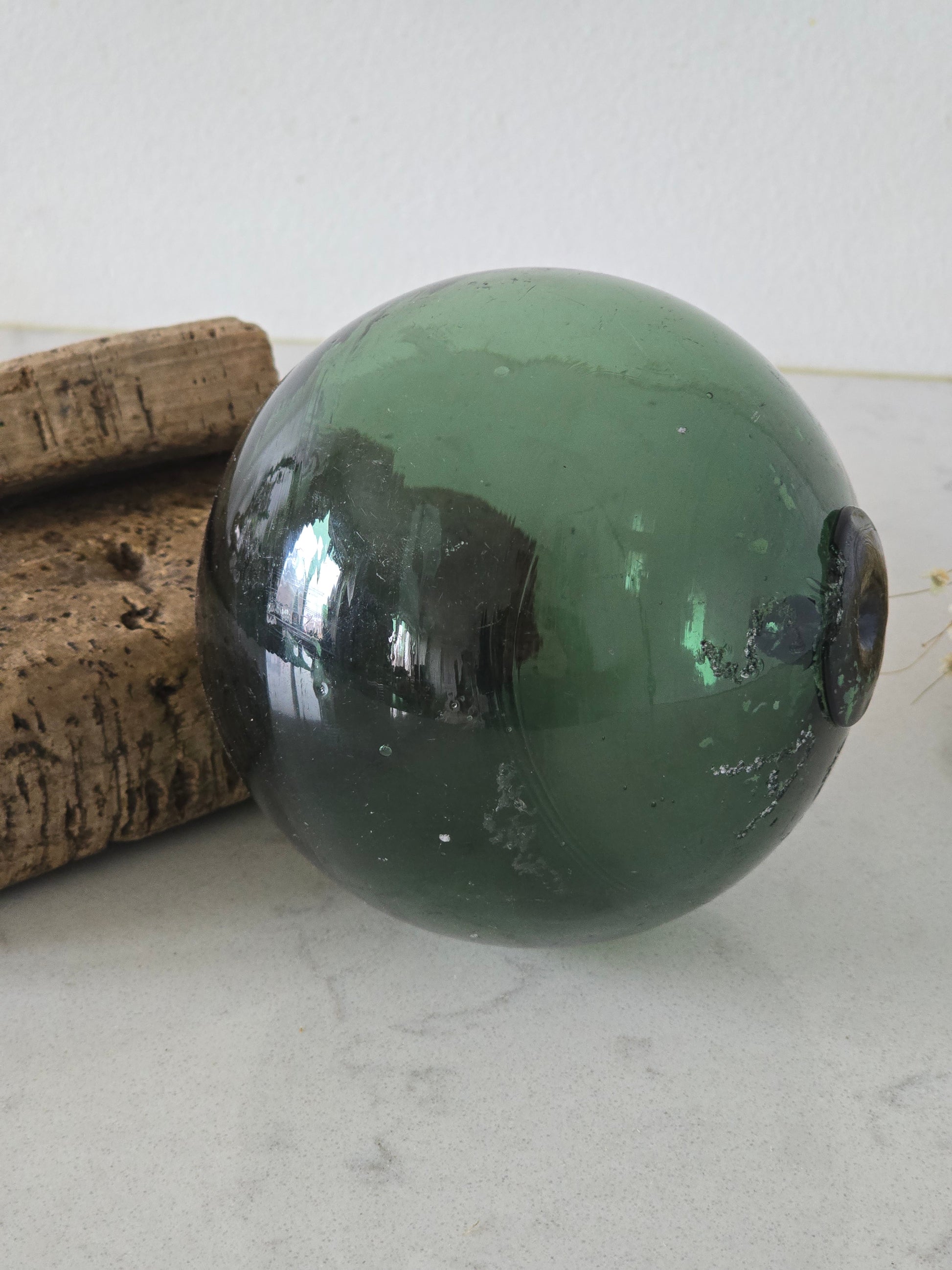 Tässä vanhassa kalastussetissä on upea vihreä lasikoho ja kaksi korkki-verkonmerkkiä.