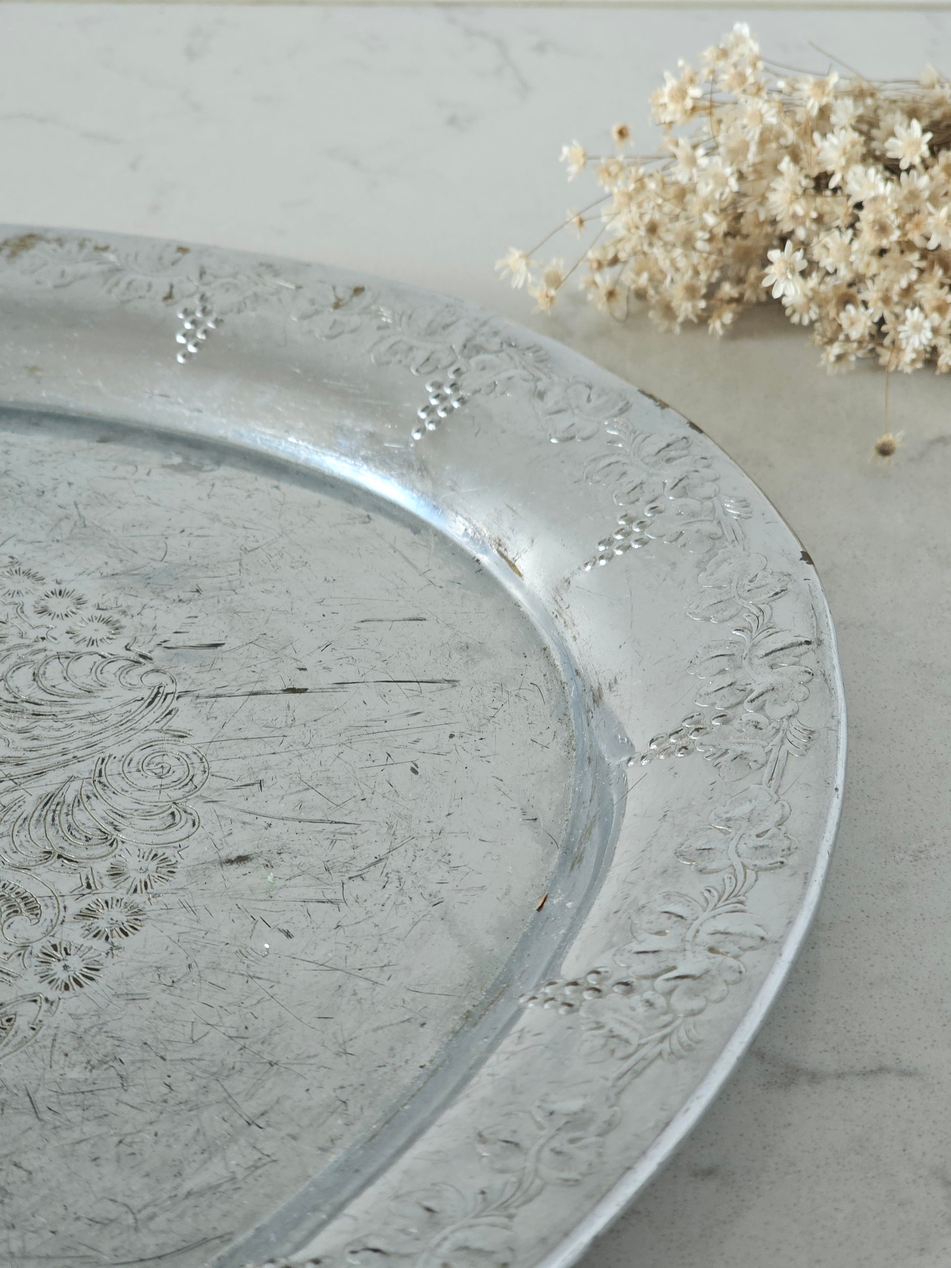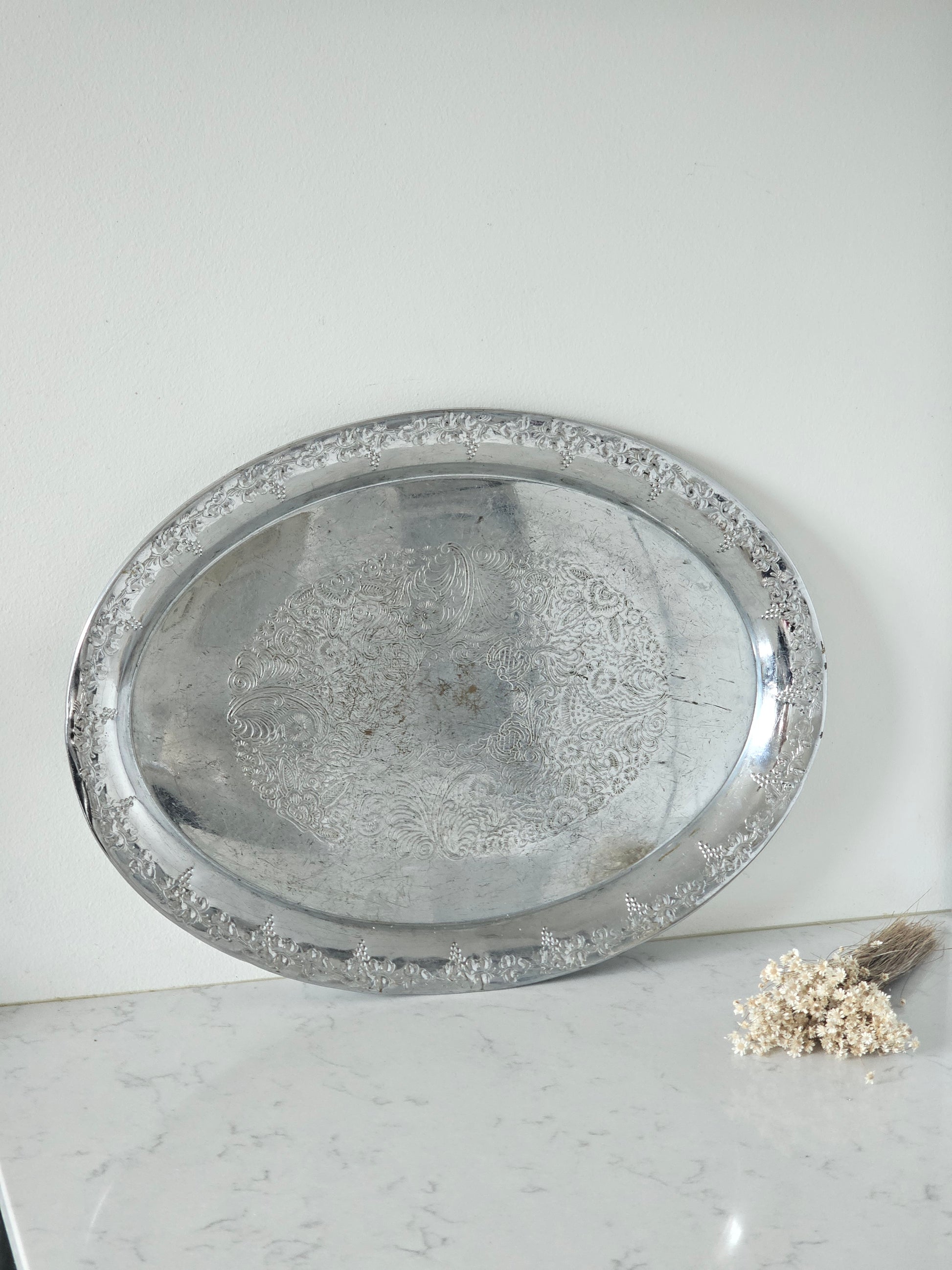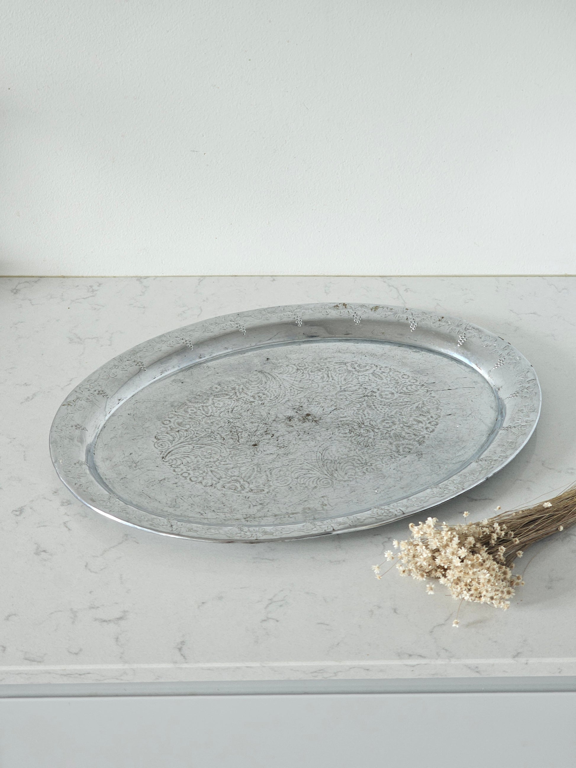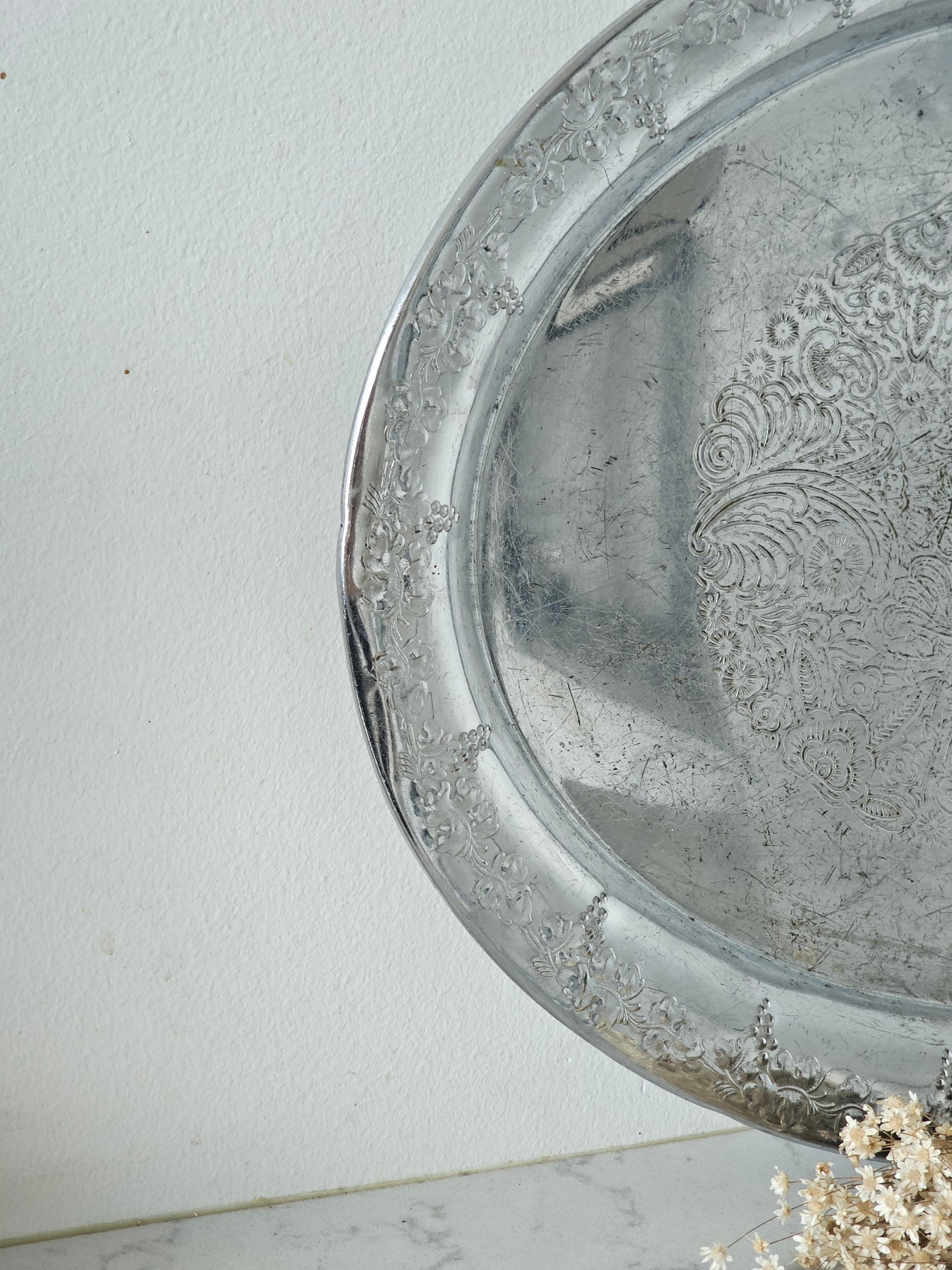 Kaunis soikeanmallinen metallitarjotin. Sen reunoissa hienot yksityiskohdat ja pinta on ajan patinoima. Rosoa löytyy sitä rakastavalle.