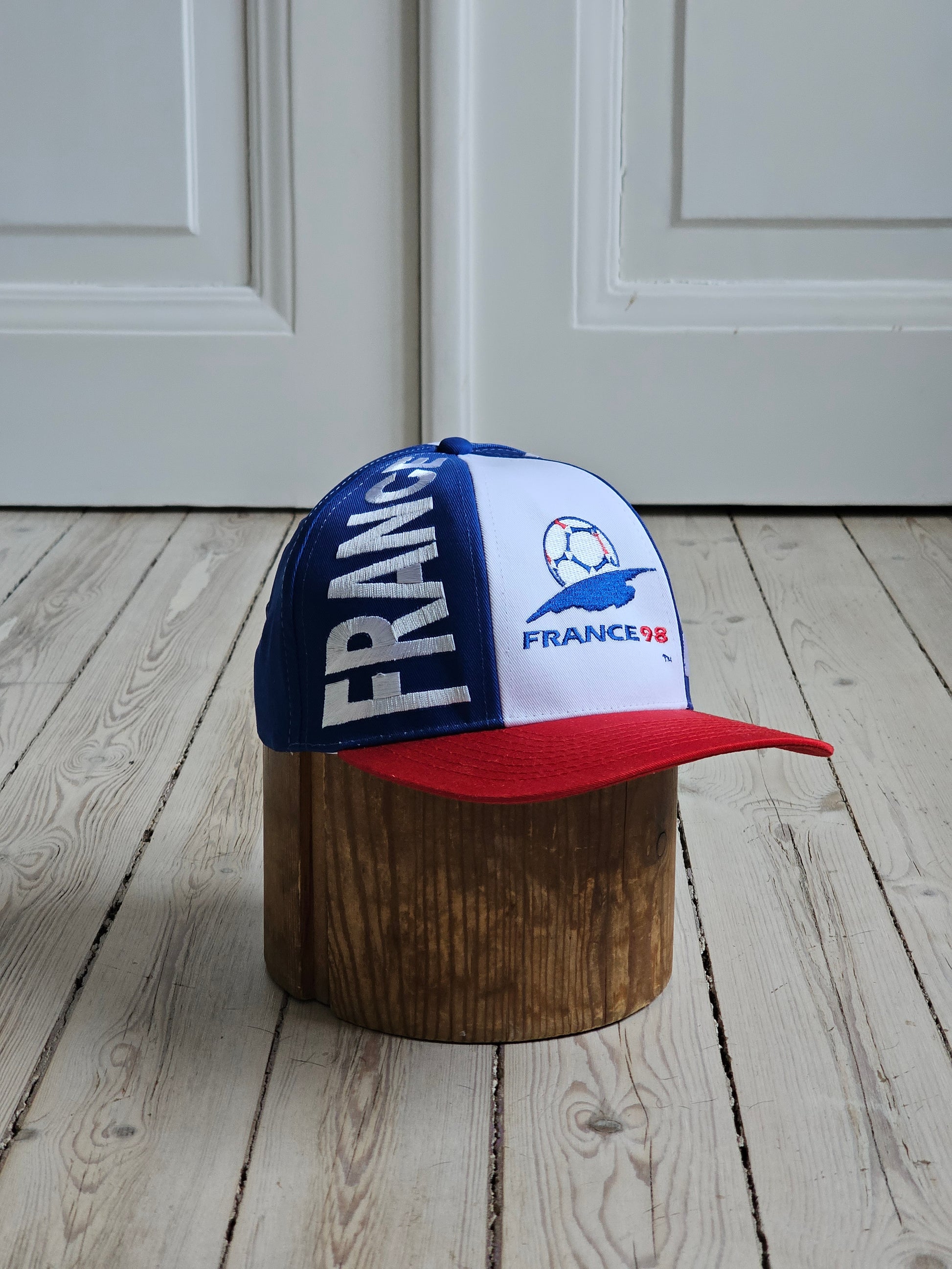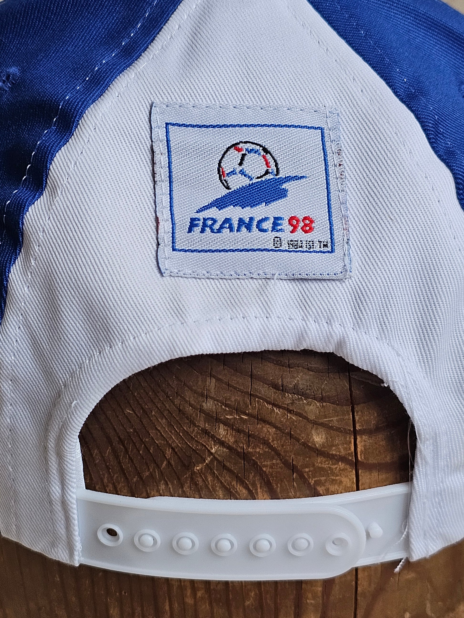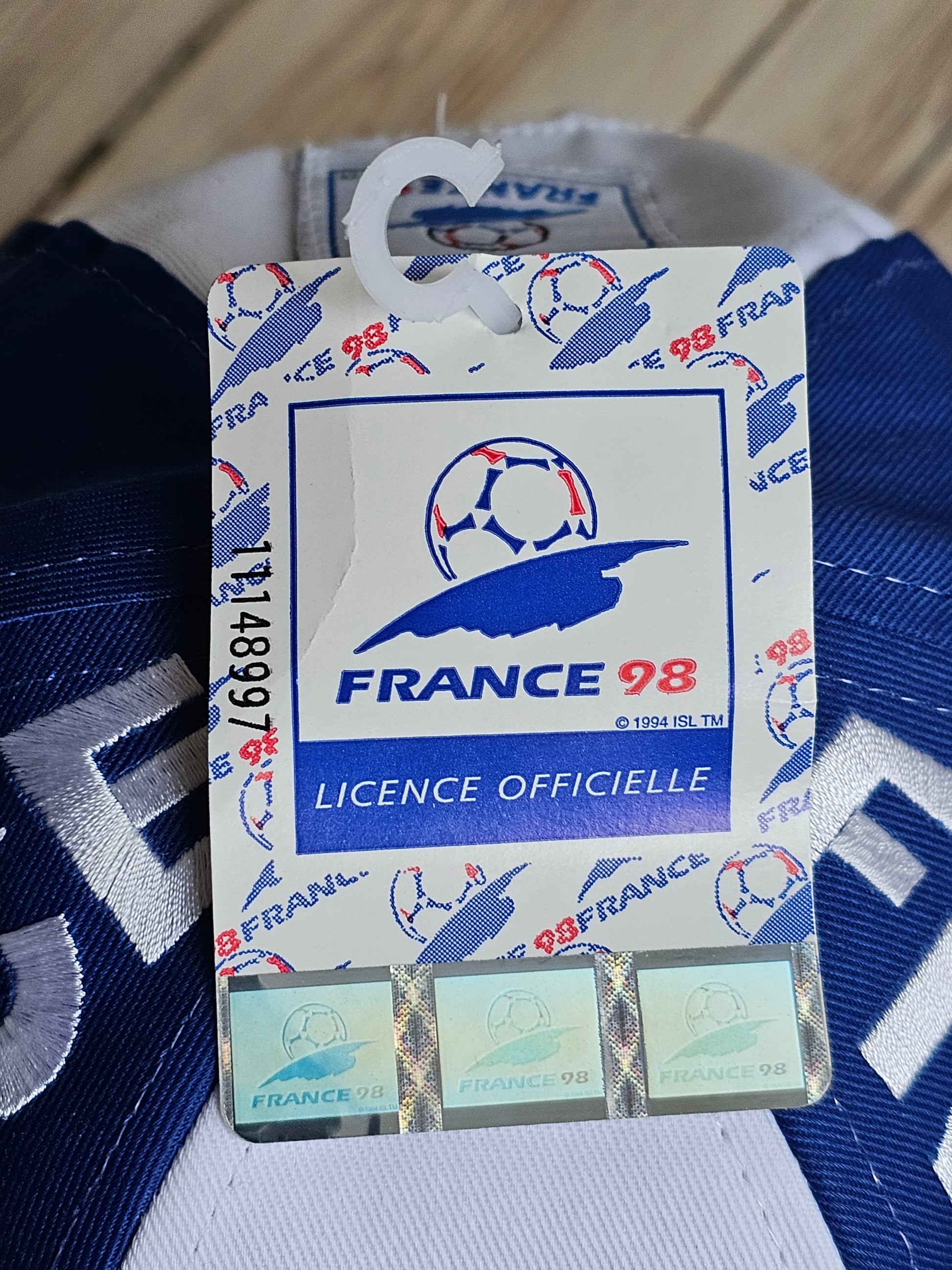 Aito käyttämätön Ranskan jalkapallon MM-kisojen lippis vuodelta 1998. Lippiksessä on vielä valmistajan laput tallella!
