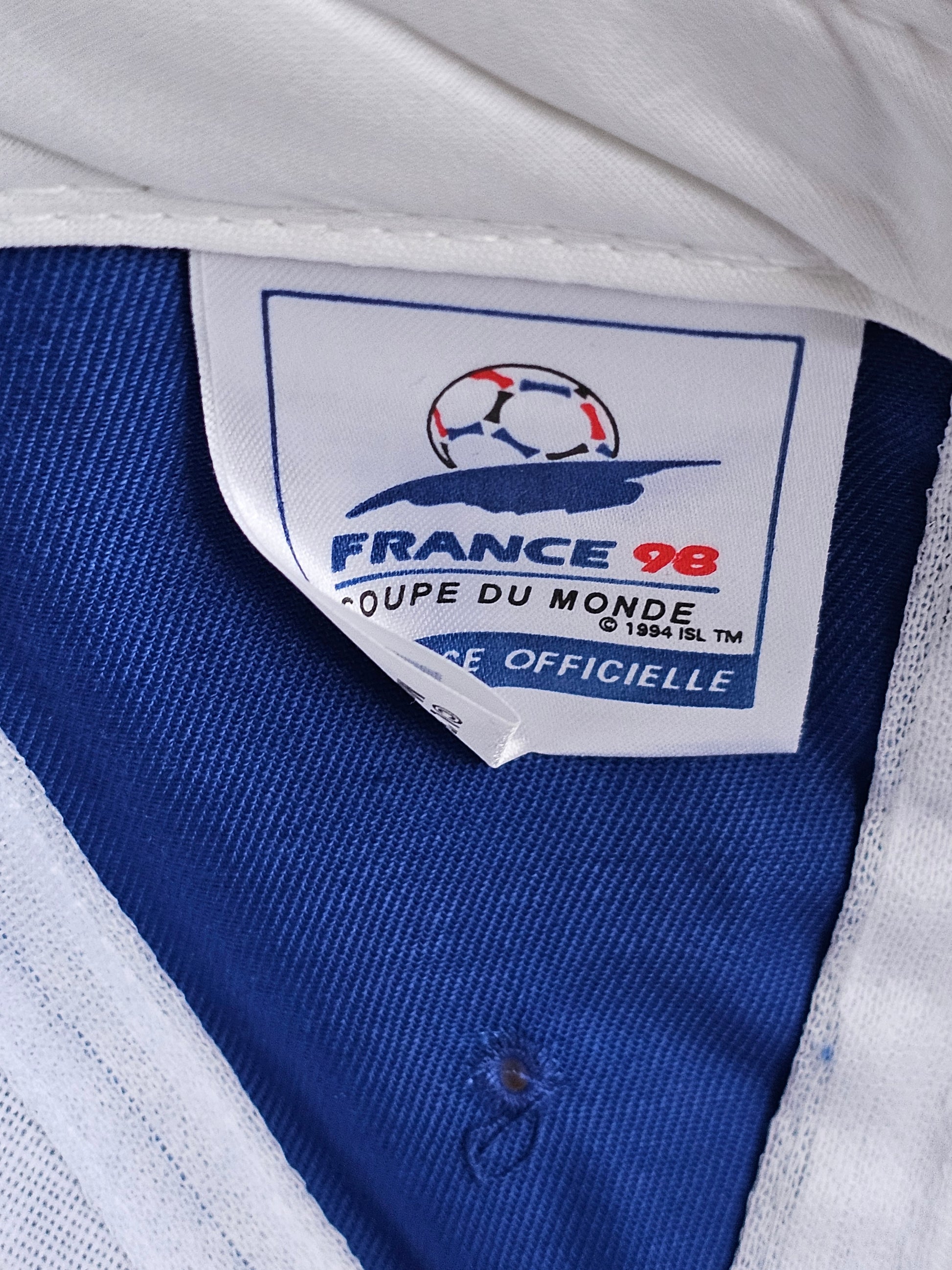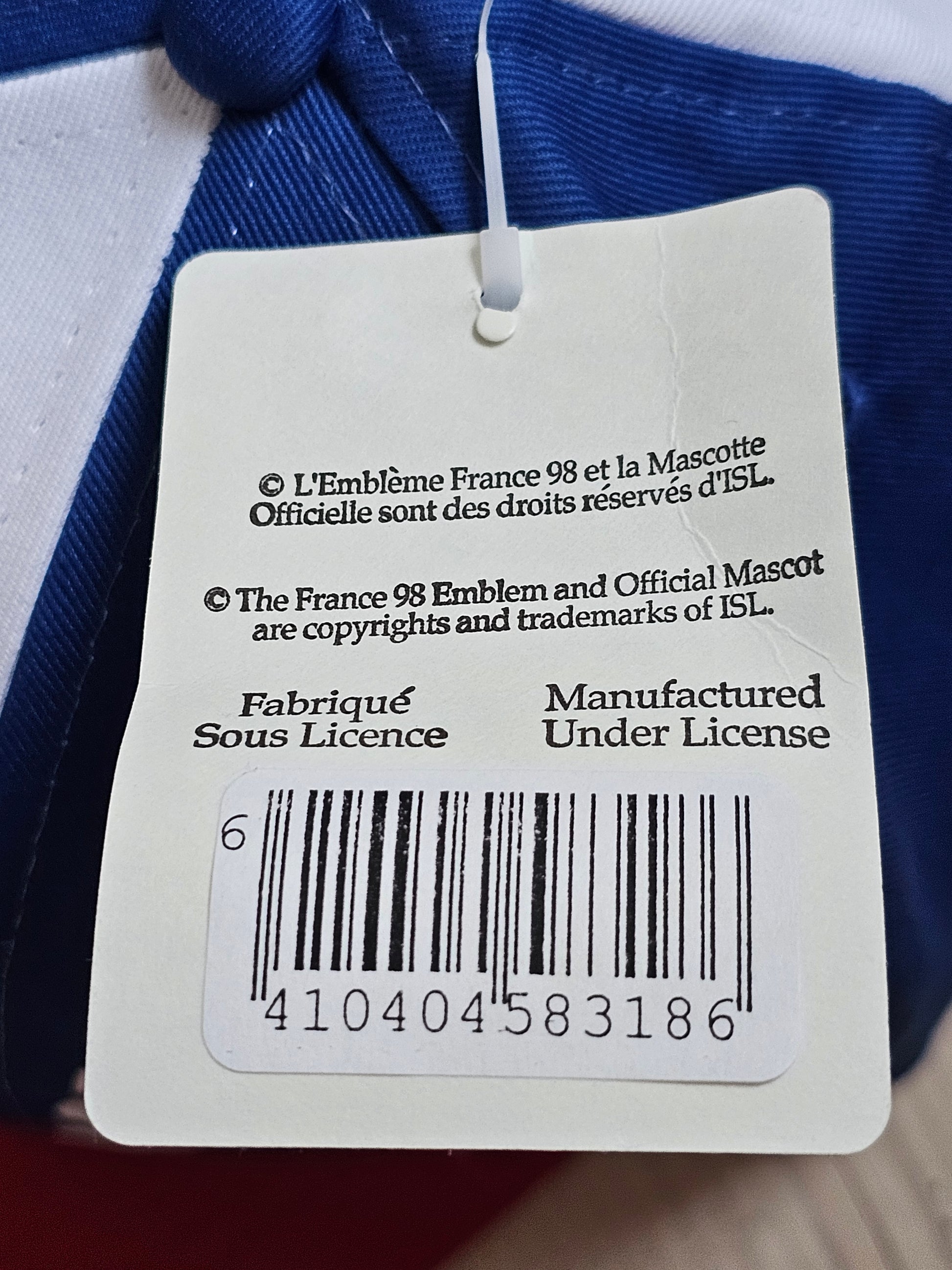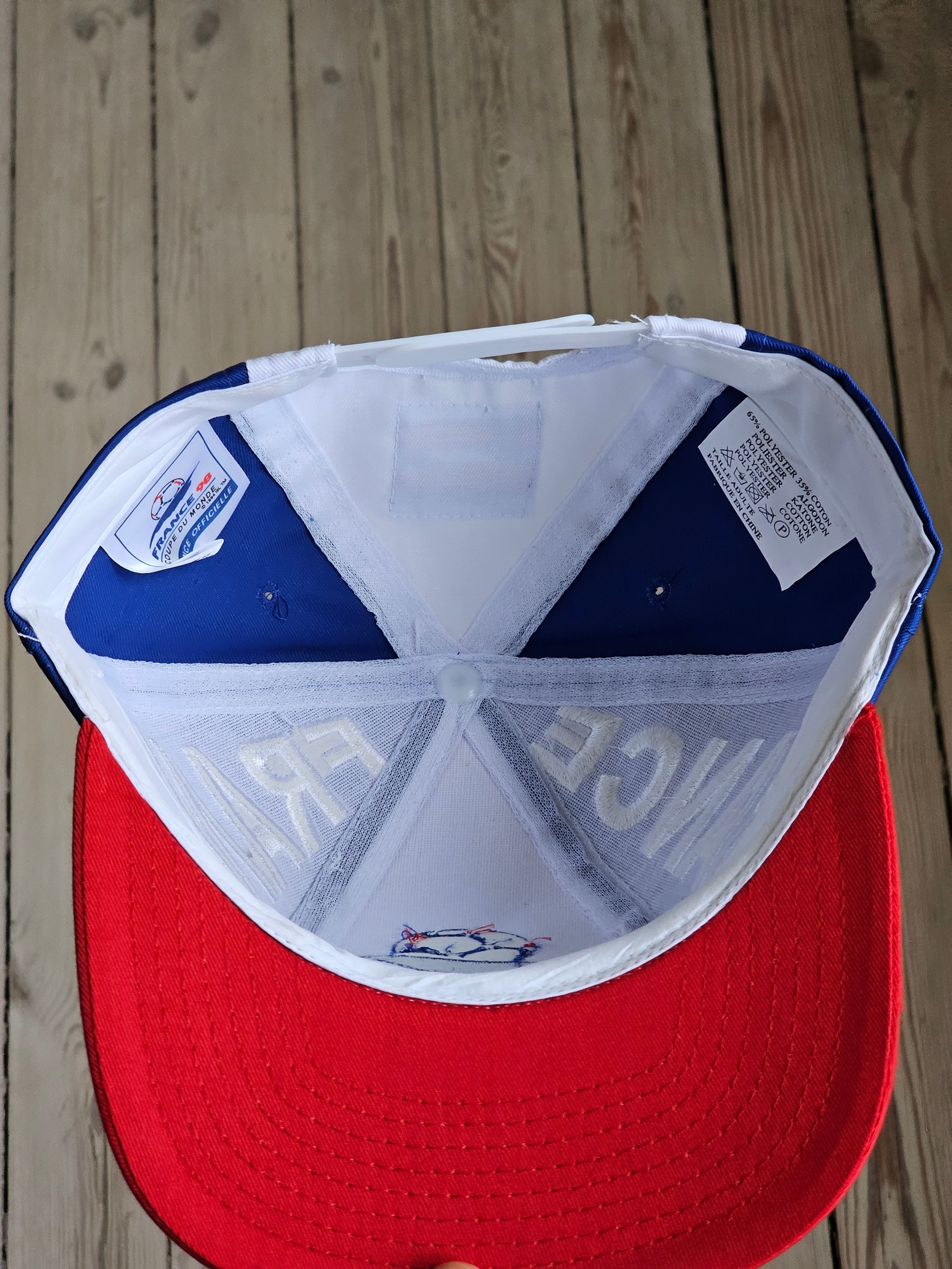 Aito käyttämätön Ranskan jalkapallon MM-kisojen lippis vuodelta 1998. Lippiksessä on vielä valmistajan laput tallella!