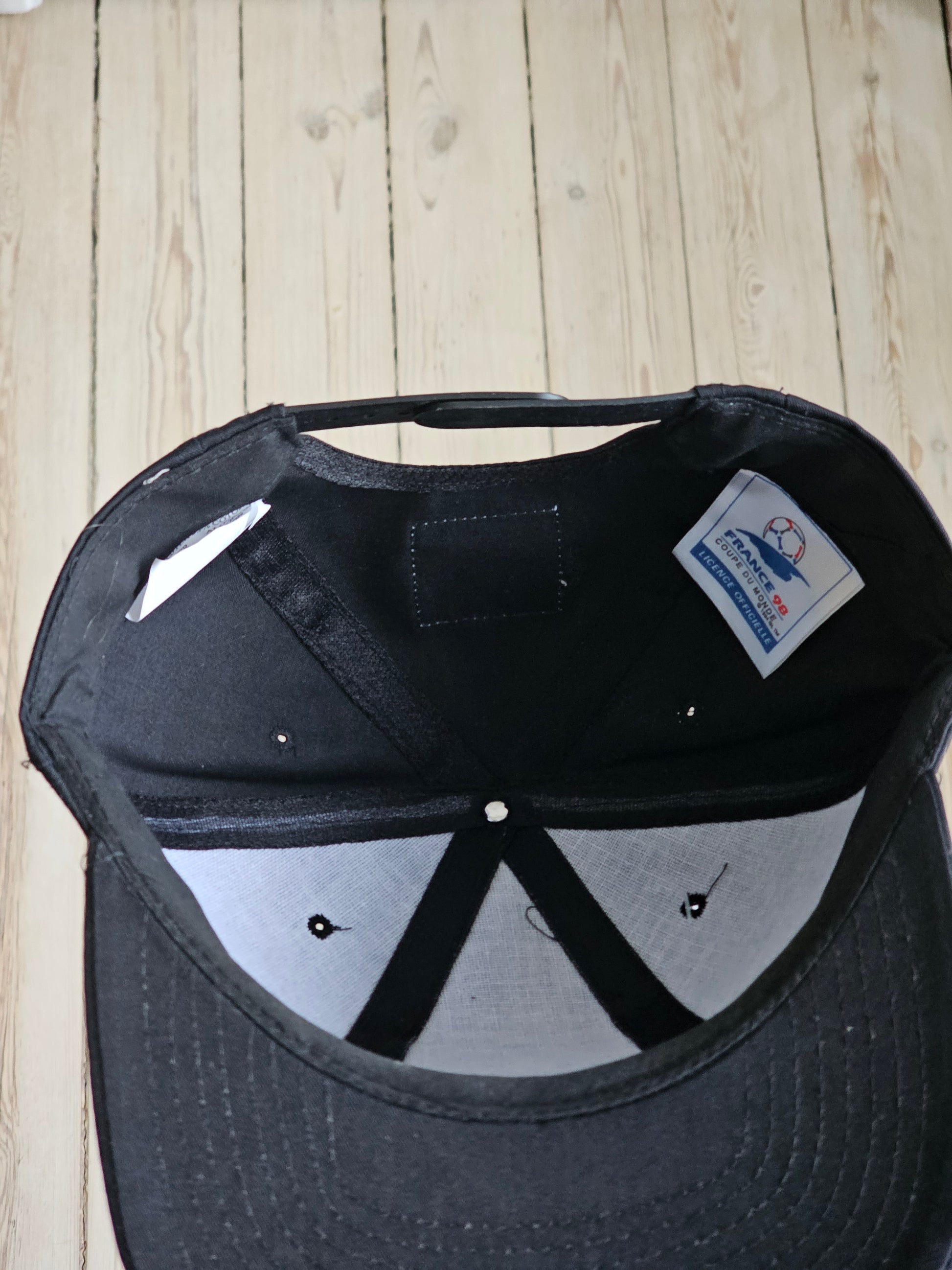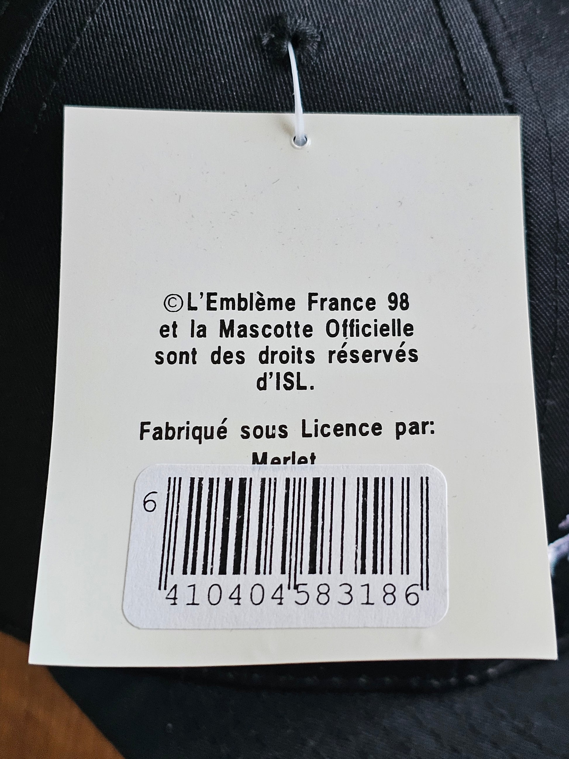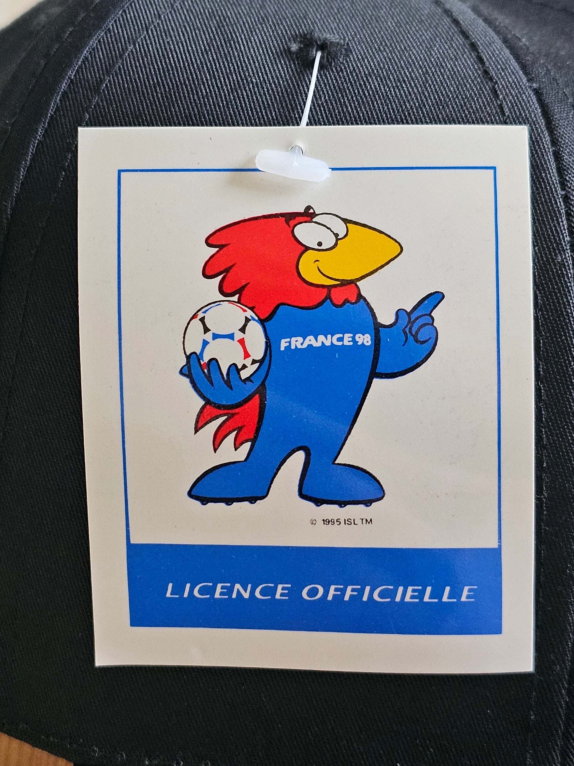 Aito käyttämätön Ranskan jalkapallon MM-kisojen lippis vuodelta 1998. Lippiksessä on vielä valmistajan laput tallella!