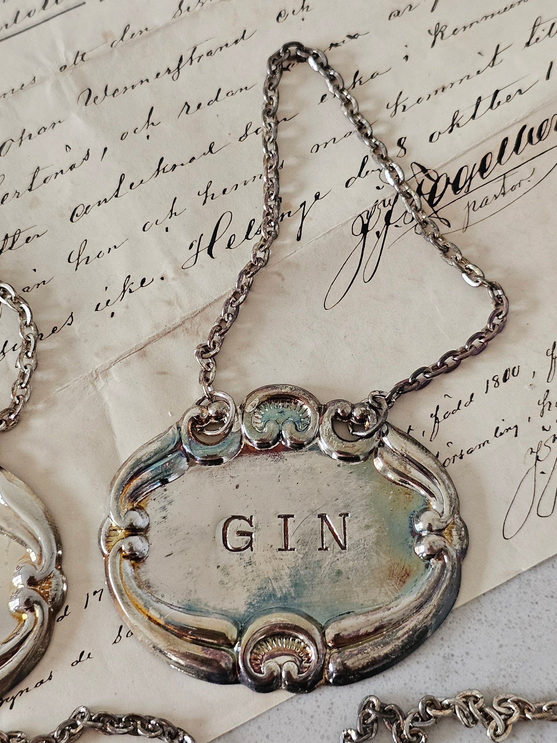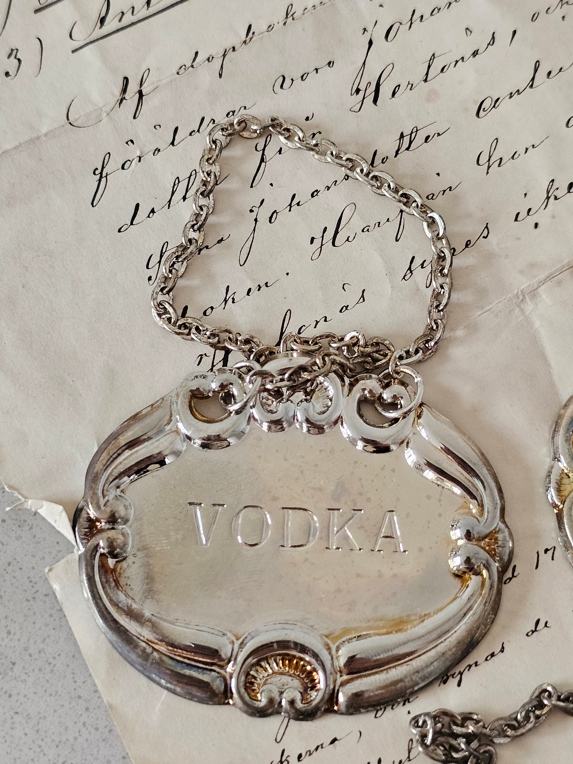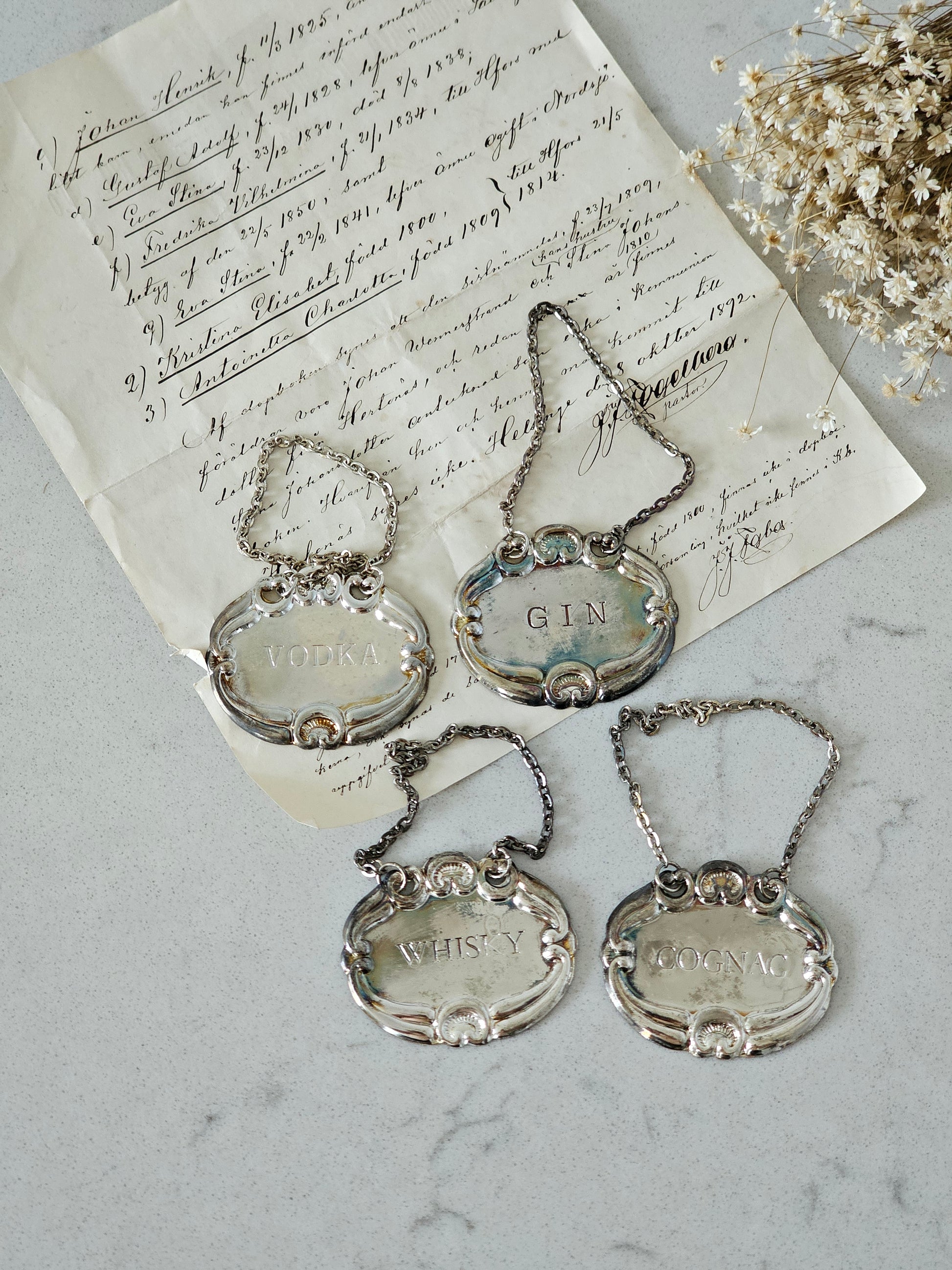 Kauniit vanhat alkoholikyltit pulloihin roikkumaan. Säilyneet alkuperäispakkauksessa erinomaisesti lukuun ottamatta kevyttä patinaa pinnassa. Upea lahjaidea vaikkapa pullon kera.