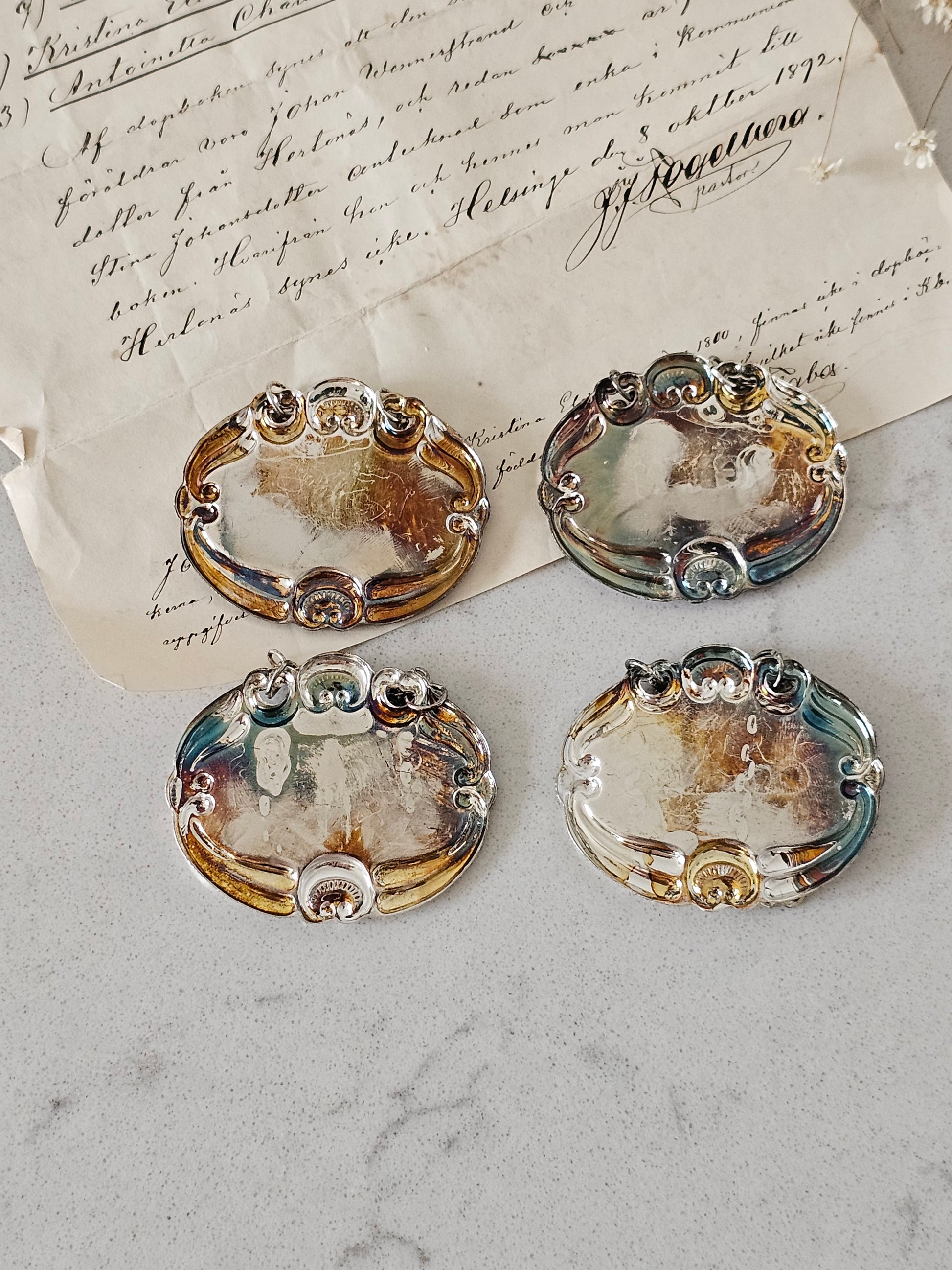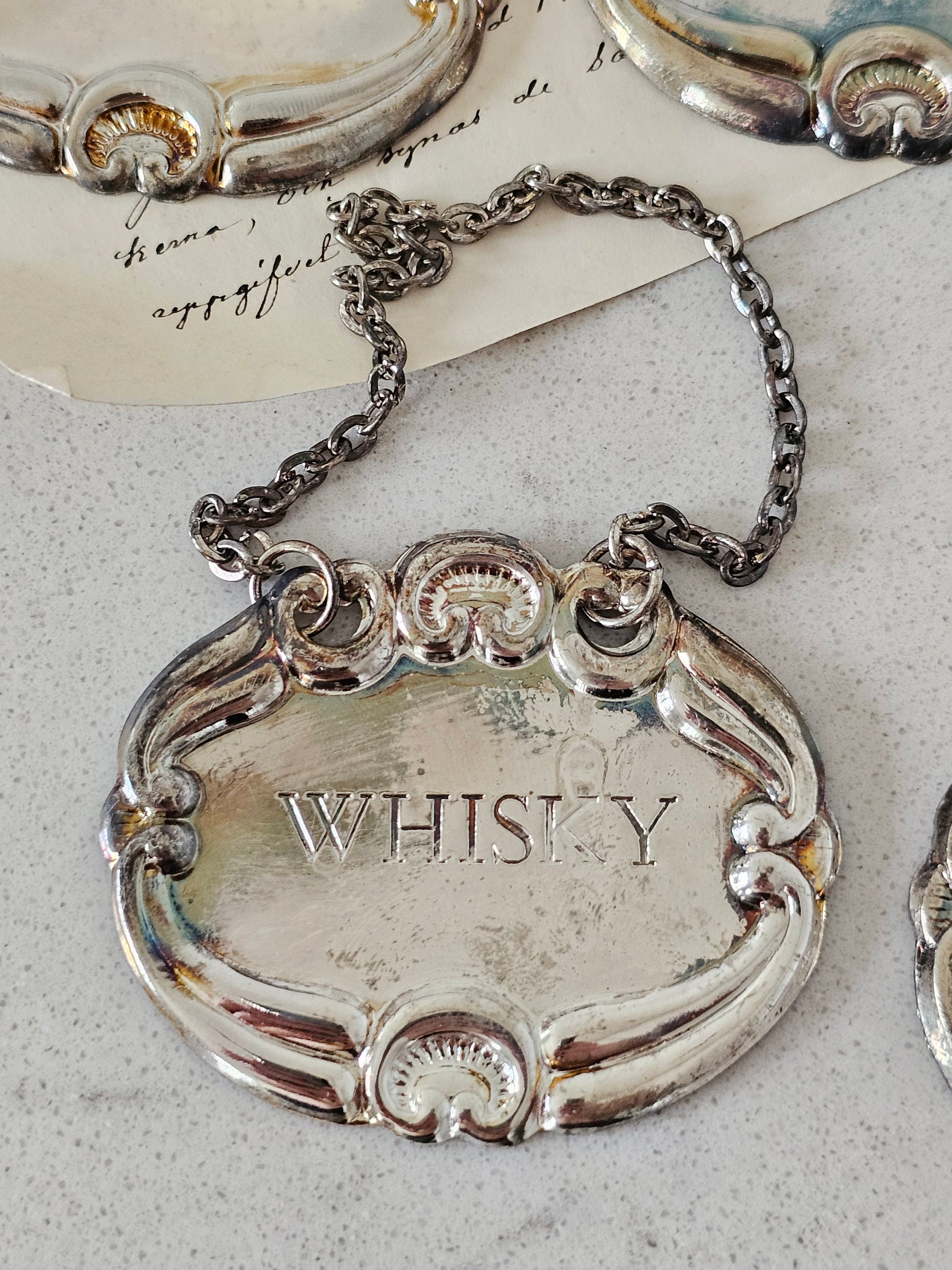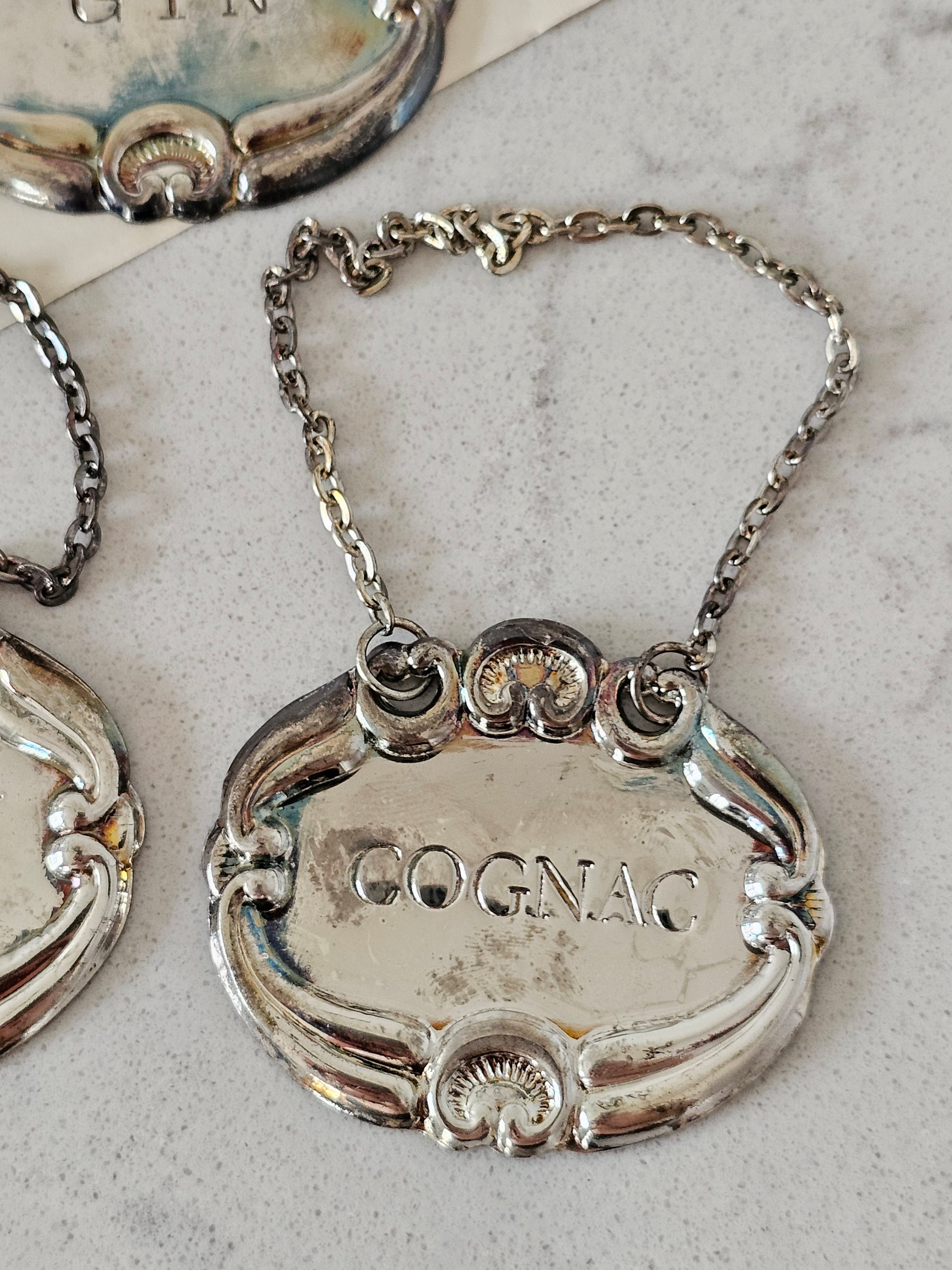 Kauniit vanhat alkoholikyltit pulloihin roikkumaan. Säilyneet alkuperäispakkauksessa erinomaisesti lukuun ottamatta kevyttä patinaa pinnassa. Upea lahjaidea vaikkapa pullon kera.