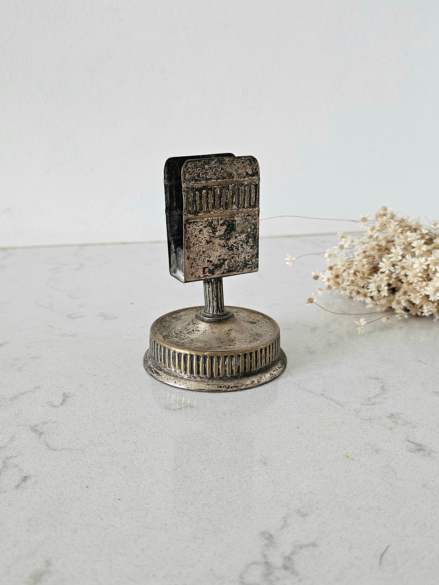 Antiikkinen tulitikkuaskiteline. Metallinen pinta on upeasti tummunut ja patinoitunut ajansaatossa.