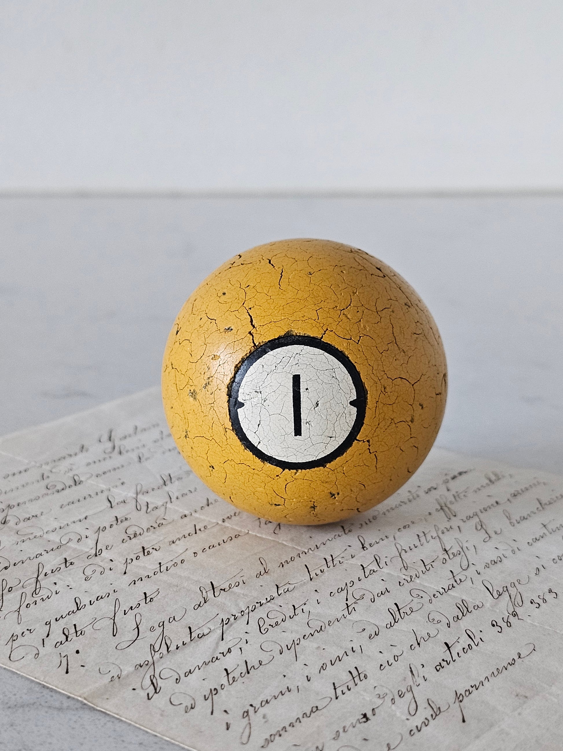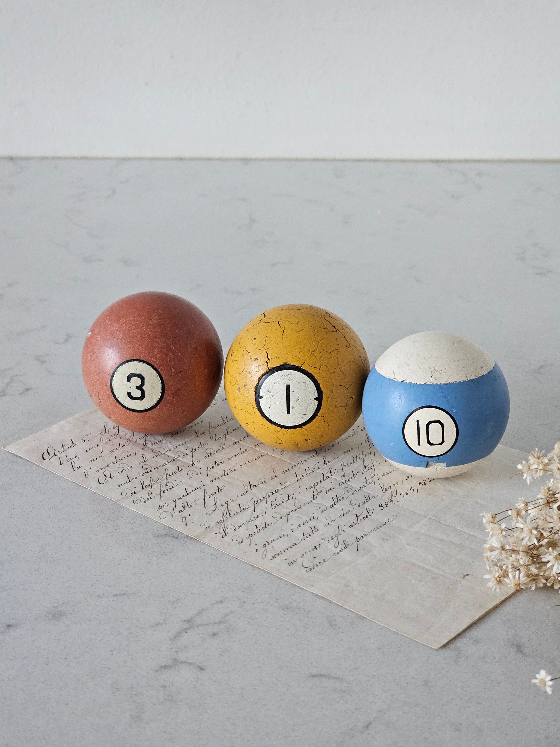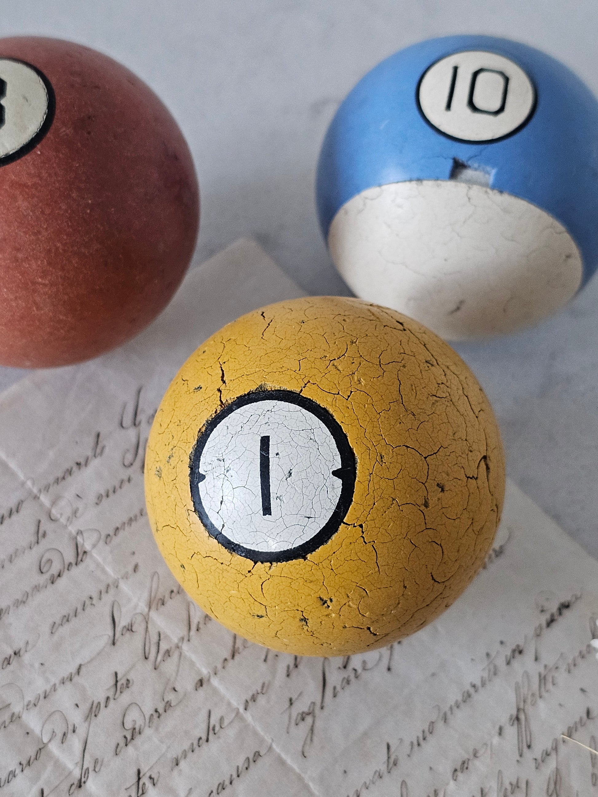 Vanhat tyylikkäästi patinoituneet biljardipallot. Palloissa on kauniit värit ja ne ovat erikoinen urheiluaiheinen elementti sisustukseen.