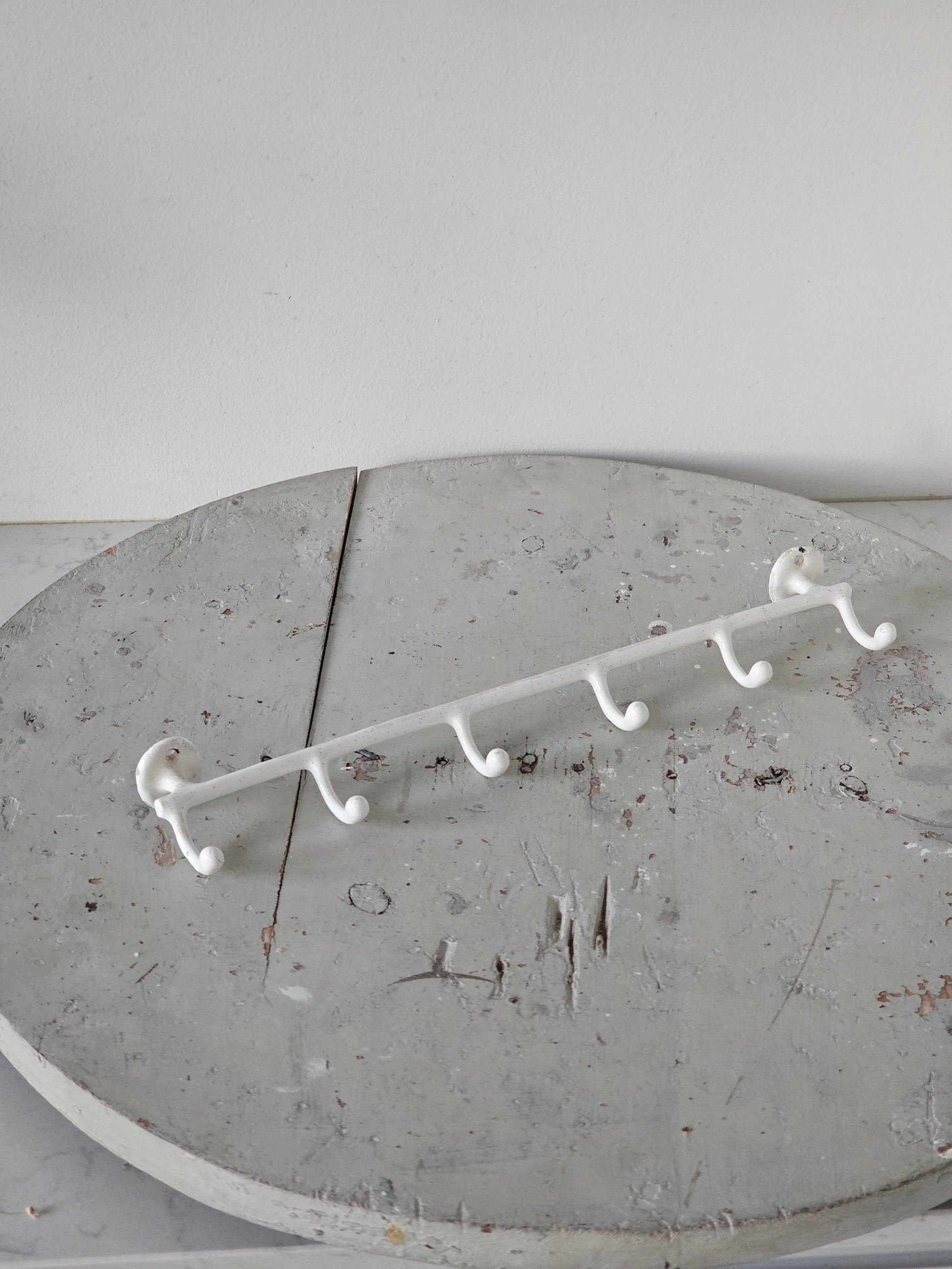 Vanha 1950-luvun emalinaulakko. Tässä kauniissa 6-koukkuisessa naulakossa on ajan tuomaa kolhua, mutta ikäänsä nähden emali on säilynyt hyvässä kunnossa.
