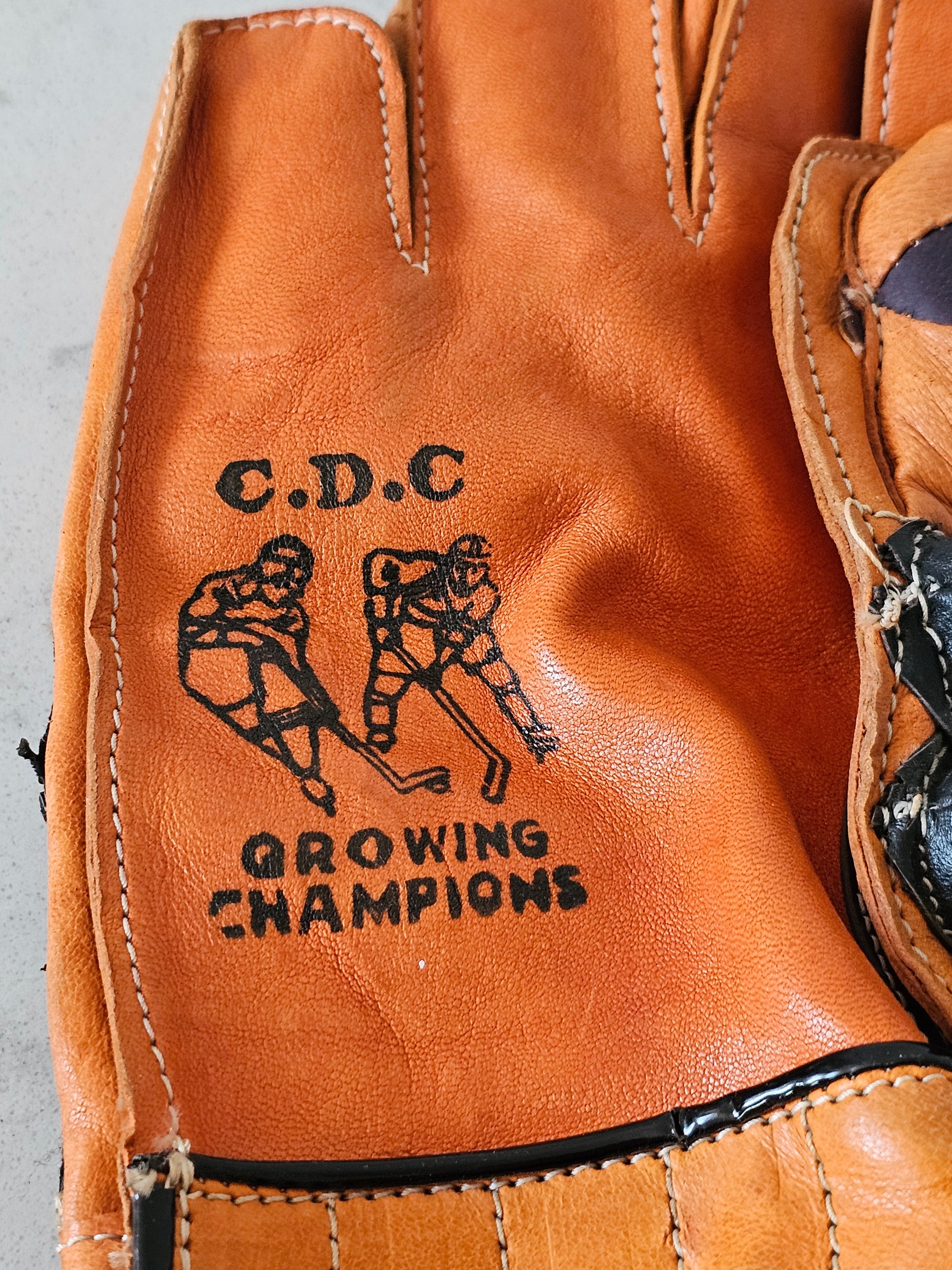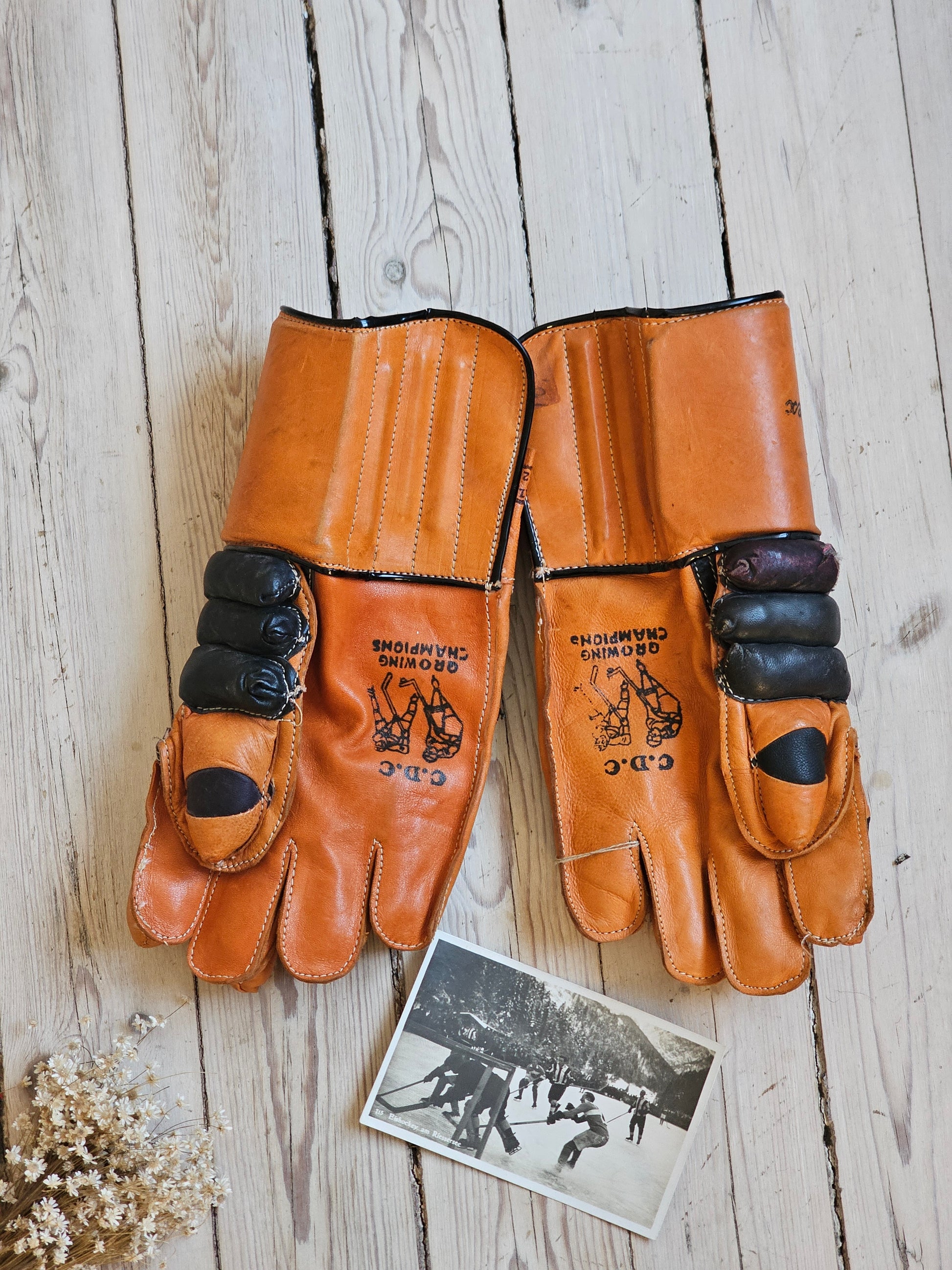 Upeat konjakinväriset jääkiekkohanskat arviolta 1960-luvulta. Tässä kunnossa säilyneet käsineet ovat todella harvinaiset! Nahkapinta on ikäisekseen huippukuntoinen, eikä hanskoja ole juurikaan käytetty.