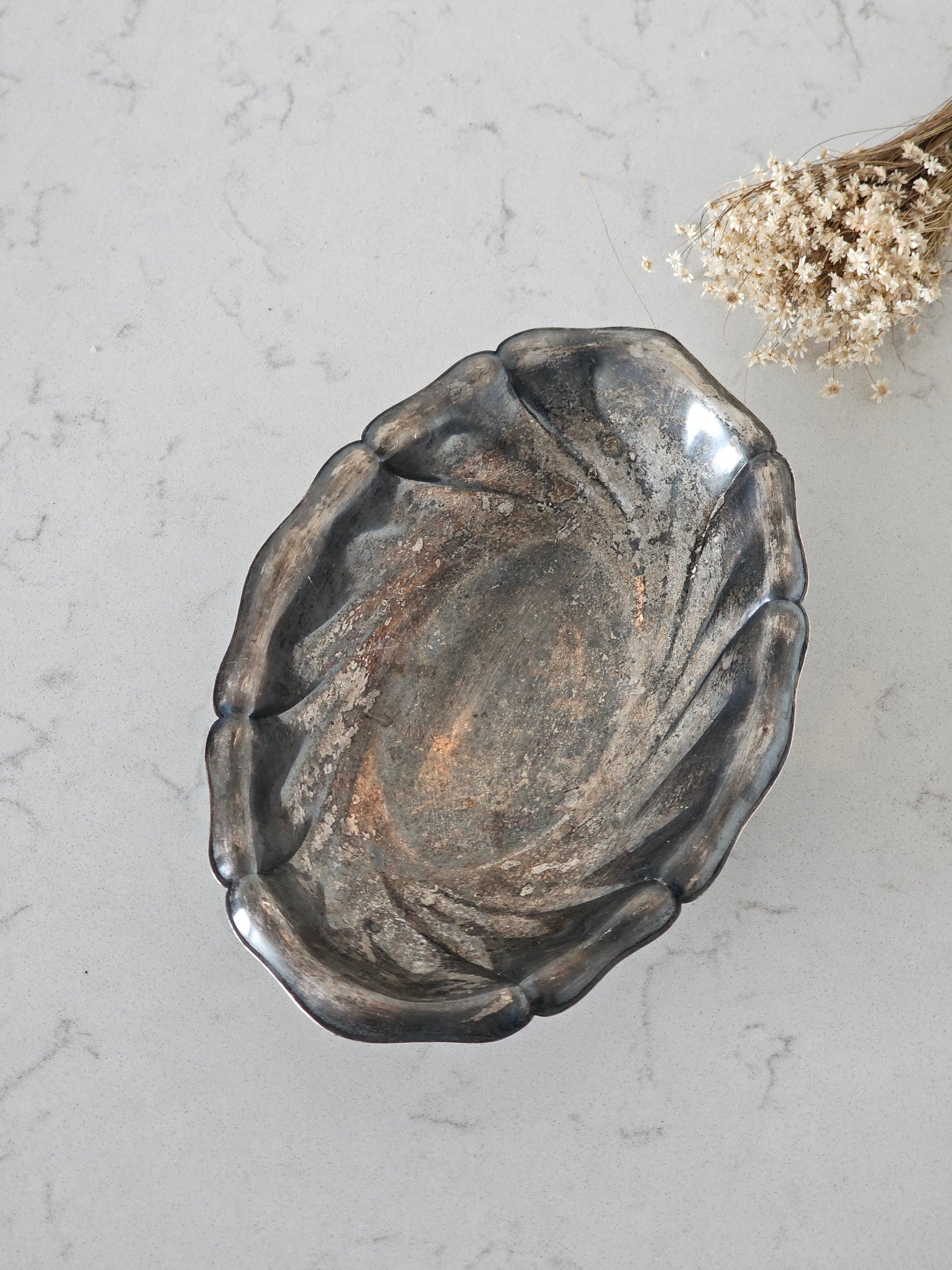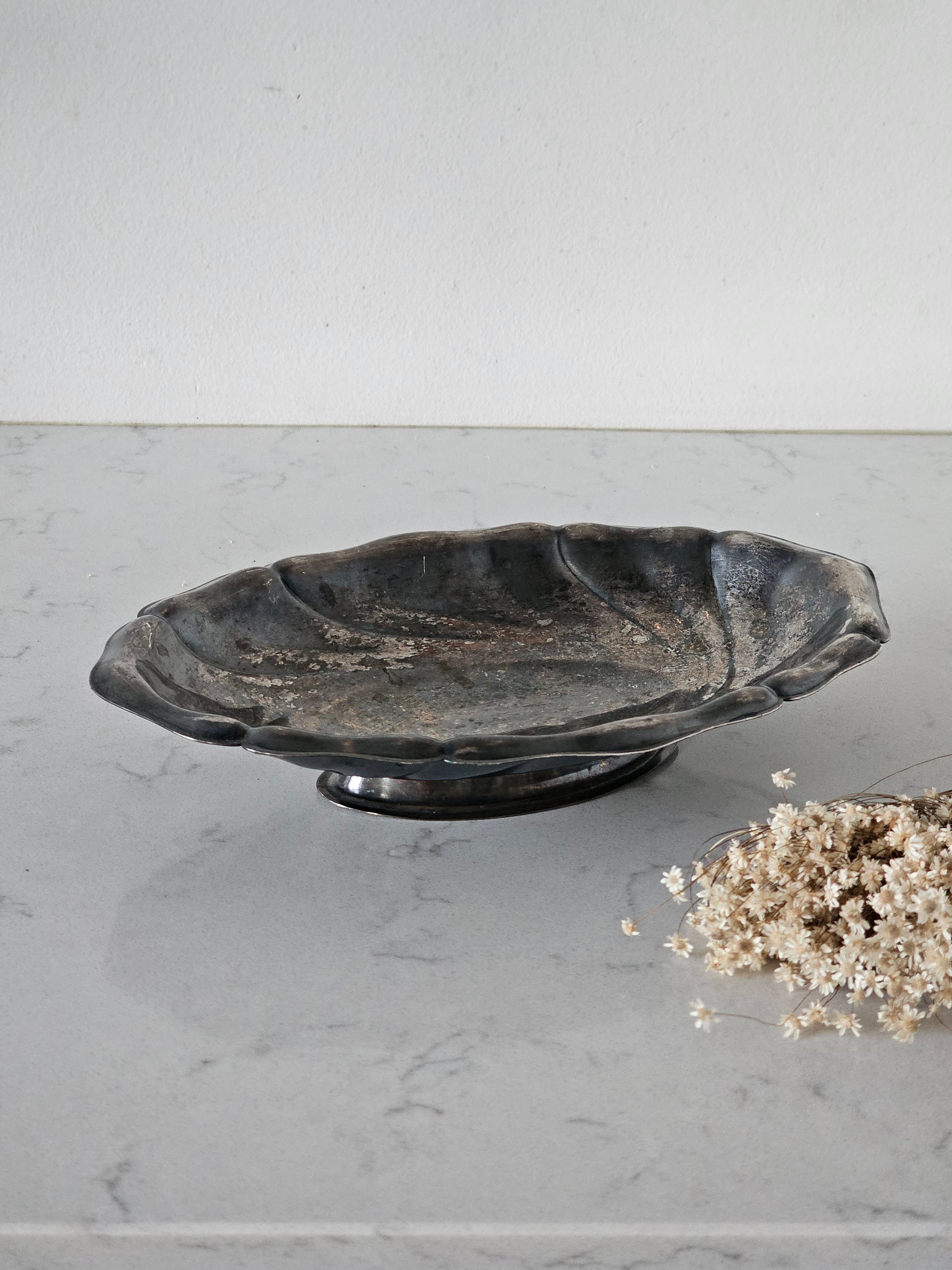 Vanha jalallinen tarjoiluastia, jonka pohja on kauniisti muotoiltu.