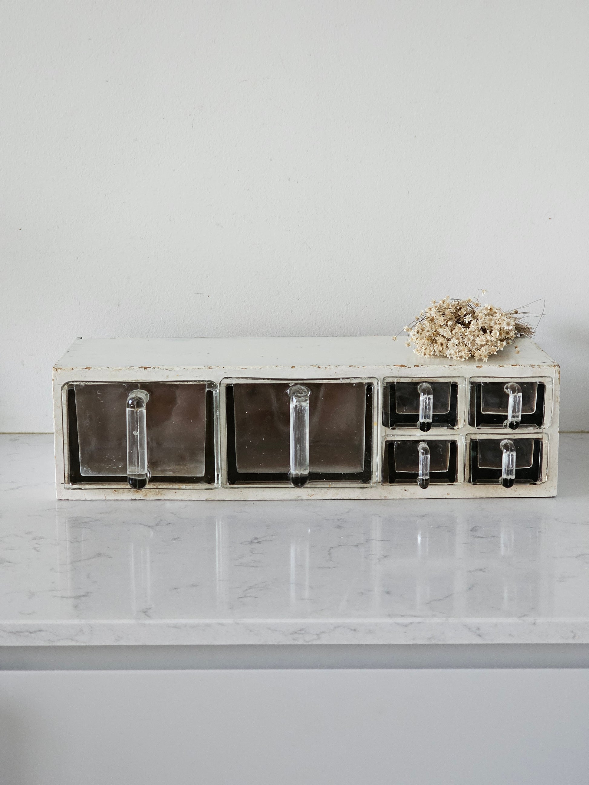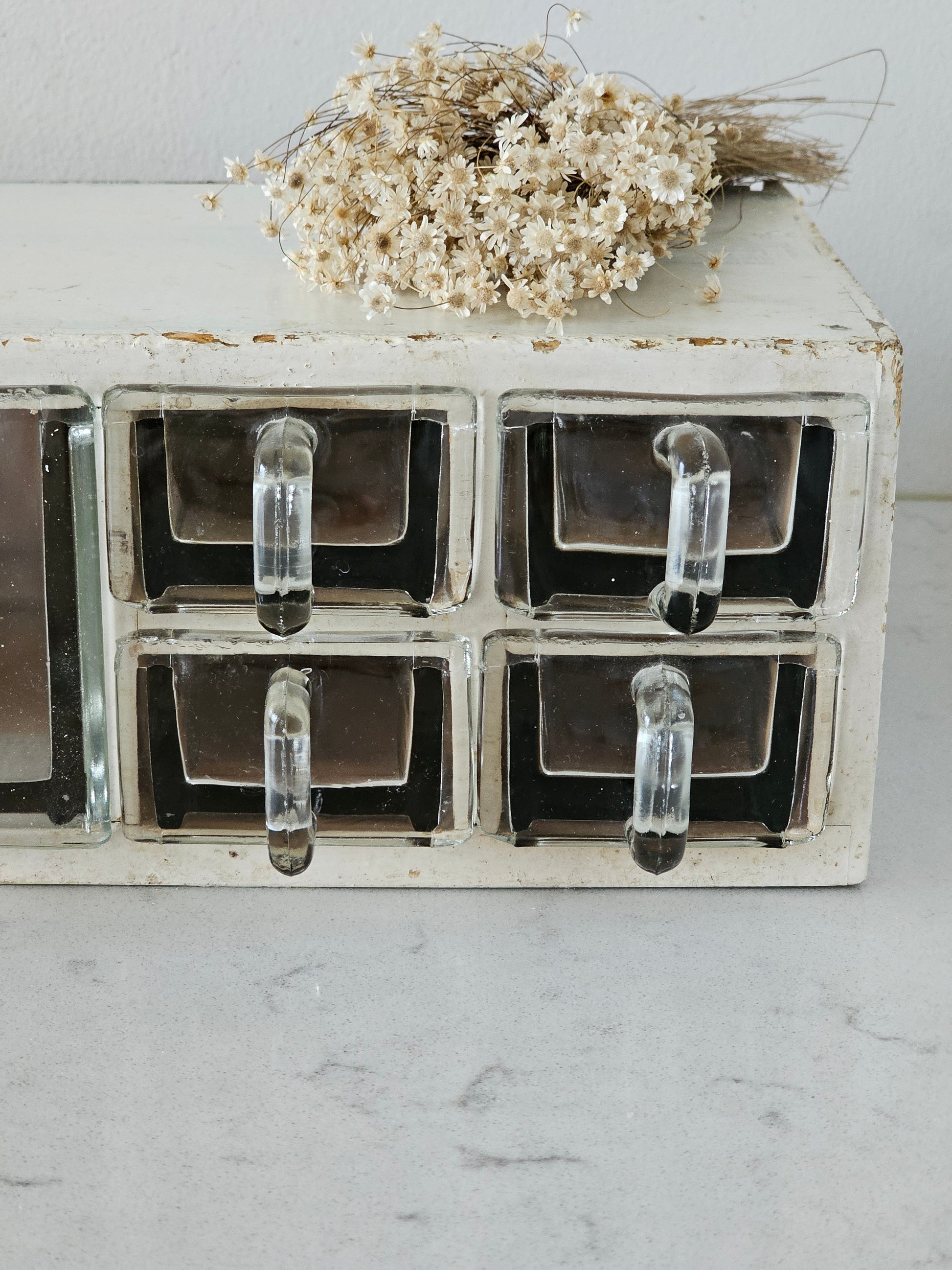 Upea vaalea vanha lasilaatikosto. Väri on kermanvaalea.
