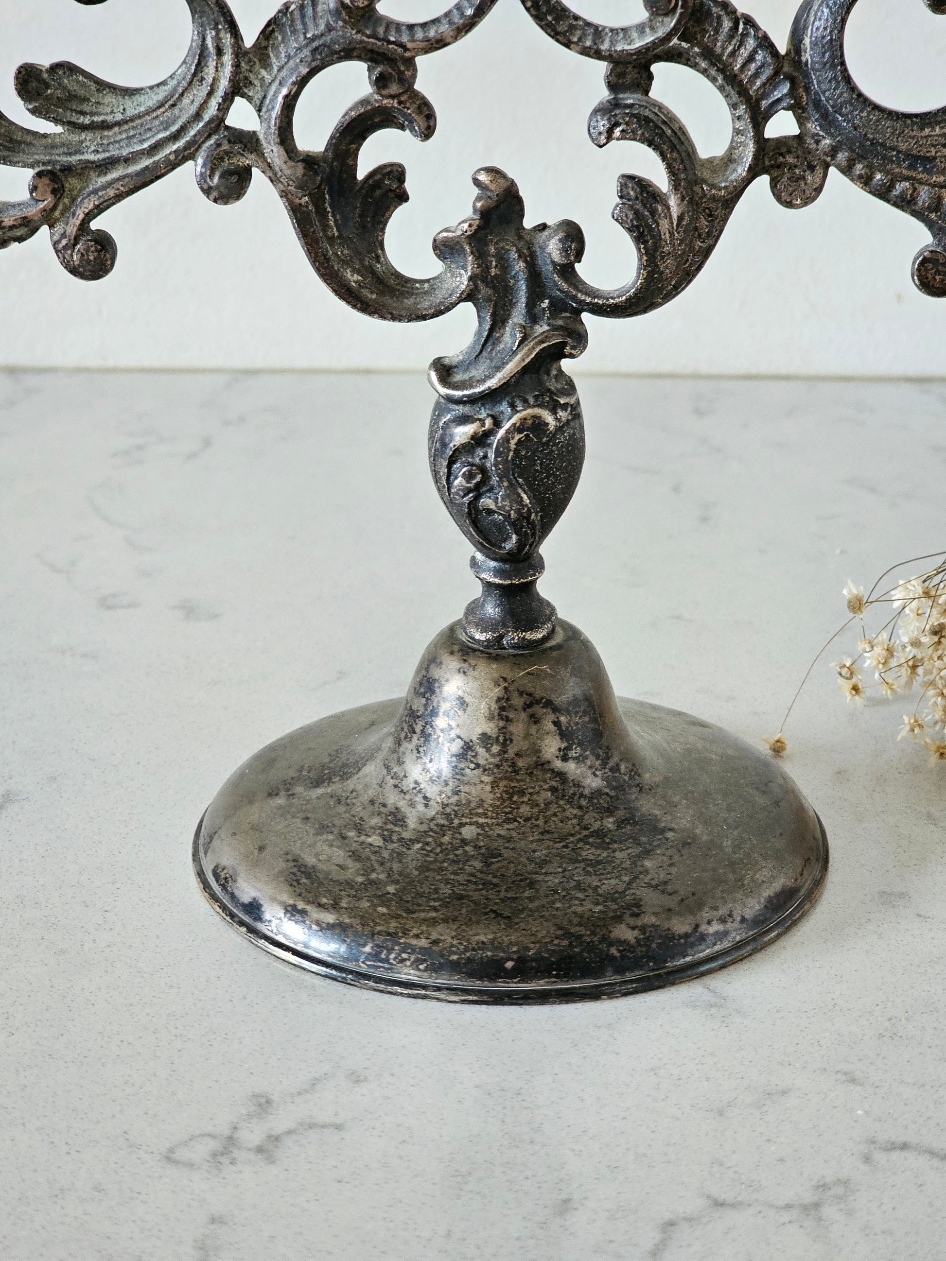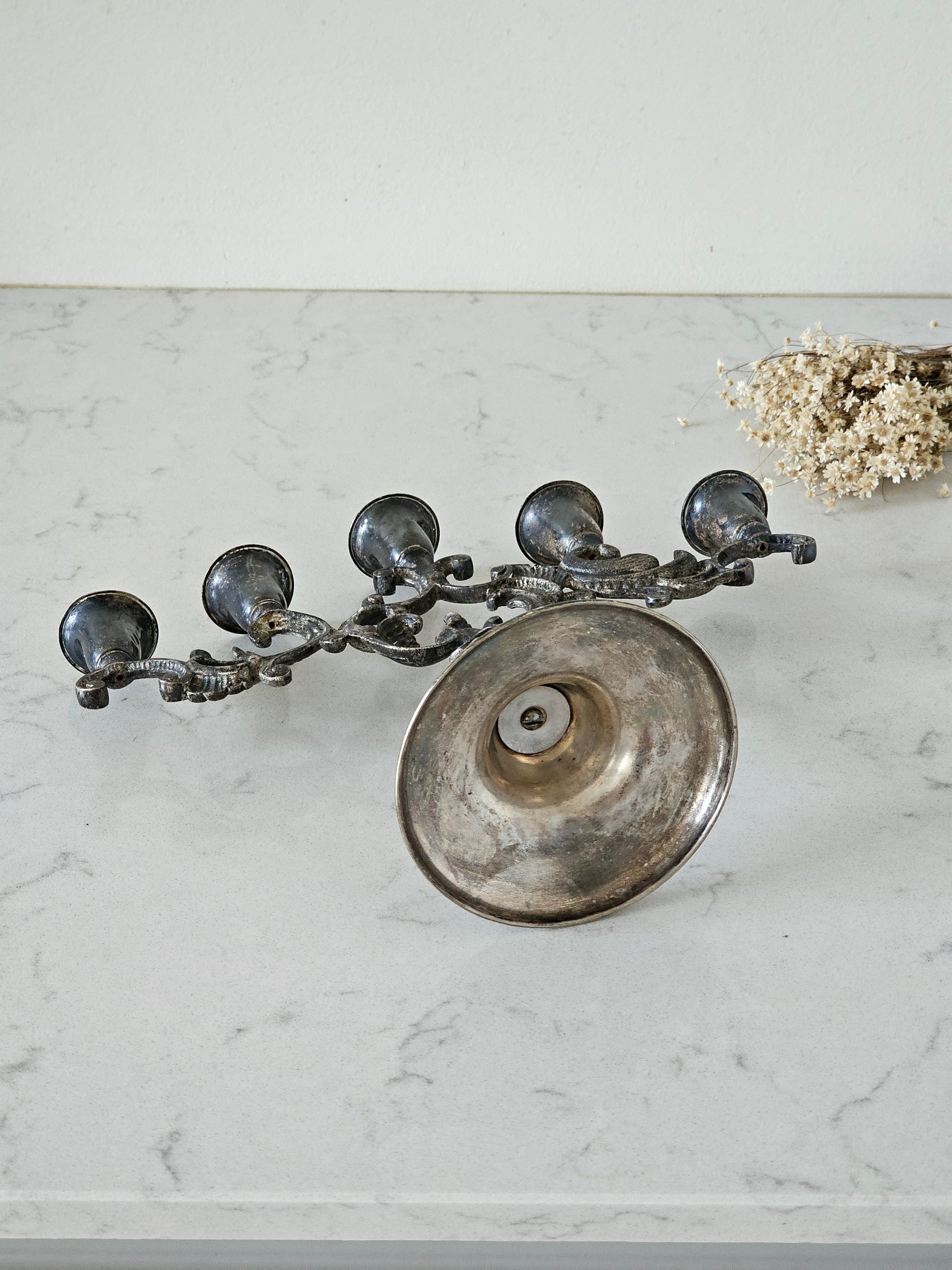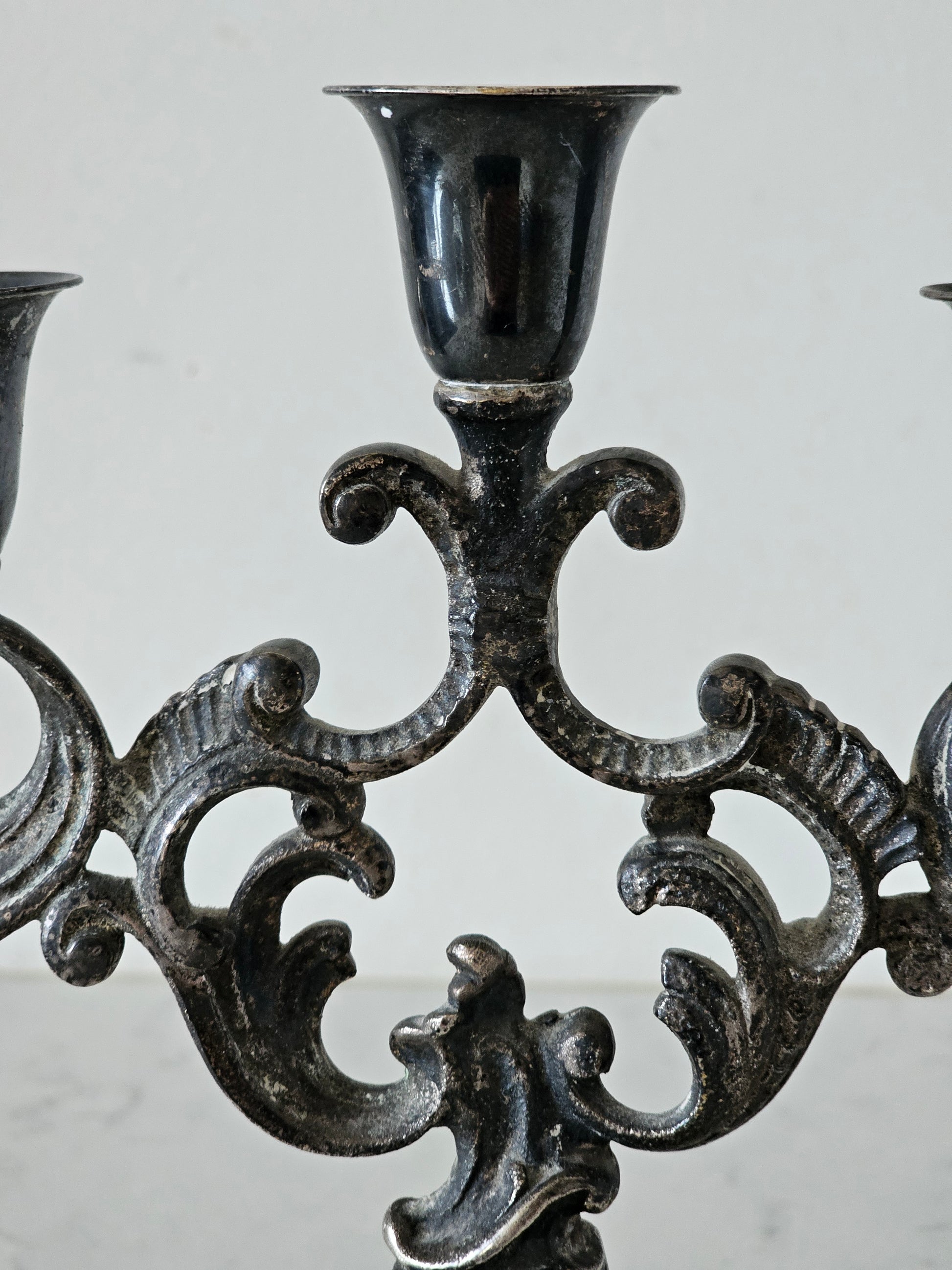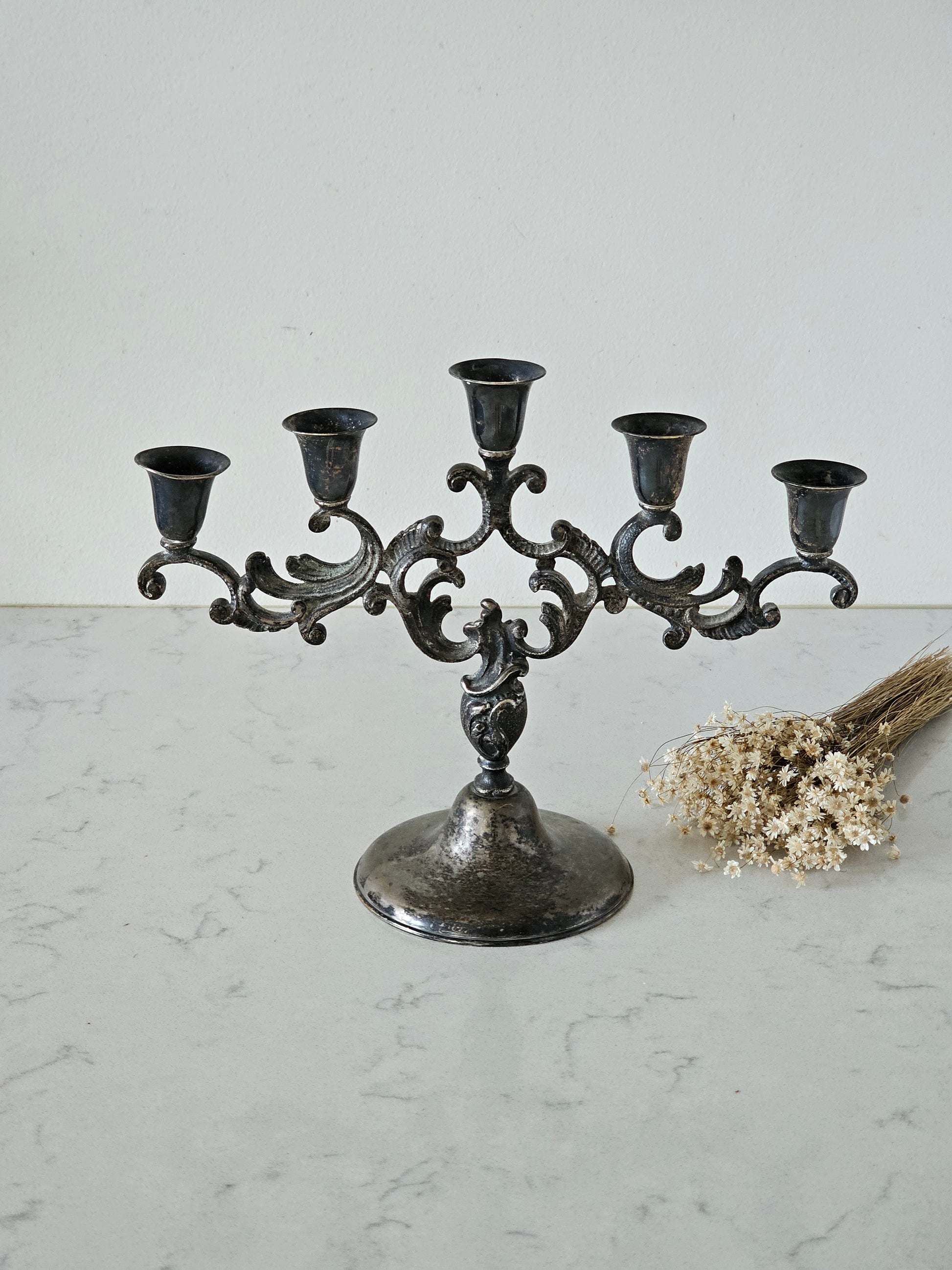Reilusti patinoitunut kynttelikkö, johon saa viisi kruunukynttilää. Pinta on tummentunut sieltä täältä, mikä tekee tästä kyntteliköstä hyvin antiikkisen näköisen. Kynttelikön varressa on kauniit koristelut.
