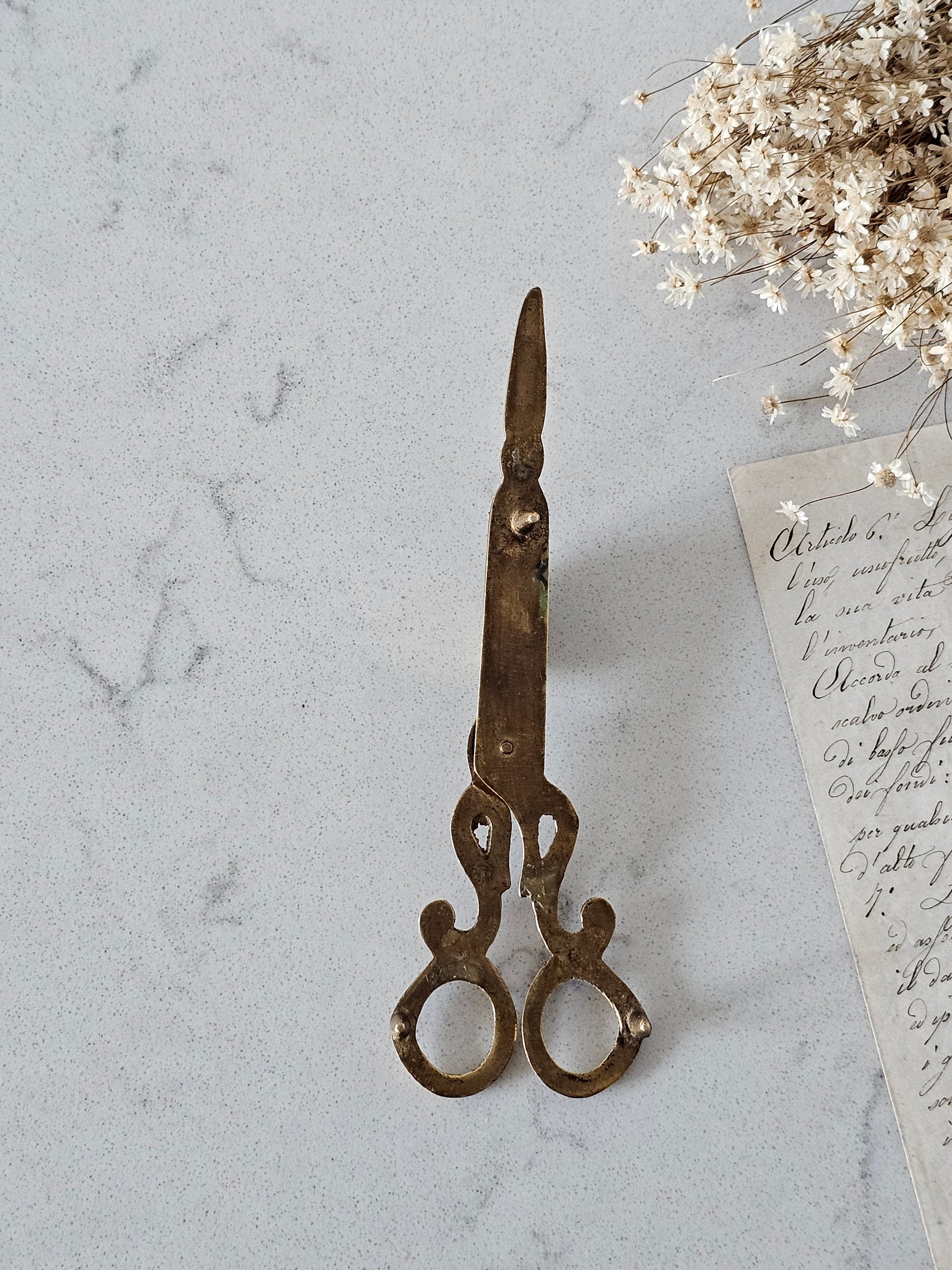 Vanhat messinginväriset kynttiläsakset Nämä kauniit kynttiläsakset sopivat esimerkiksi sommitelmaan messinkisten kynttiläjalkojen kanssa.