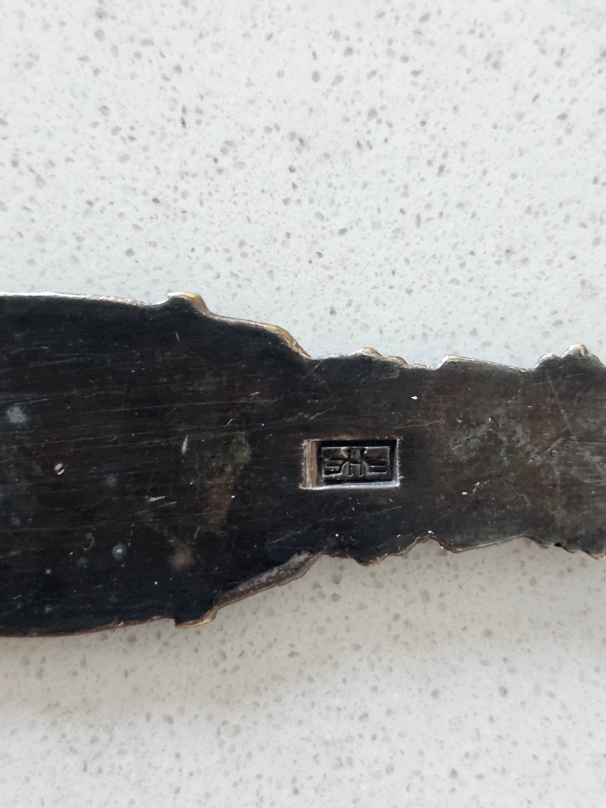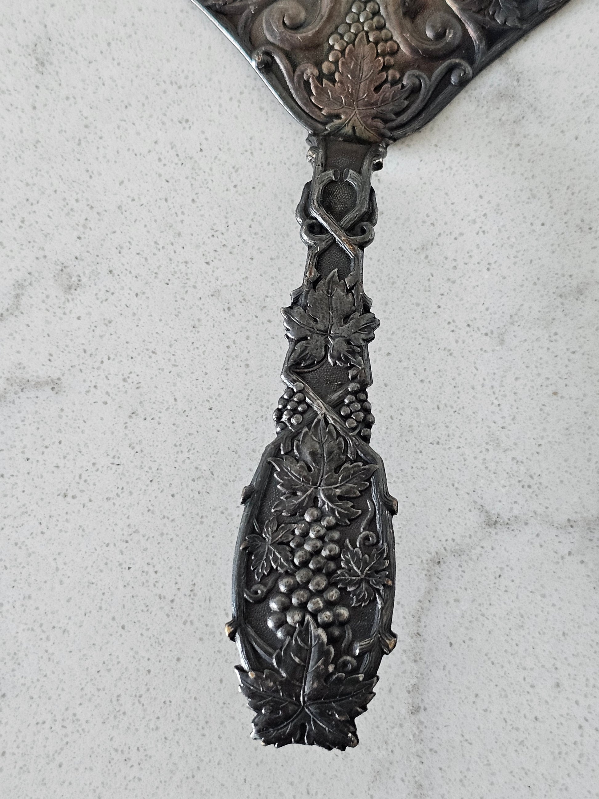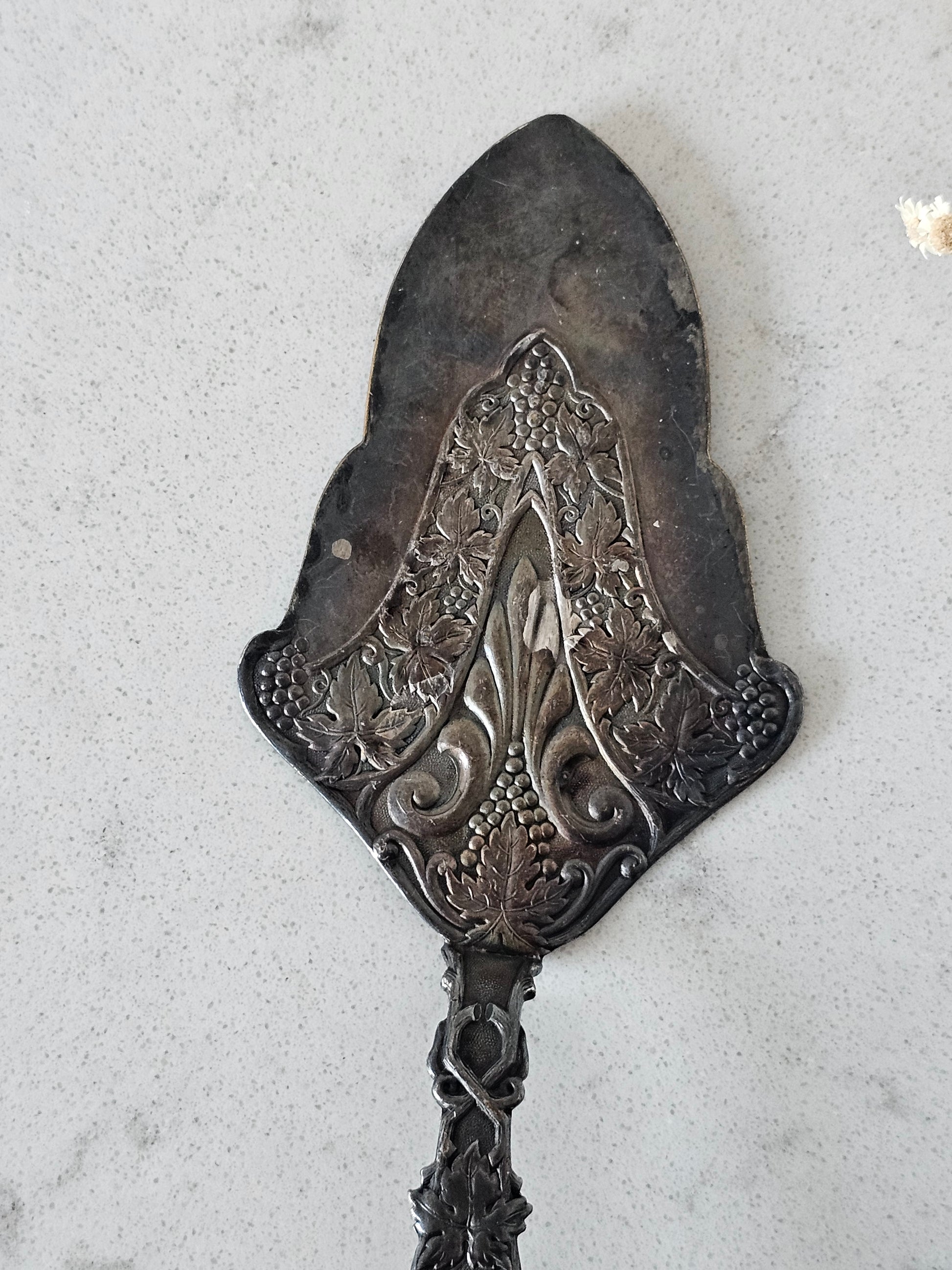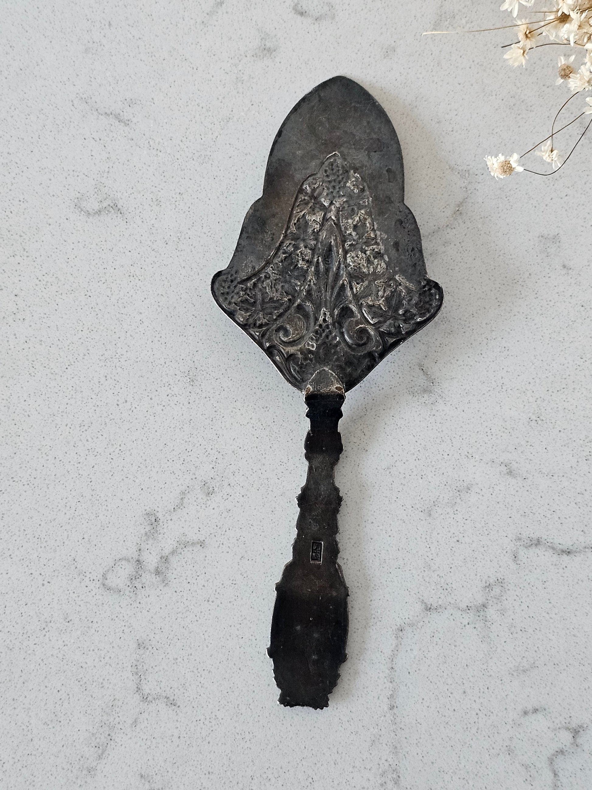 Koristeellinen erikoisen muotoinen kakkulapio. Uushopeaa, jonka pinta on kauniisti patinoitunut.