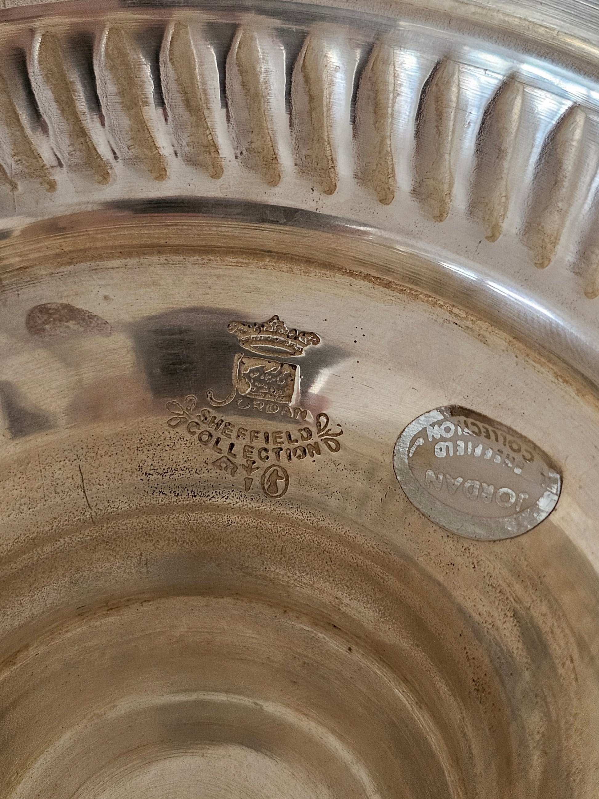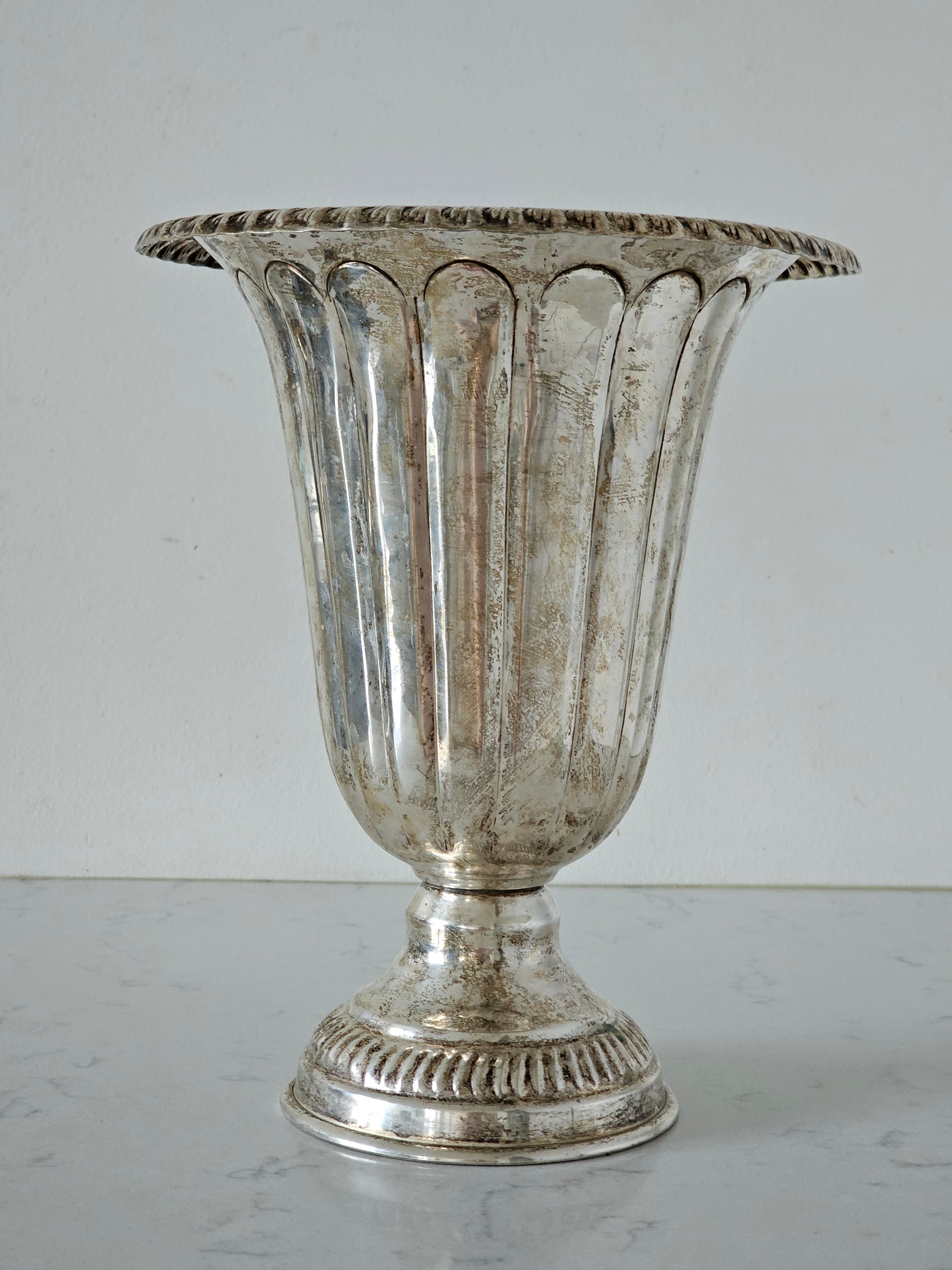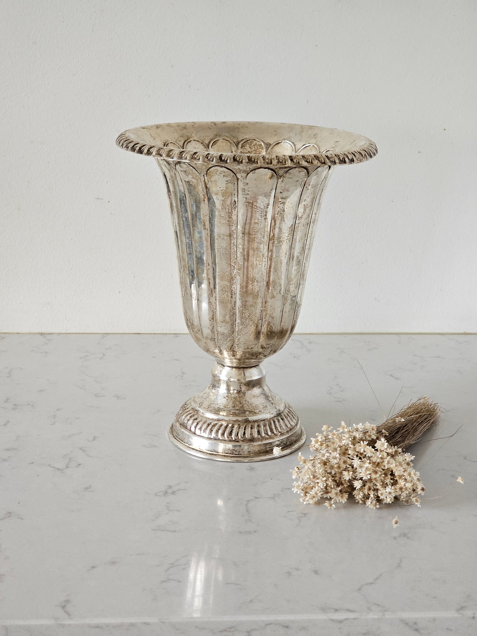 Upea metallinen vanha maljakko, joita on käytetty aikanaan myös hautausmaan kukka-asetelmiin. Näin isoja maljakoita tulee harvoin vastaan. Pohjassa leimat Jordan Sheffield Collection.