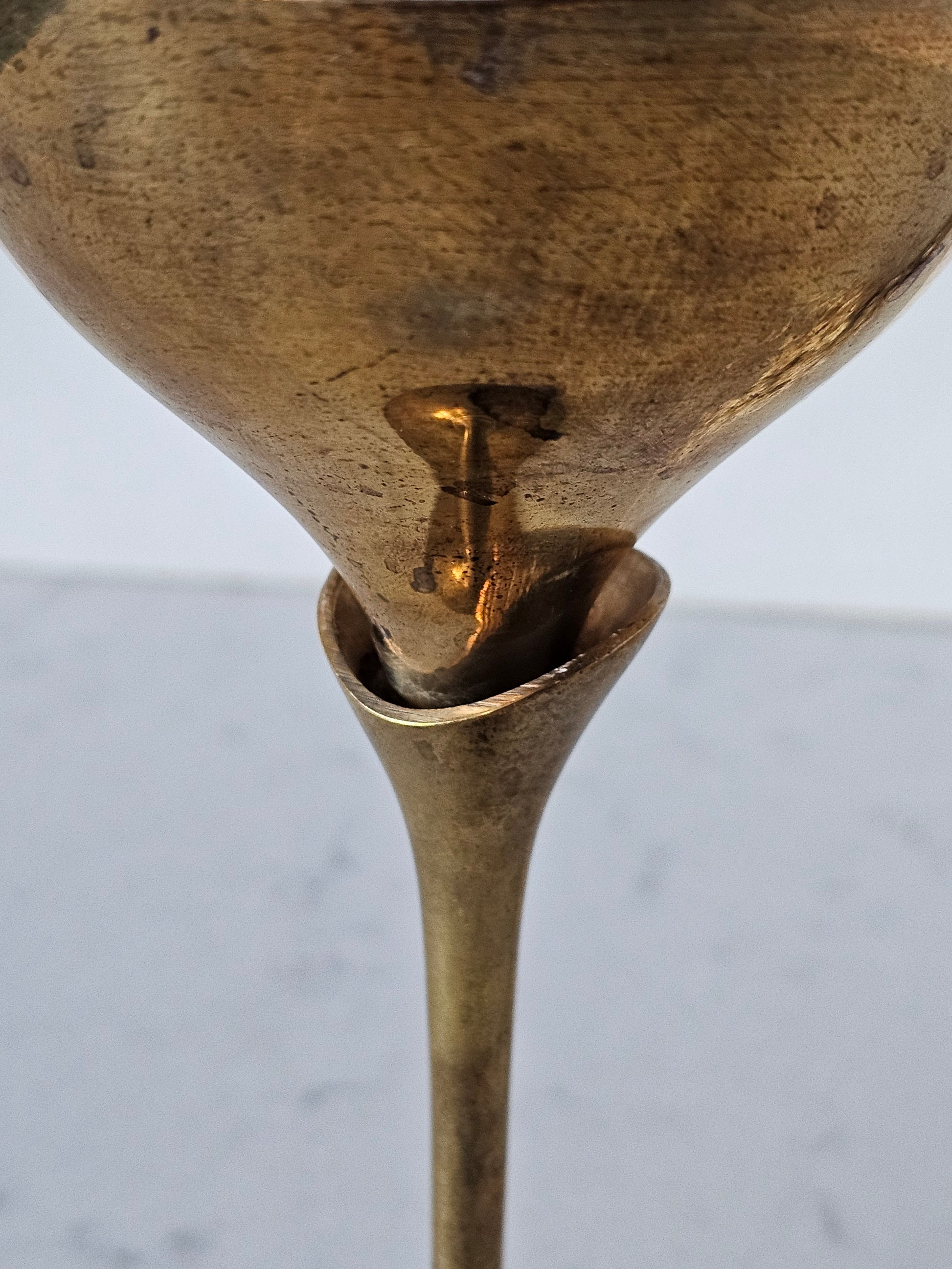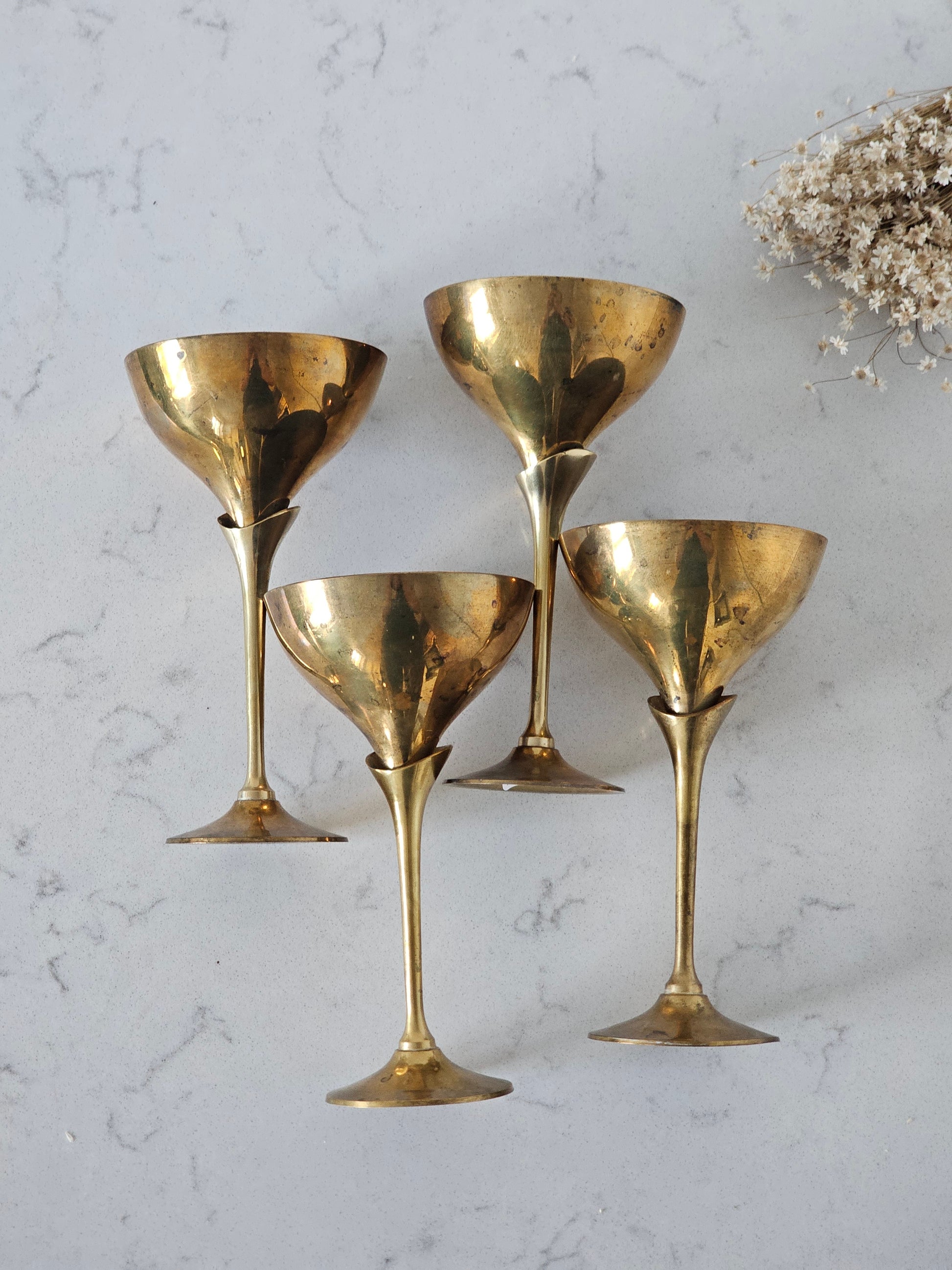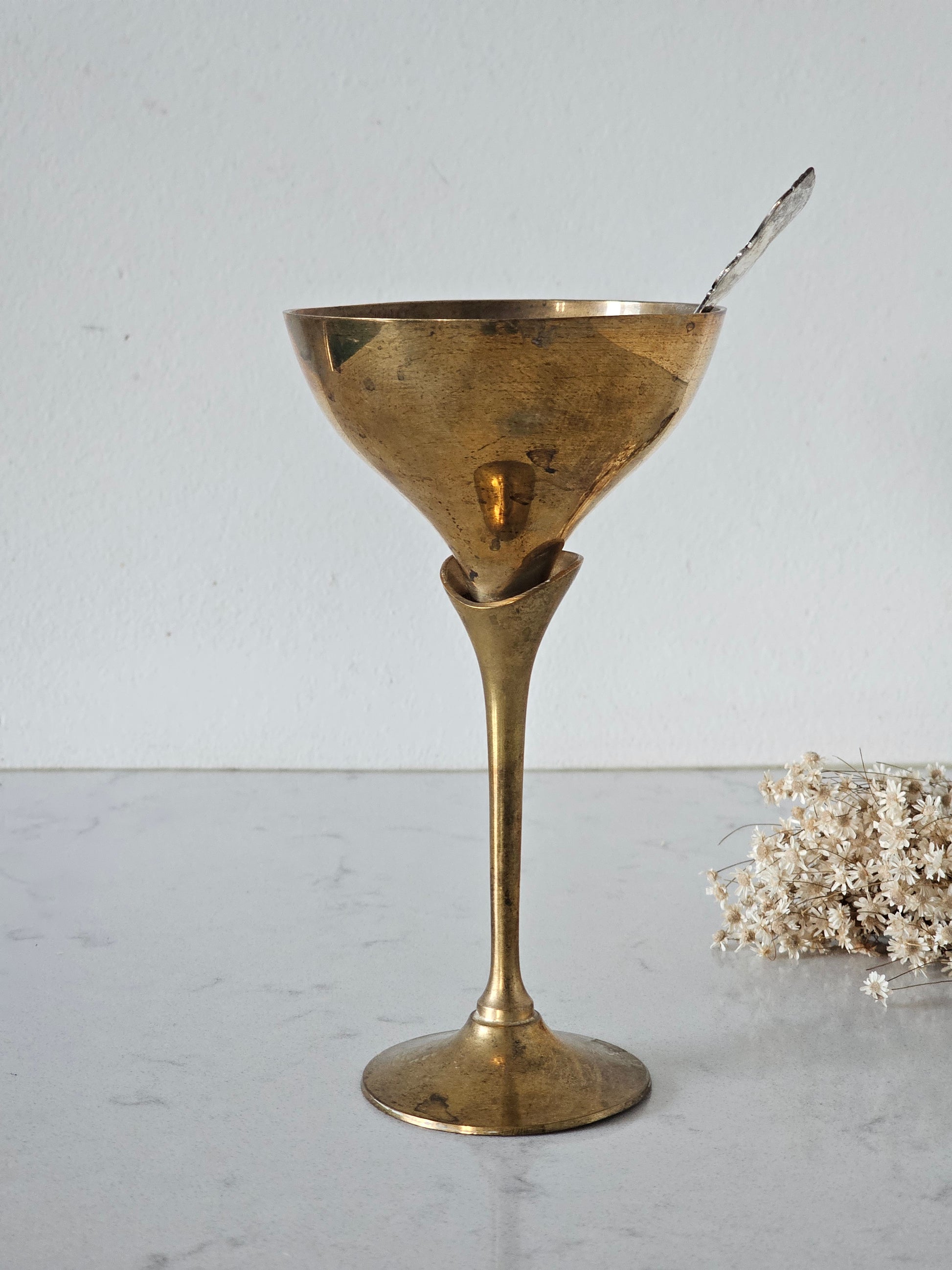 Kauniit messinginväriset jalalliset maljat esimerkiksi jälkiruokatarjoiluun. Nämä olisivat kauniita myös säilytykseen esimerkiksi koruille. Pinta on hienosti patinoitunut ajan saatossa.