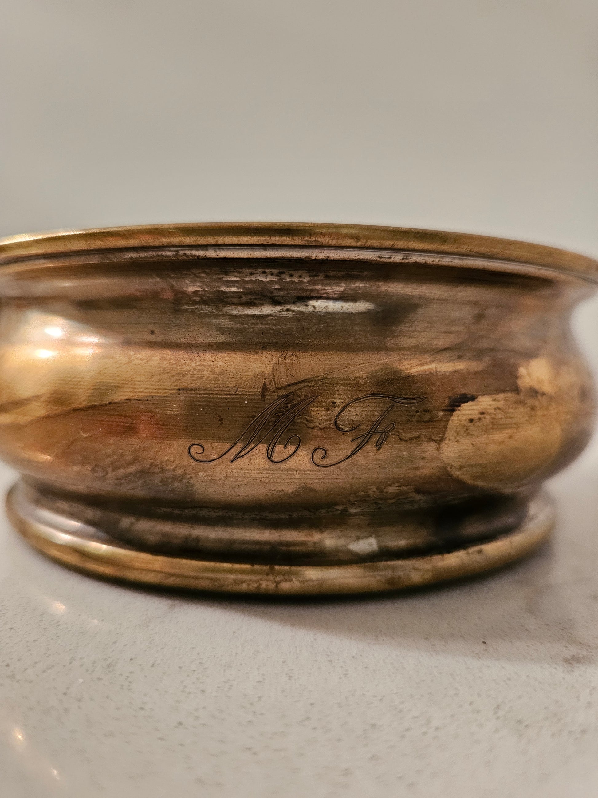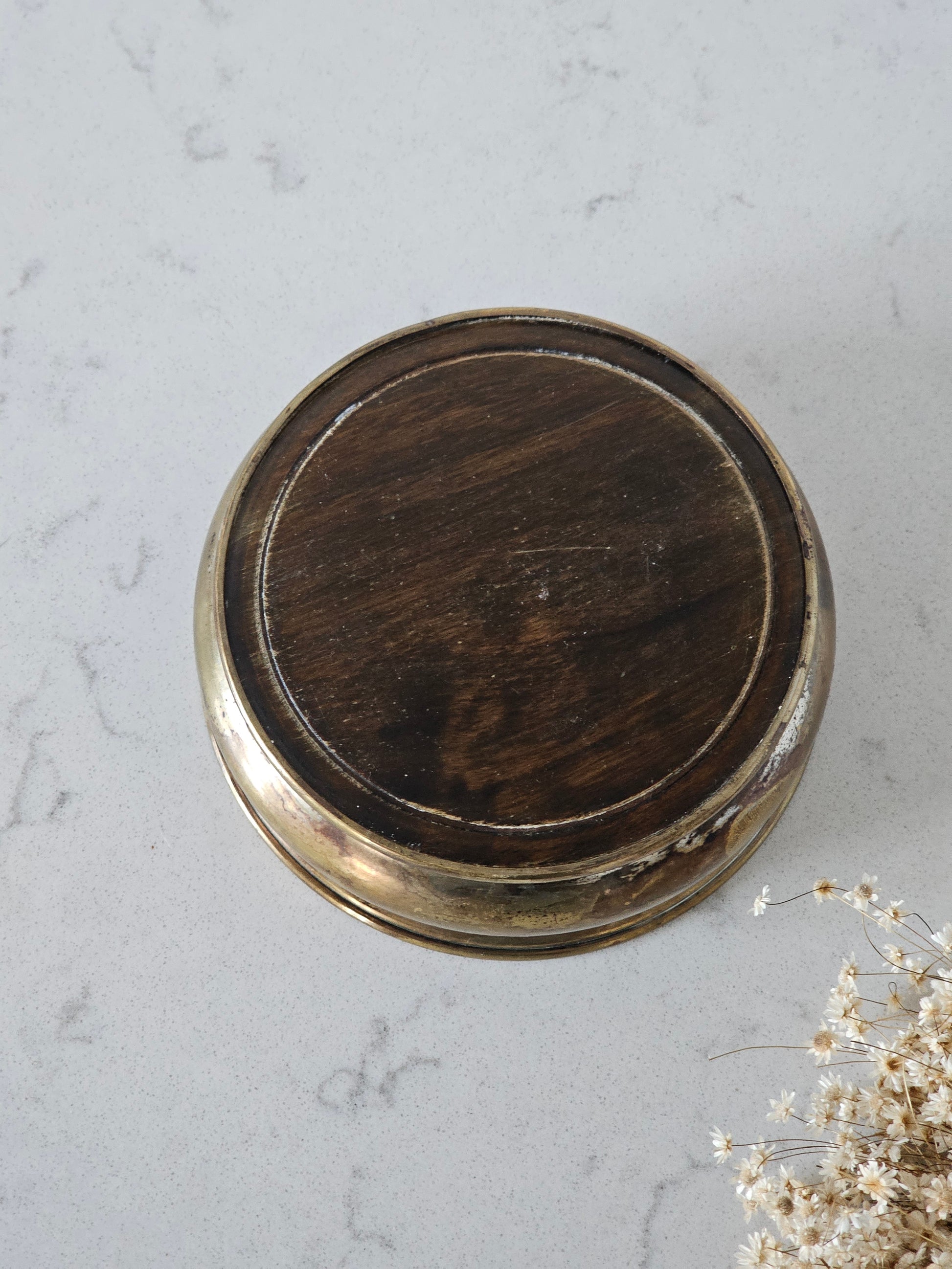 Todella kaunis viinipullon alunen, jonka pohja on ruskensävyistö puuta ja reunat metallia. Alunen on oikein hyväkuntoinen ja siinä on kaiverrus "M F"