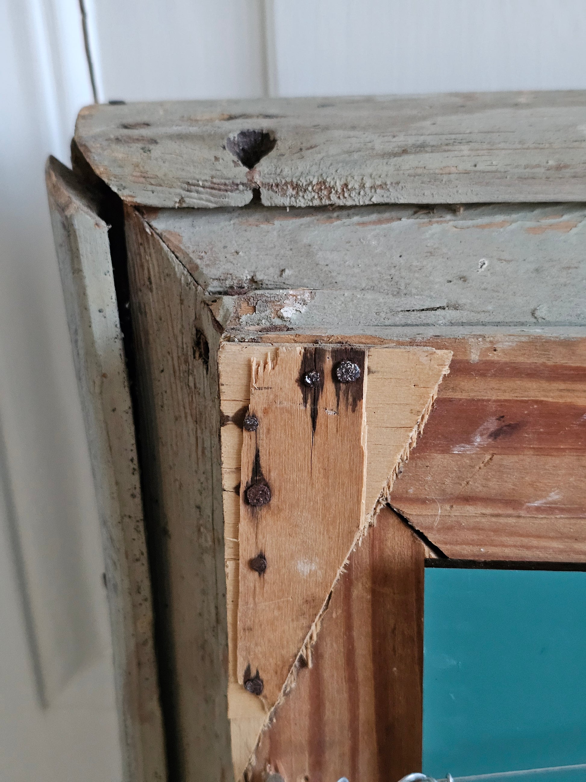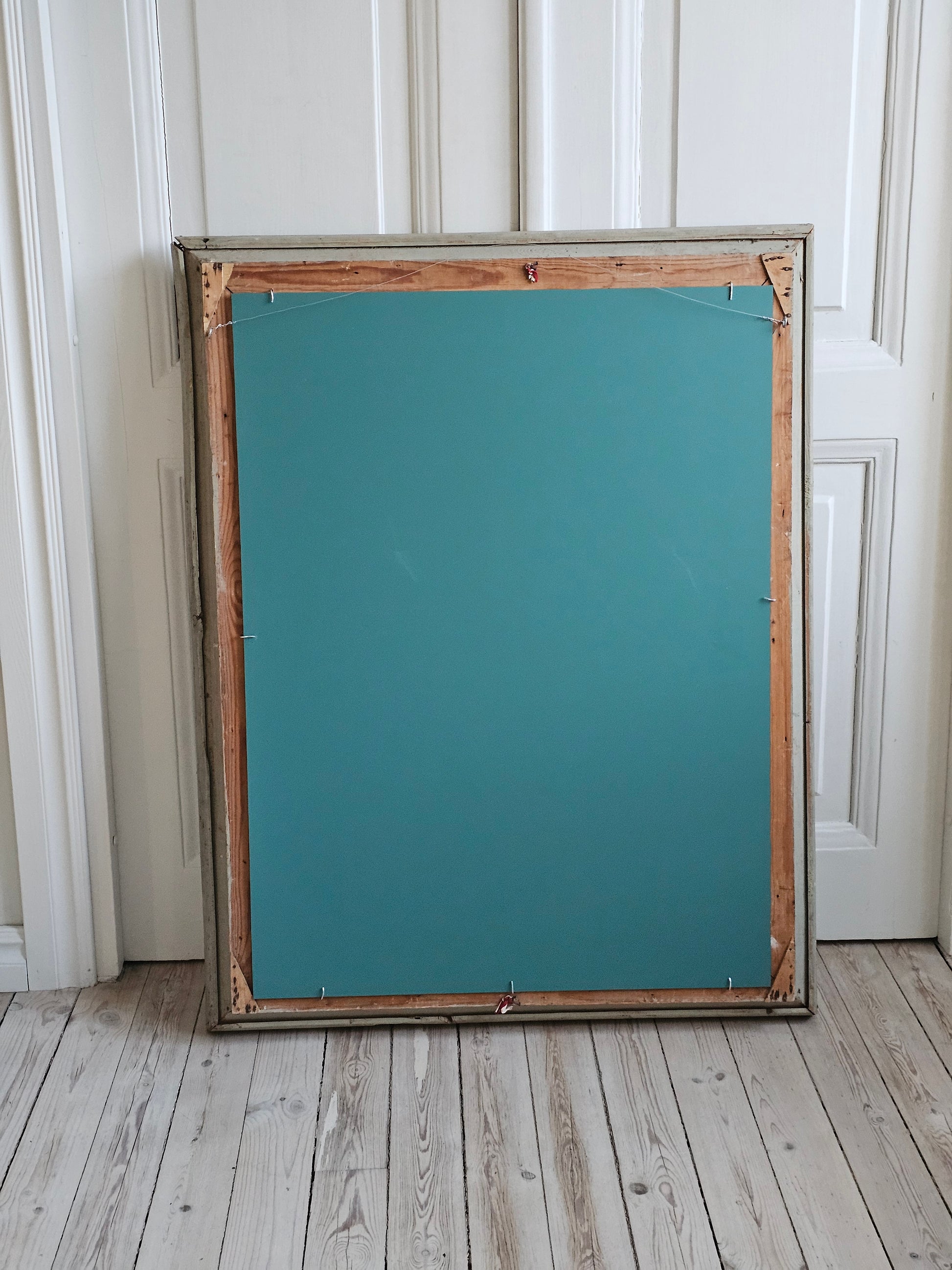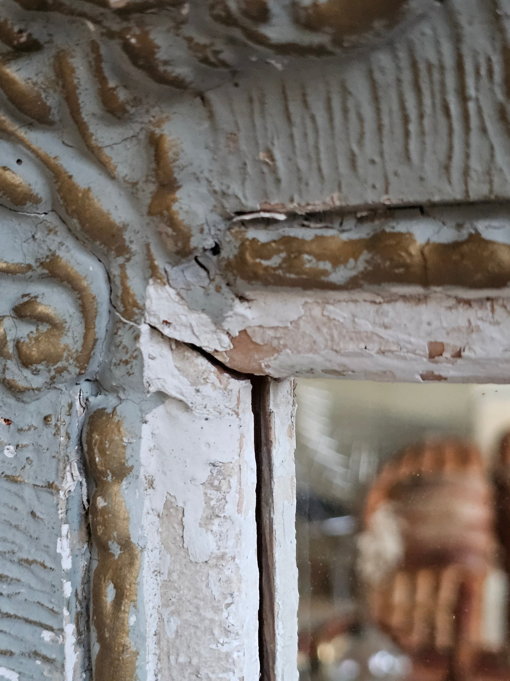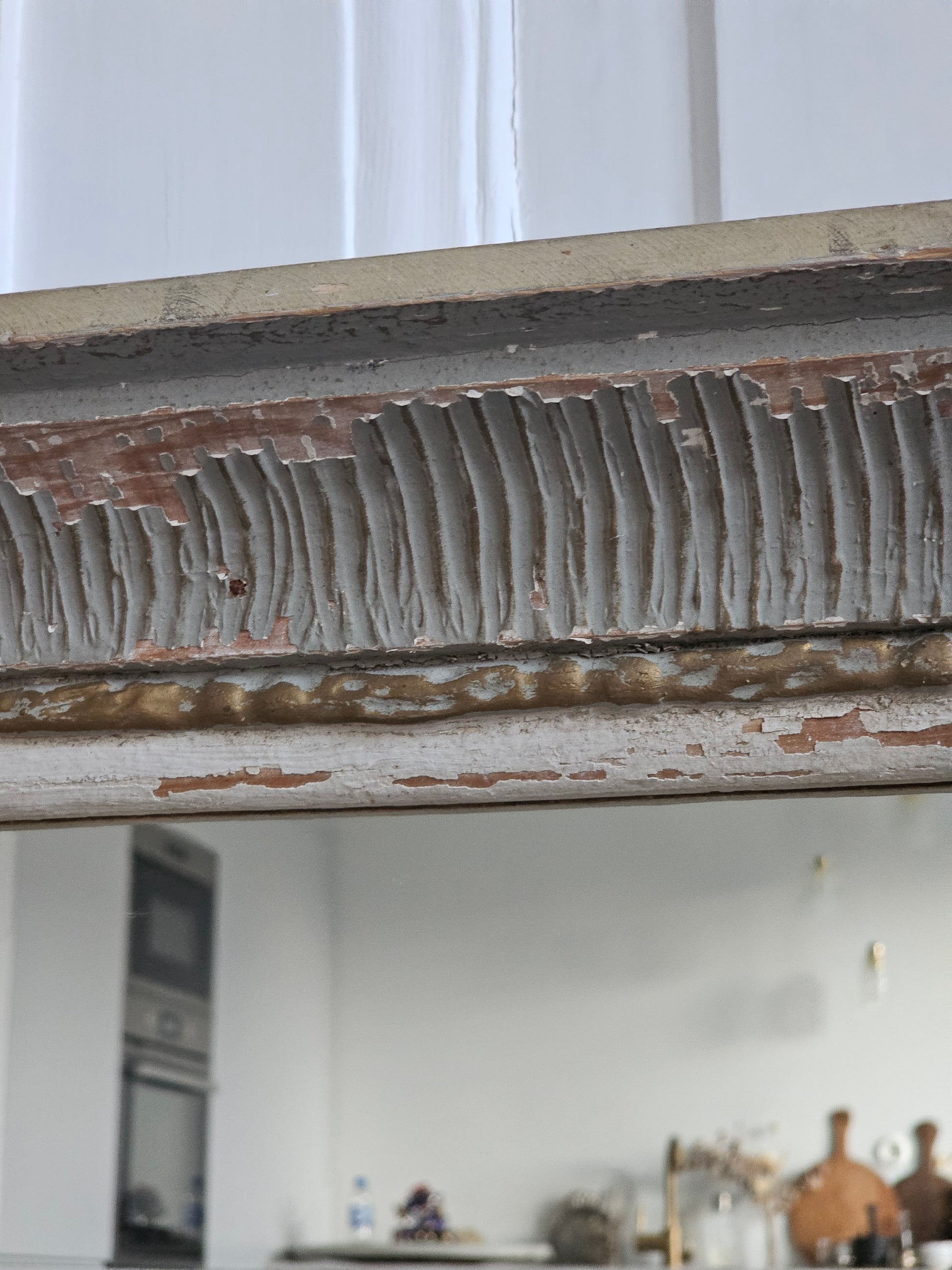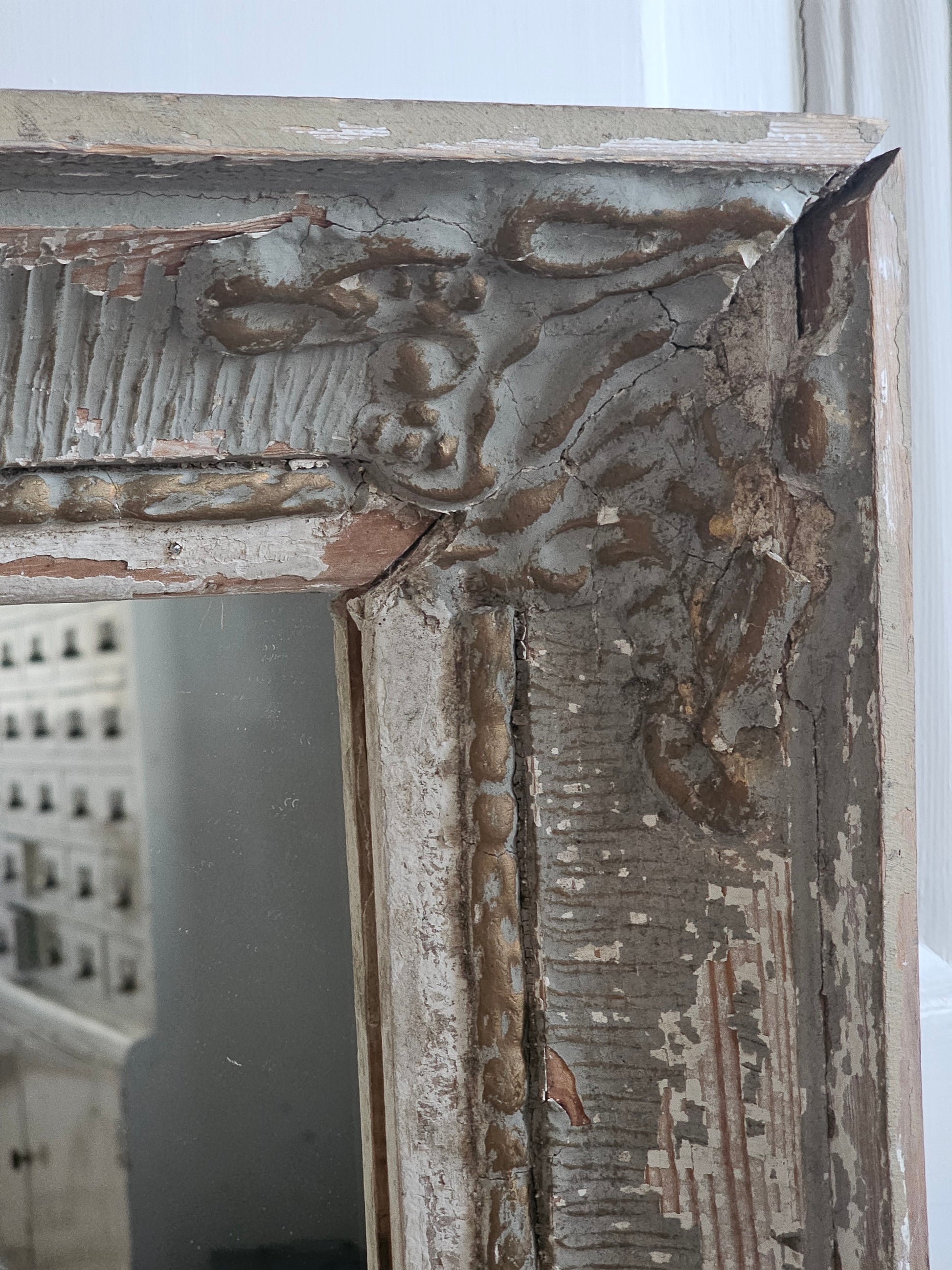 Iso ja kaunis ranskalaishenkinen peili puisilla kehyksillä. Upeissa kehyksissä on kipsisiä koristeita, jotka ovat kuluneet. Vihertävän harmaa maalipinta on krakeloituneet hienosti. Peililasi on uusi ja täysin kirkas.