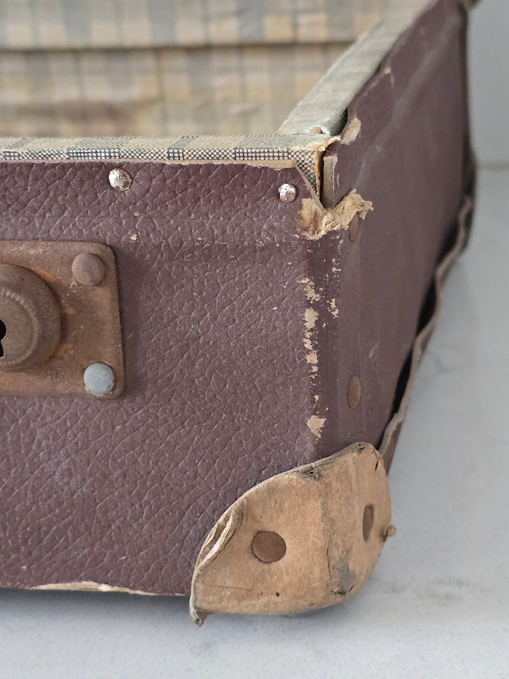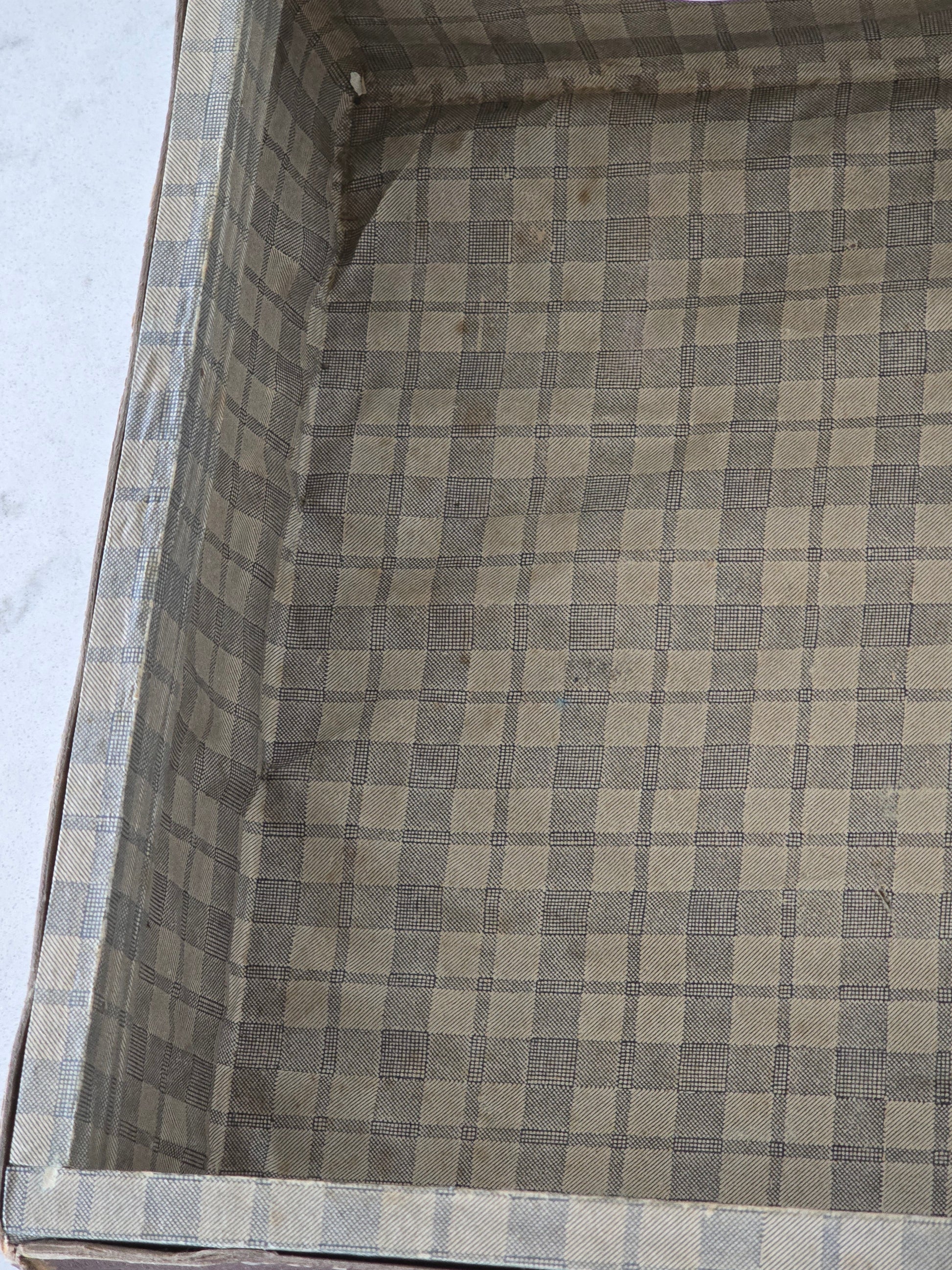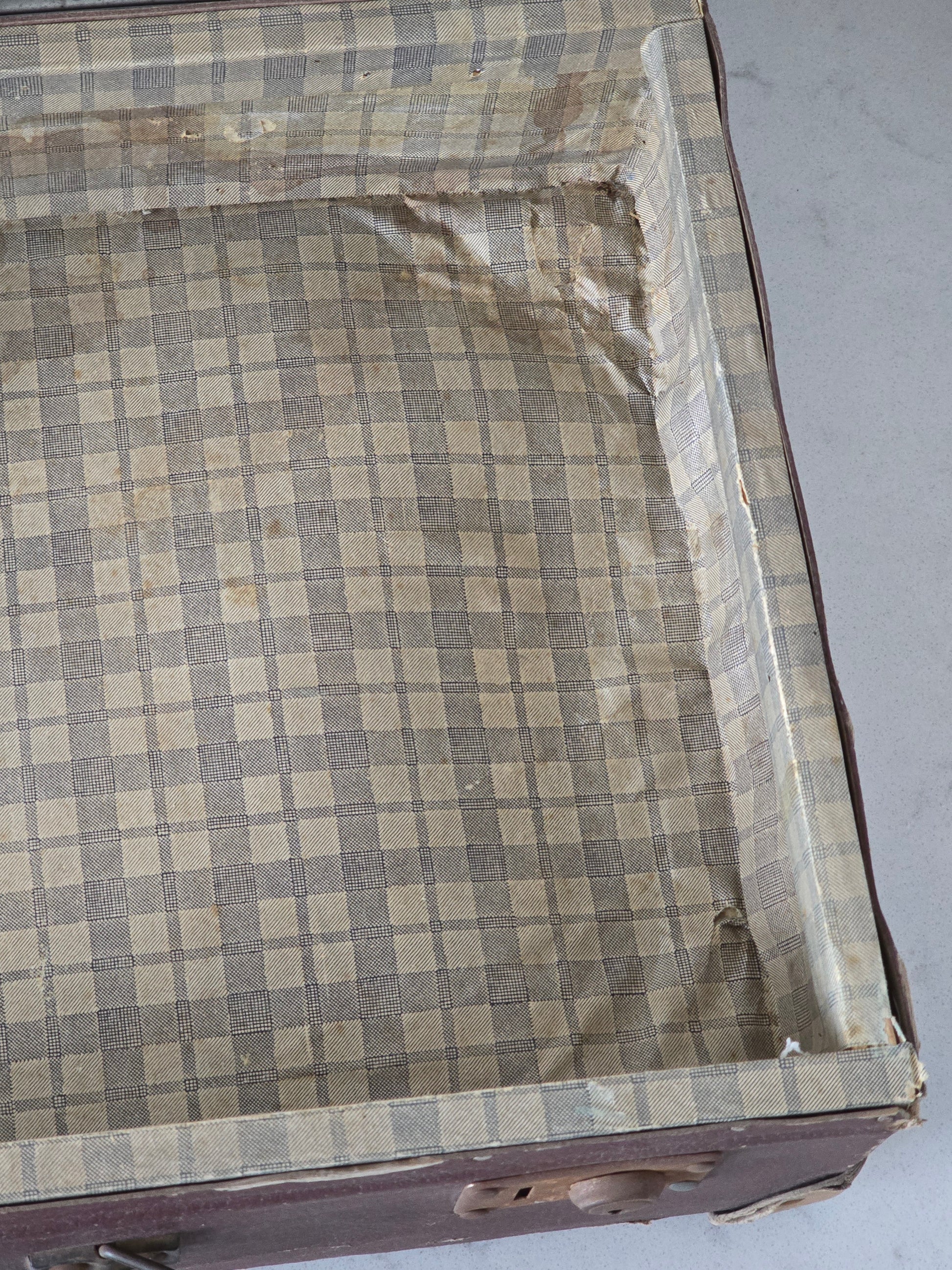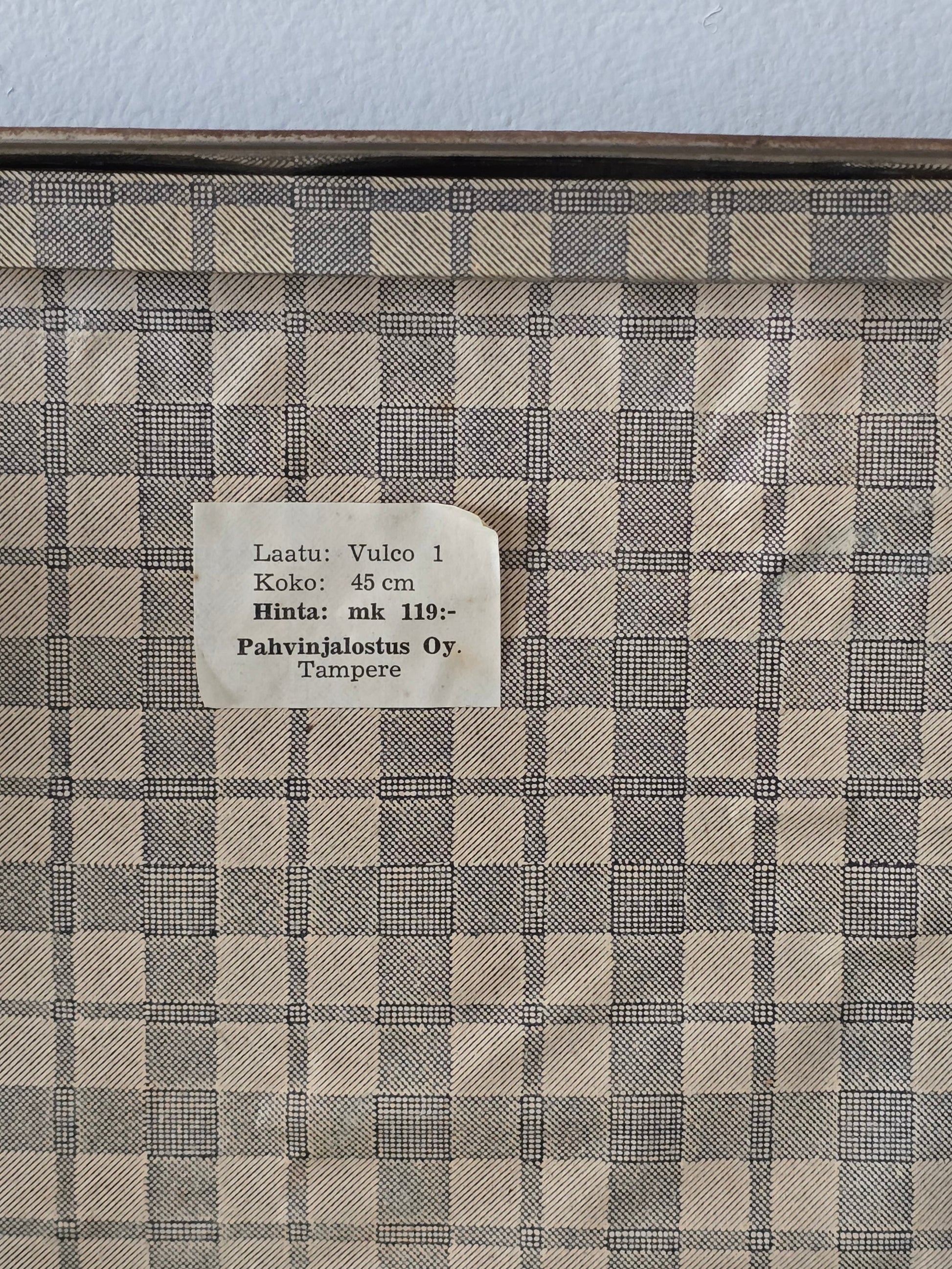 Melkoisen pieni vanha patinoitunut matkalaukku. Laukku on kovaa pahvia ja siinä on metallisia osia tukemassa kulmia. Sisällä on kaunis ruutukangas, joka tekeekin tästä viehättävän sisustustuotteen. Metalliosista löytyy ruosteisuutta ja patinaa. Alaosa on hieman kuprulla.