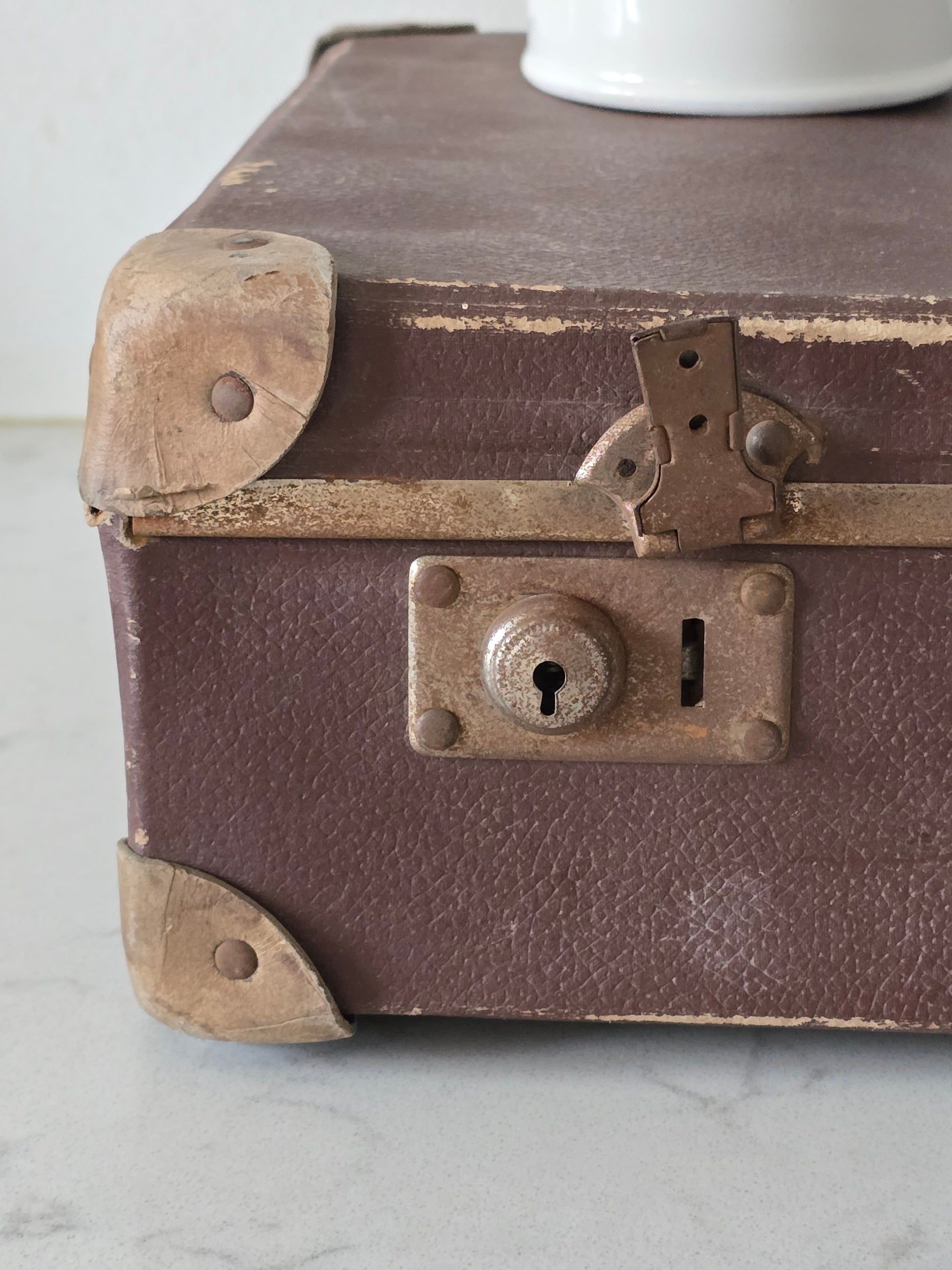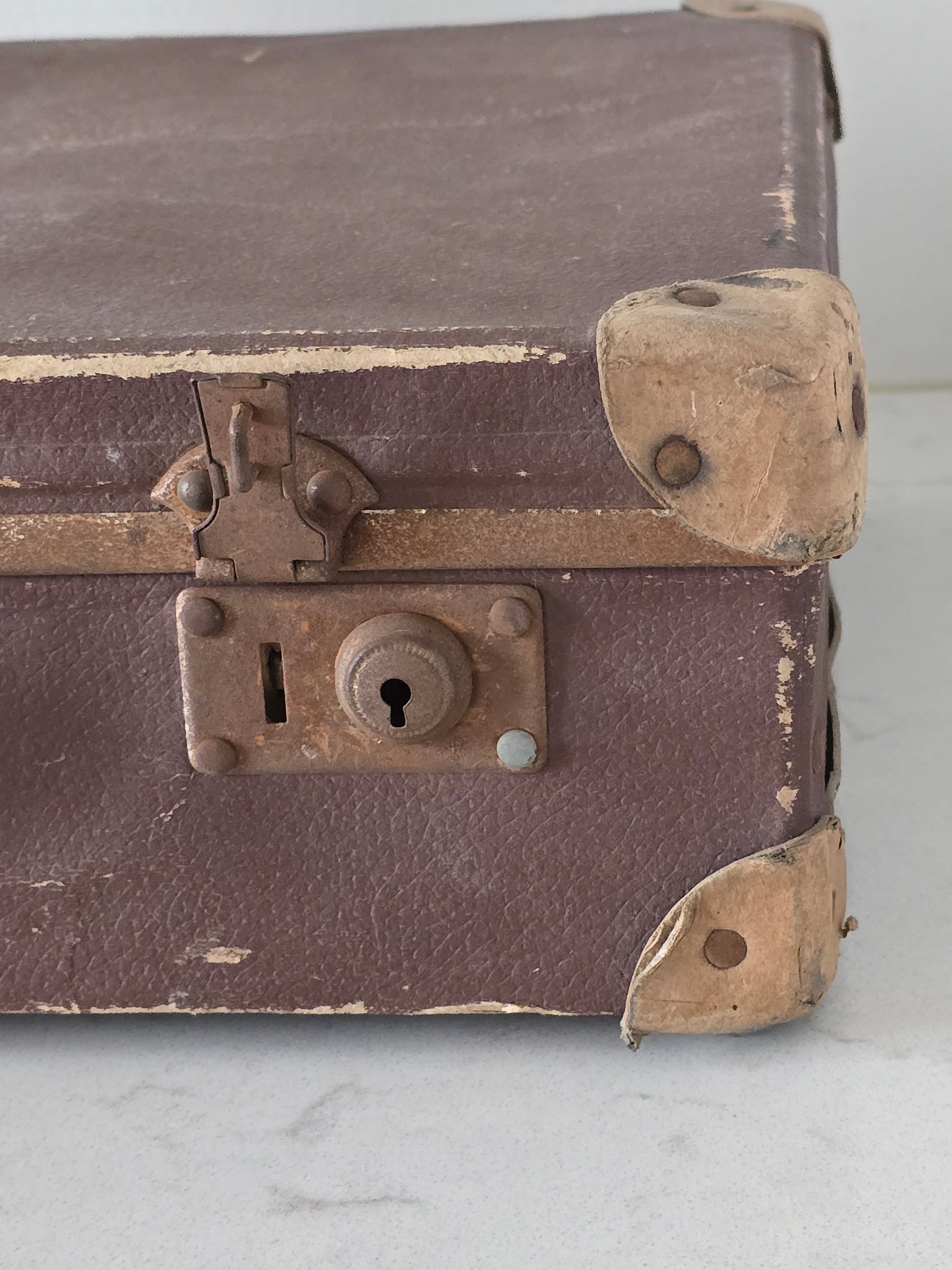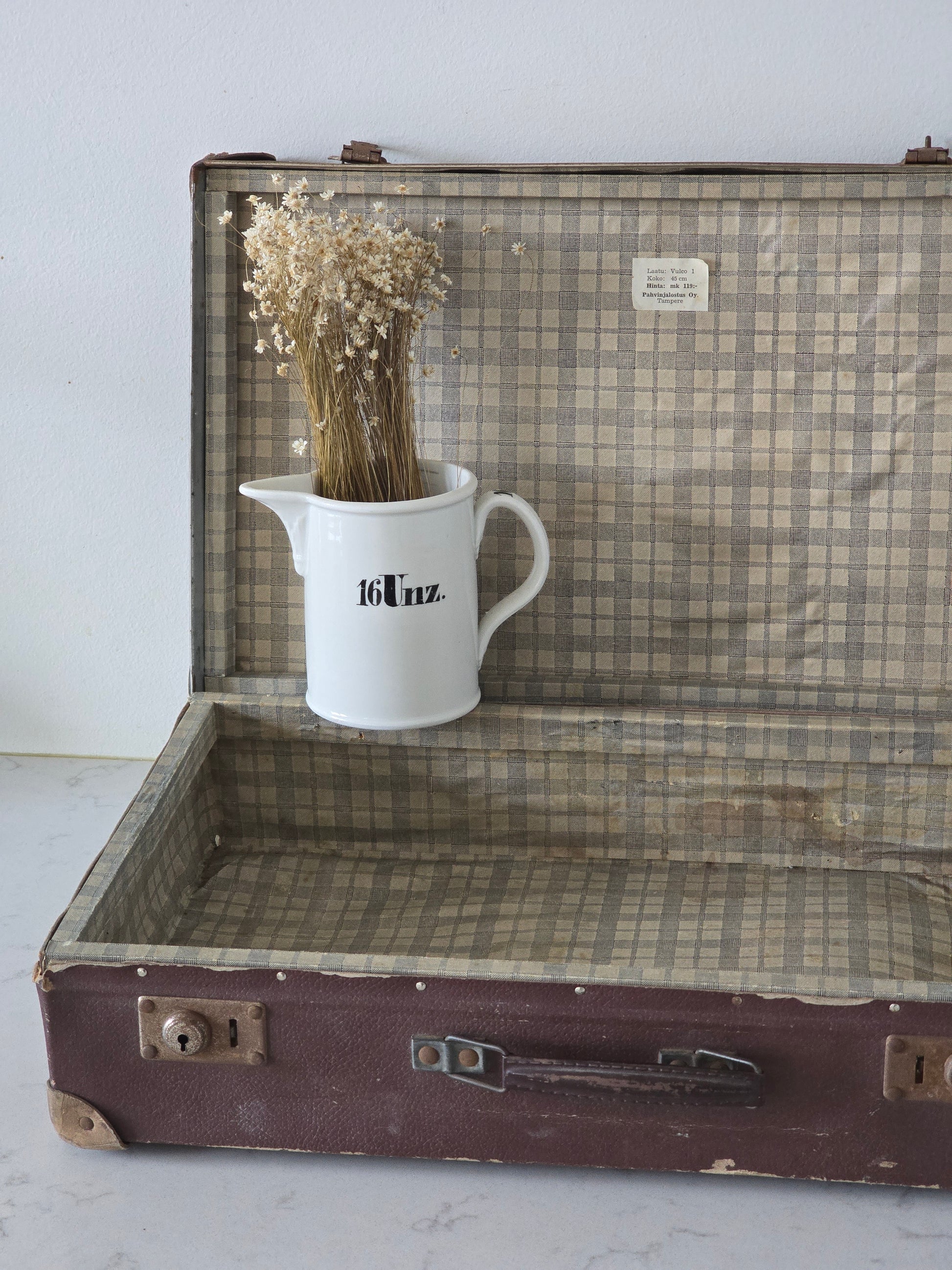 Melkoisen pieni vanha patinoitunut matkalaukku. Laukku on kovaa pahvia ja siinä on metallisia osia tukemassa kulmia. Sisällä on kaunis ruutukangas, joka tekeekin tästä viehättävän sisustustuotteen. Metalliosista löytyy ruosteisuutta ja patinaa. Alaosa on hieman kuprulla.