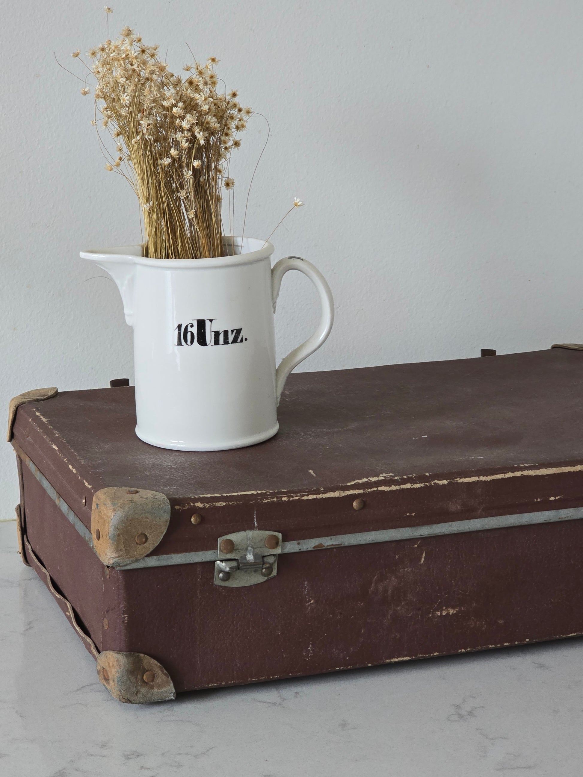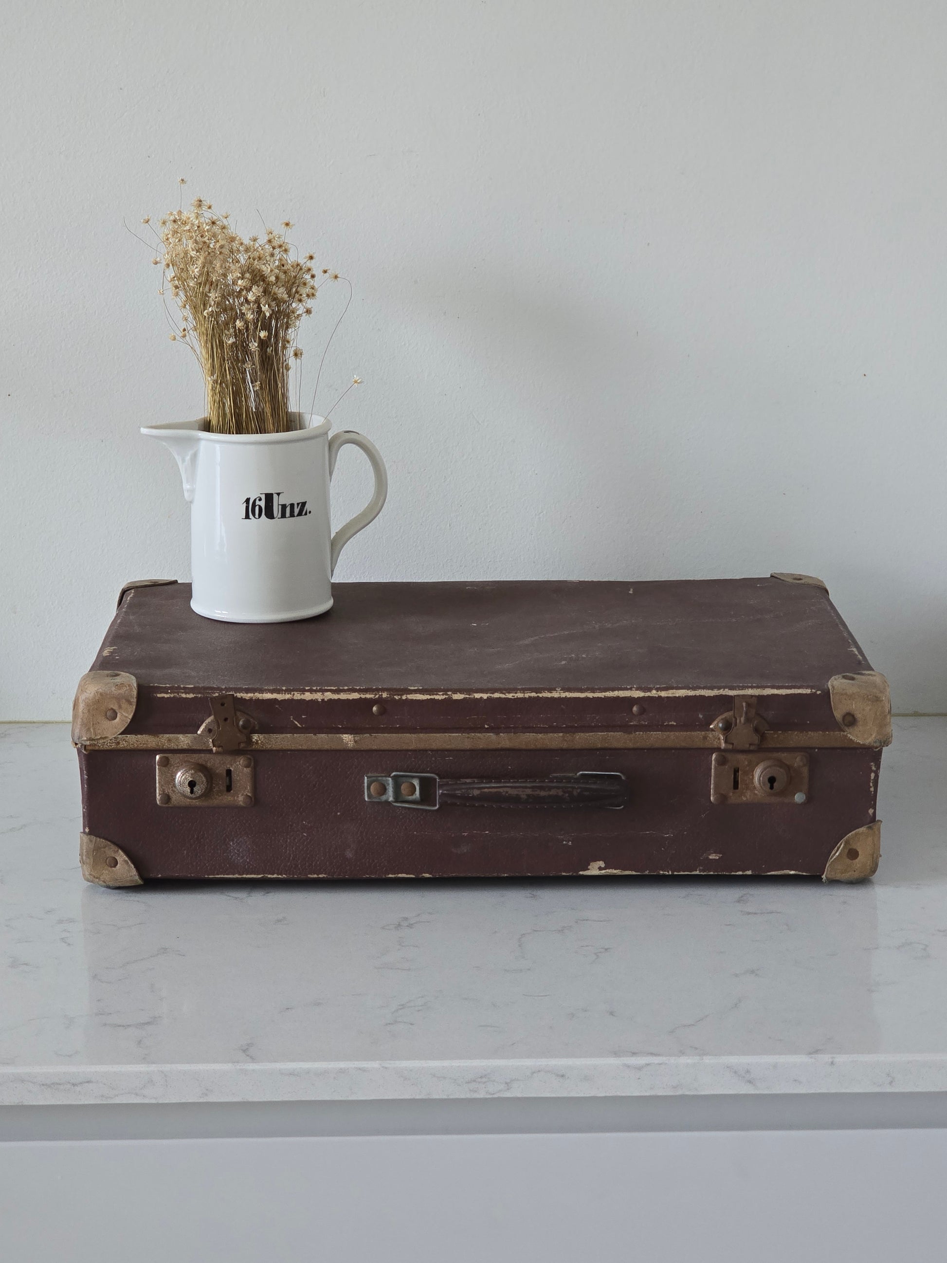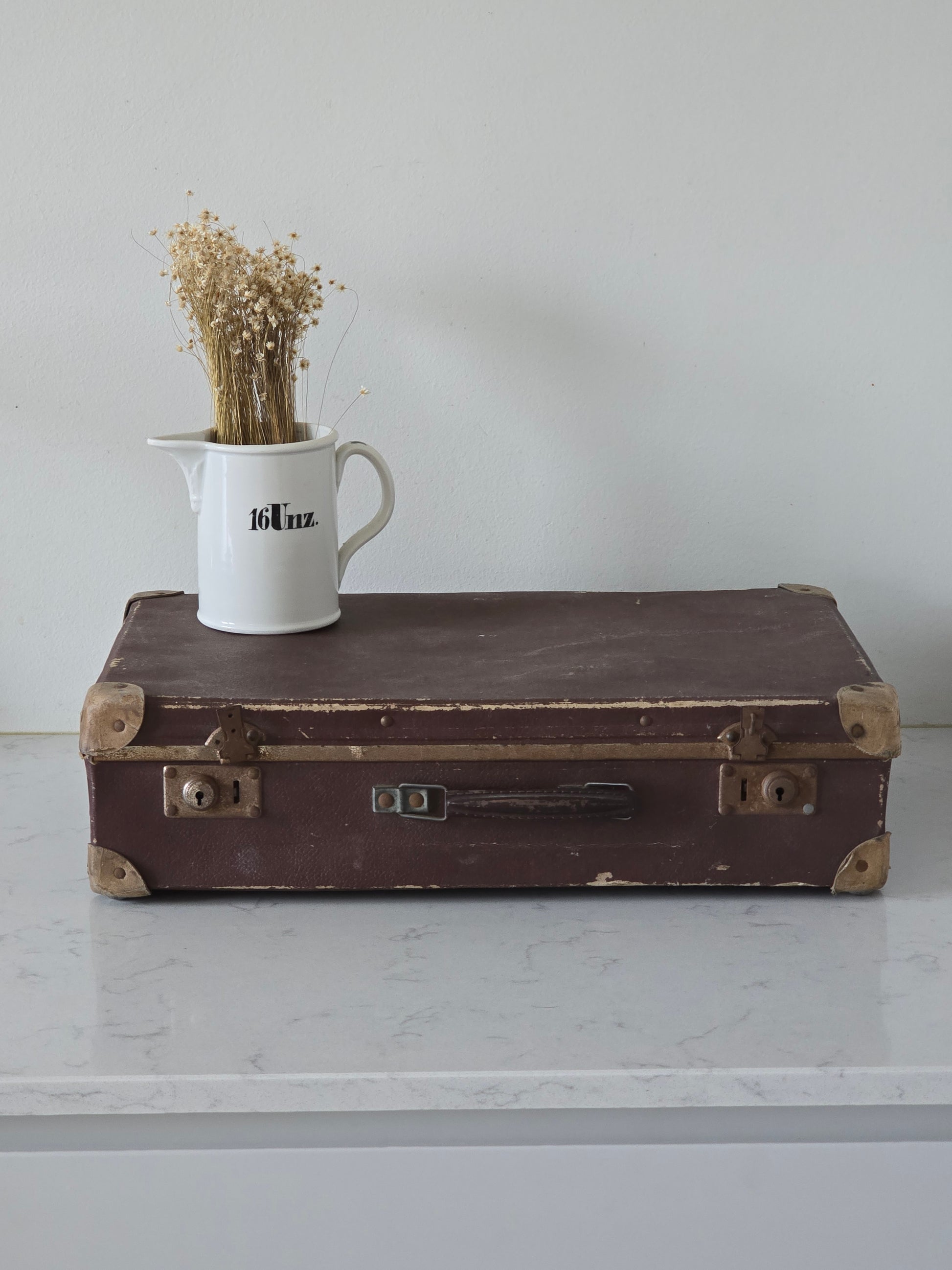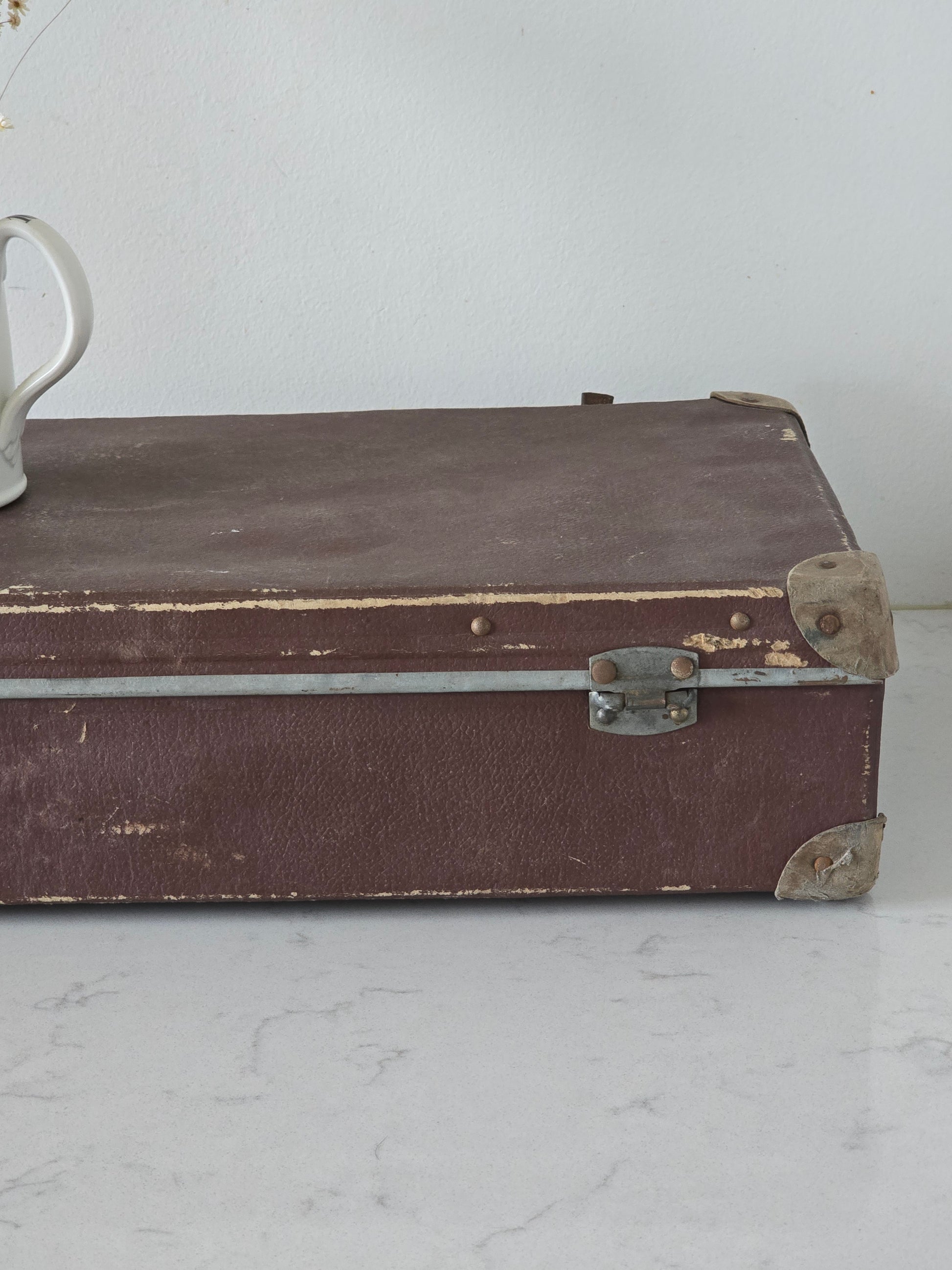 Melkoisen pieni vanha patinoitunut matkalaukku. Laukku on kovaa pahvia ja siinä on metallisia osia tukemassa kulmia. Sisällä on kaunis ruutukangas, joka tekeekin tästä viehättävän sisustustuotteen. Metalliosista löytyy ruosteisuutta ja patinaa. Alaosa on hieman kuprulla.