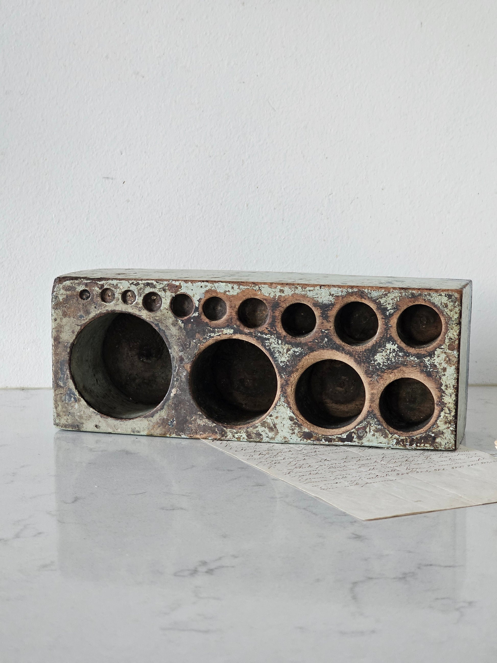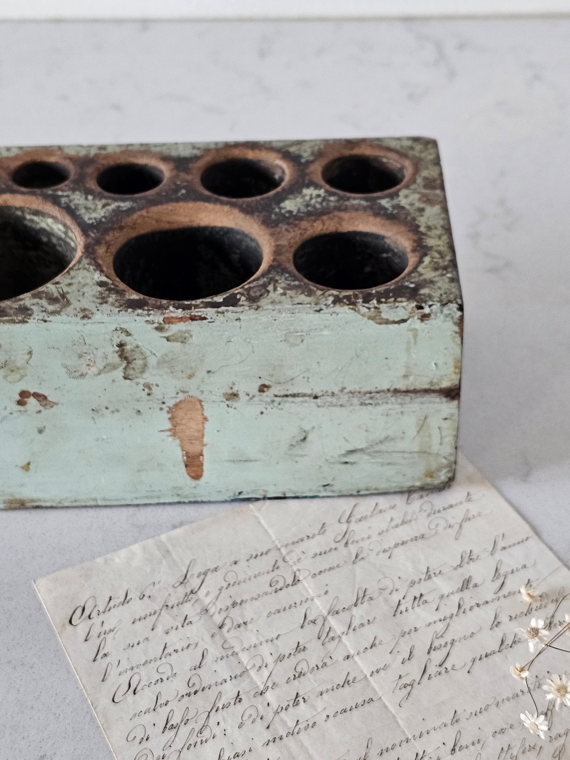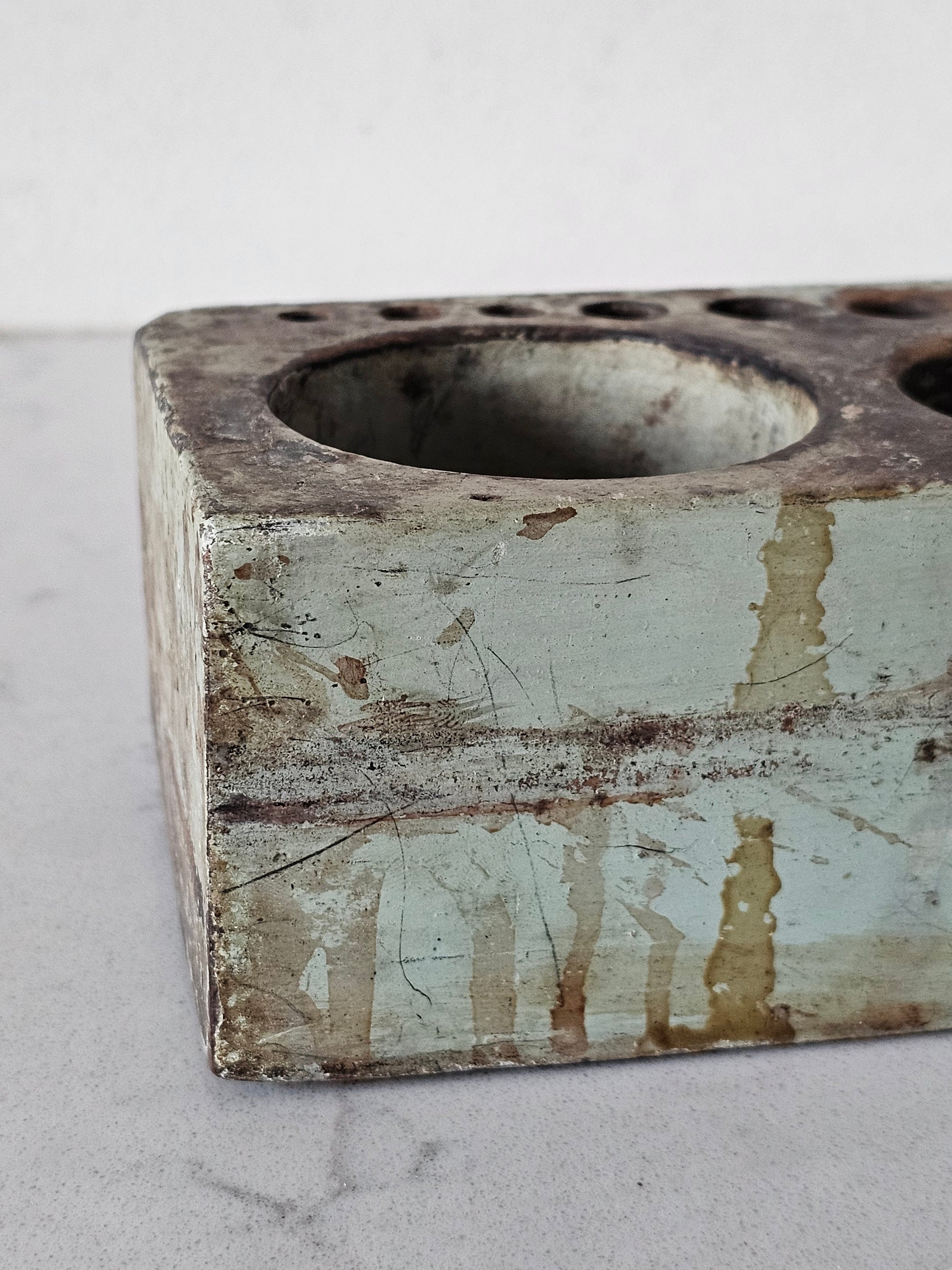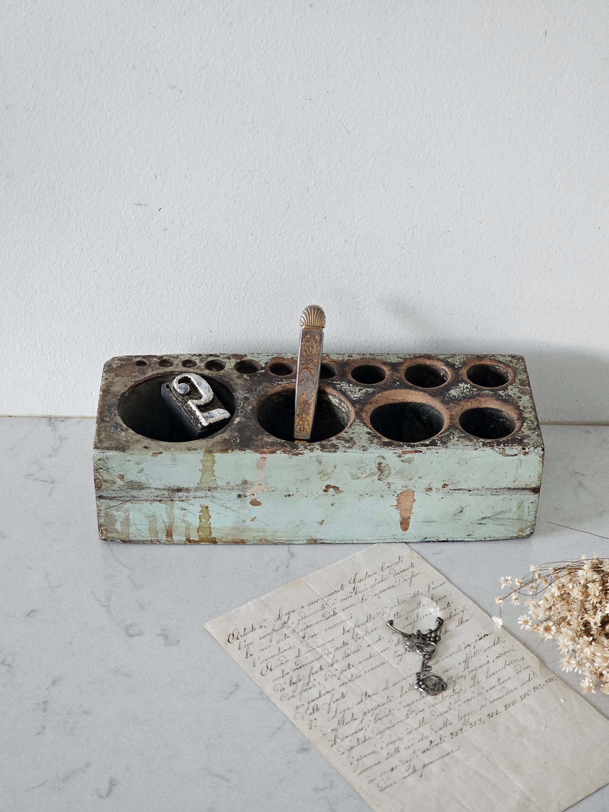 Todella kauniisti ajan patinoima puinen punnusteline. Sopii upeasti esimerkiksi rustiikkiseksi kynätelineeksi