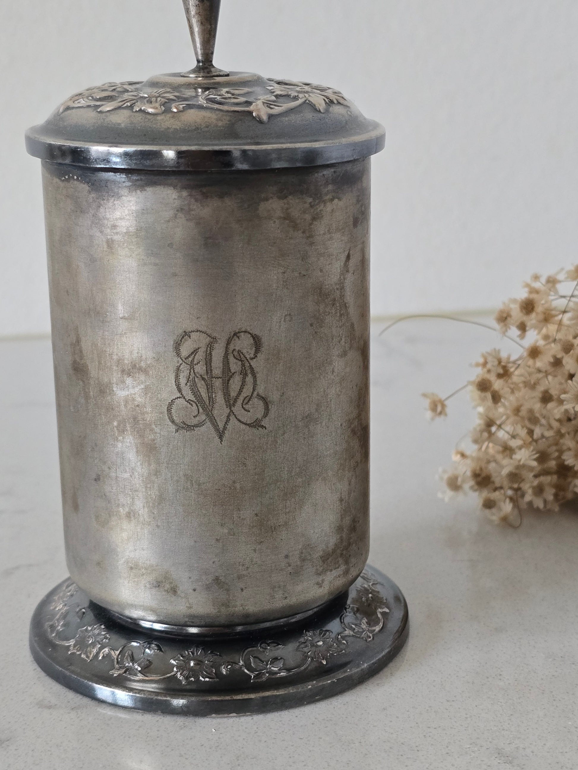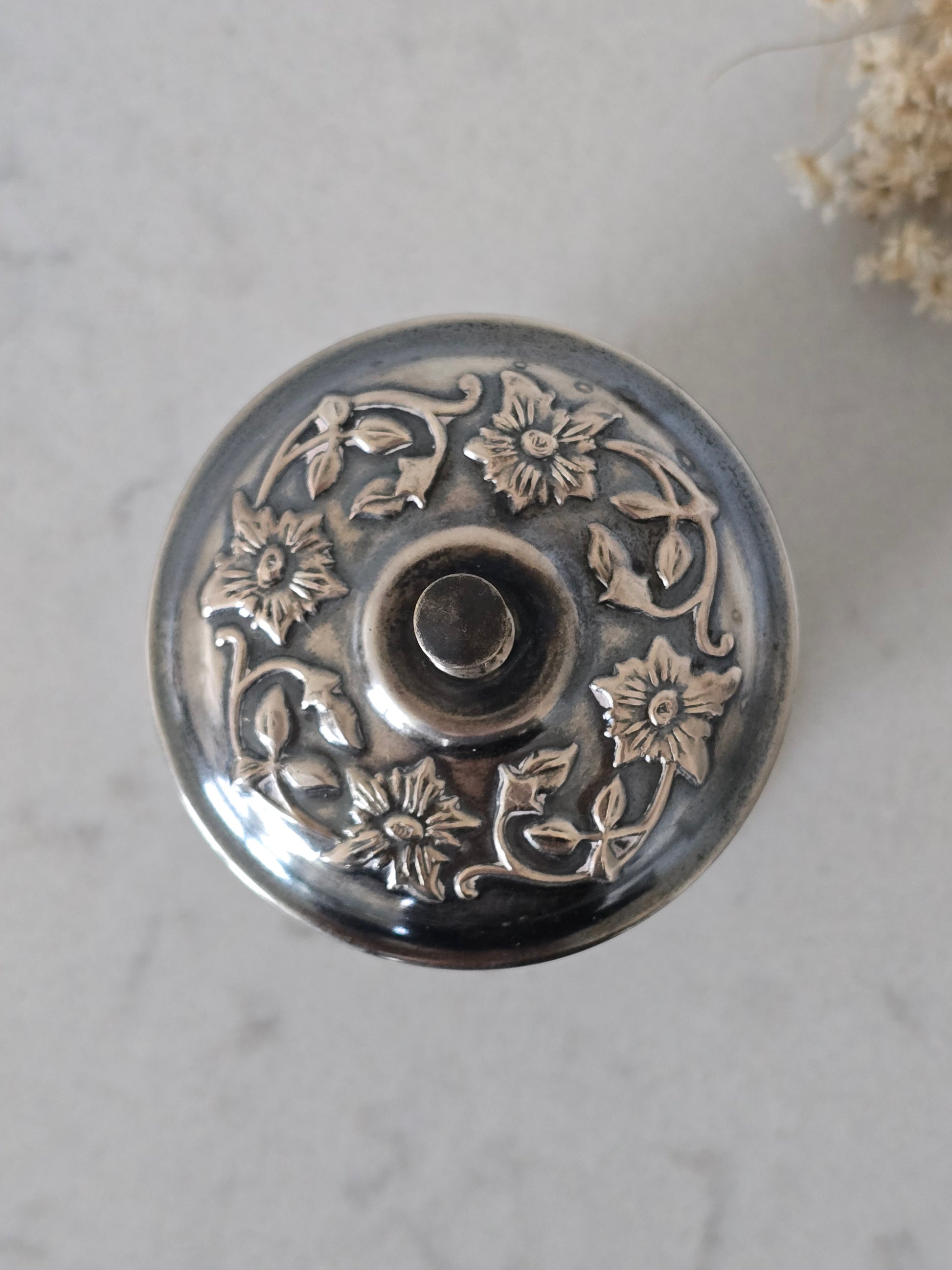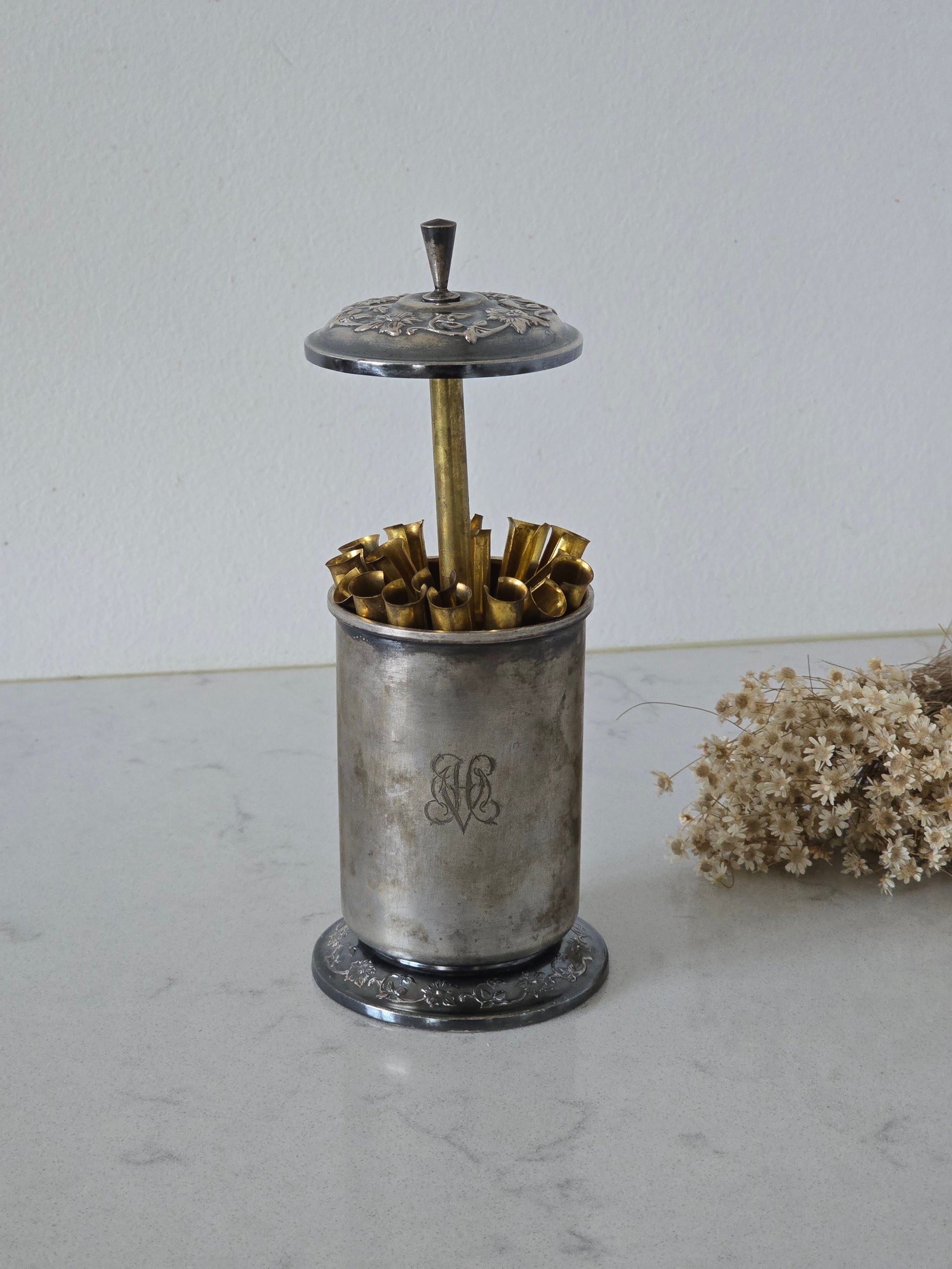 Vanha kauniisti koristeltu savukerasia. Nostamalla nuppia, avautuu savuketelineet. Pinnassa kaunis kaiverrus. Telineet ovat ajan kanssa löystyneet eli eivät ole tiukasti toisissaan kiinni. Palvelee kuitenkin käytössä normaalisti.