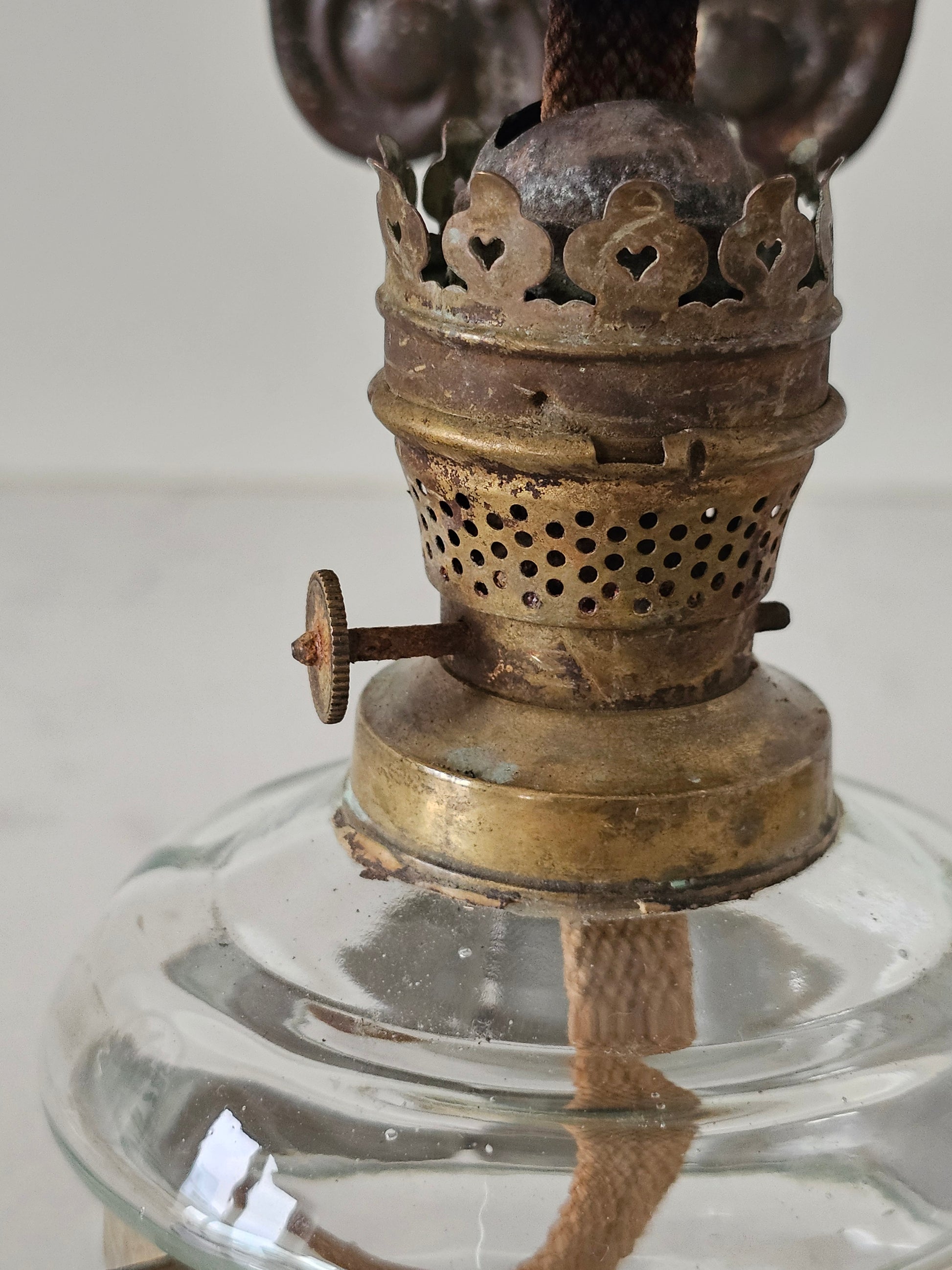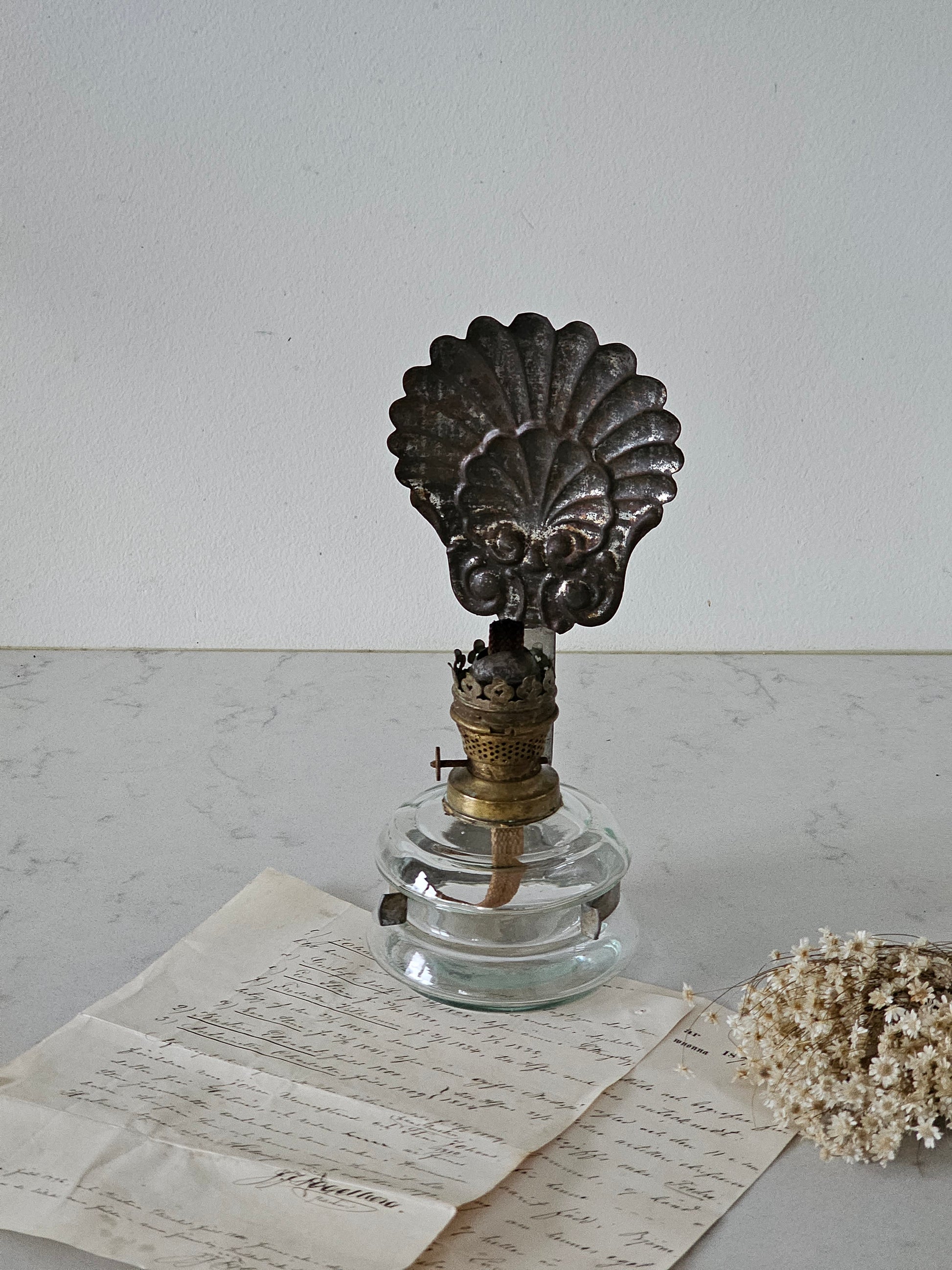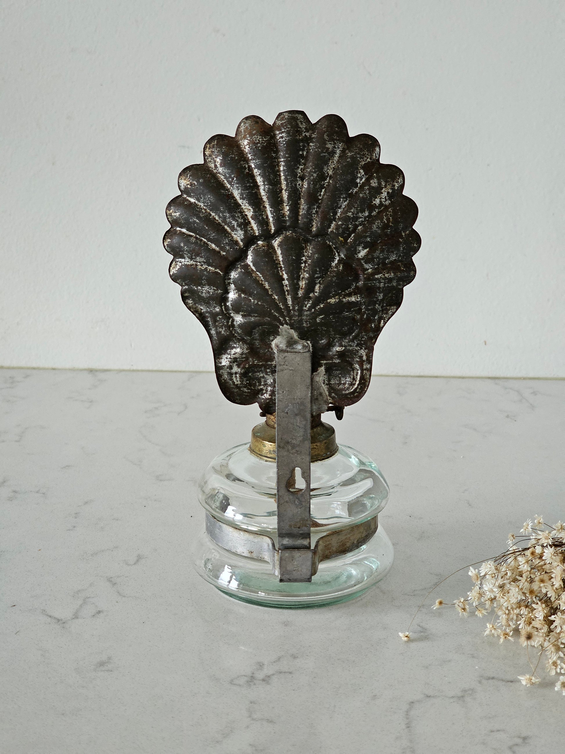 Toimiva simpukanmuotoinen öljylamppu. Lampun metalliosan saa kierteellä auki, jolloin sisään saa lisättyä lamppuöljyä. Myös sydännarua saa pyöritettyä rullasta lisää, vaikka rulla on hieman jäykkä.