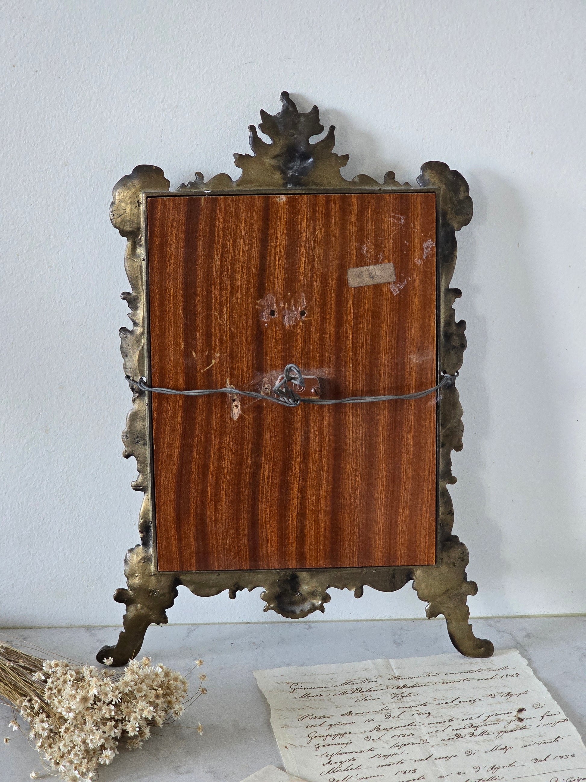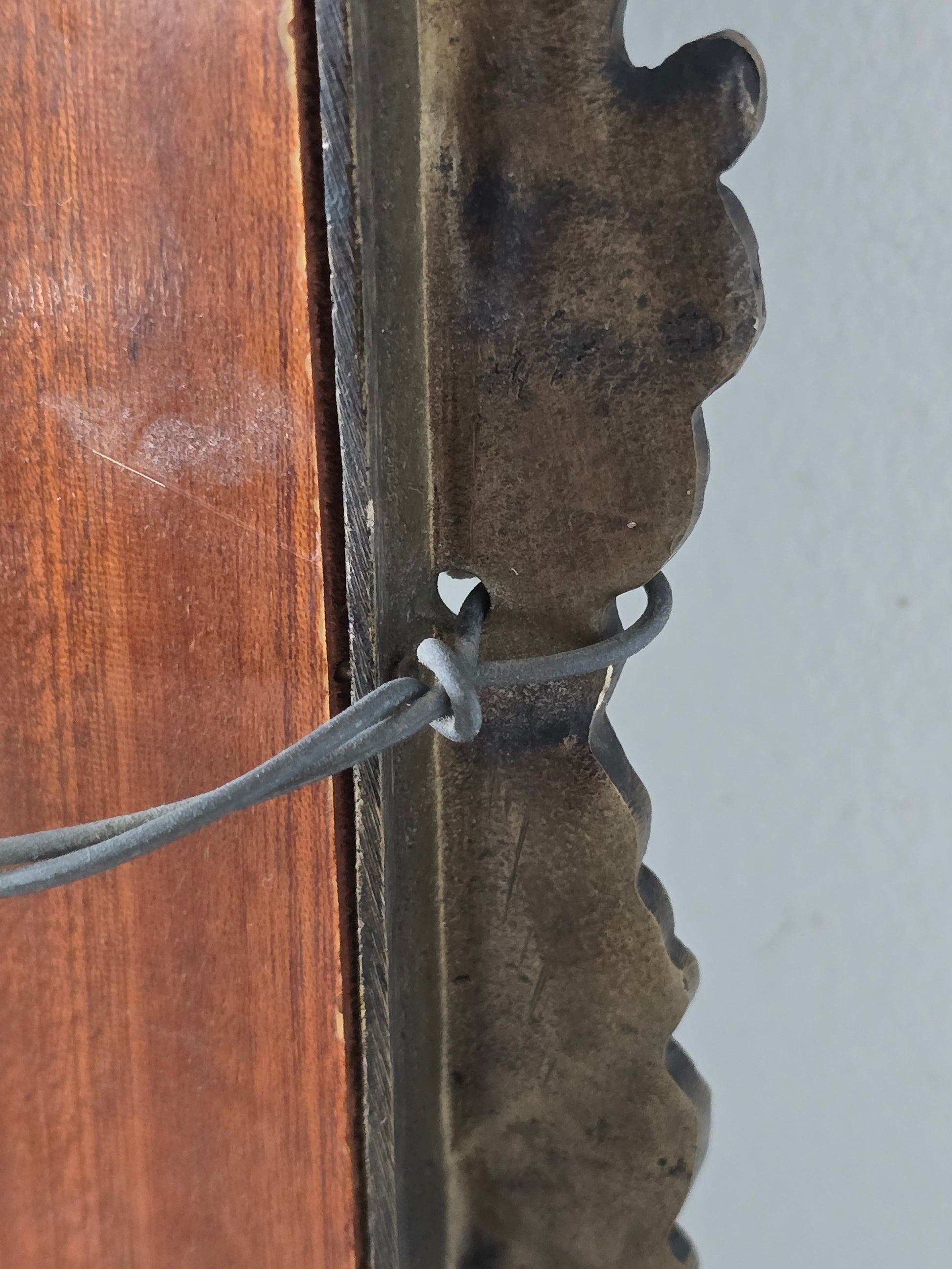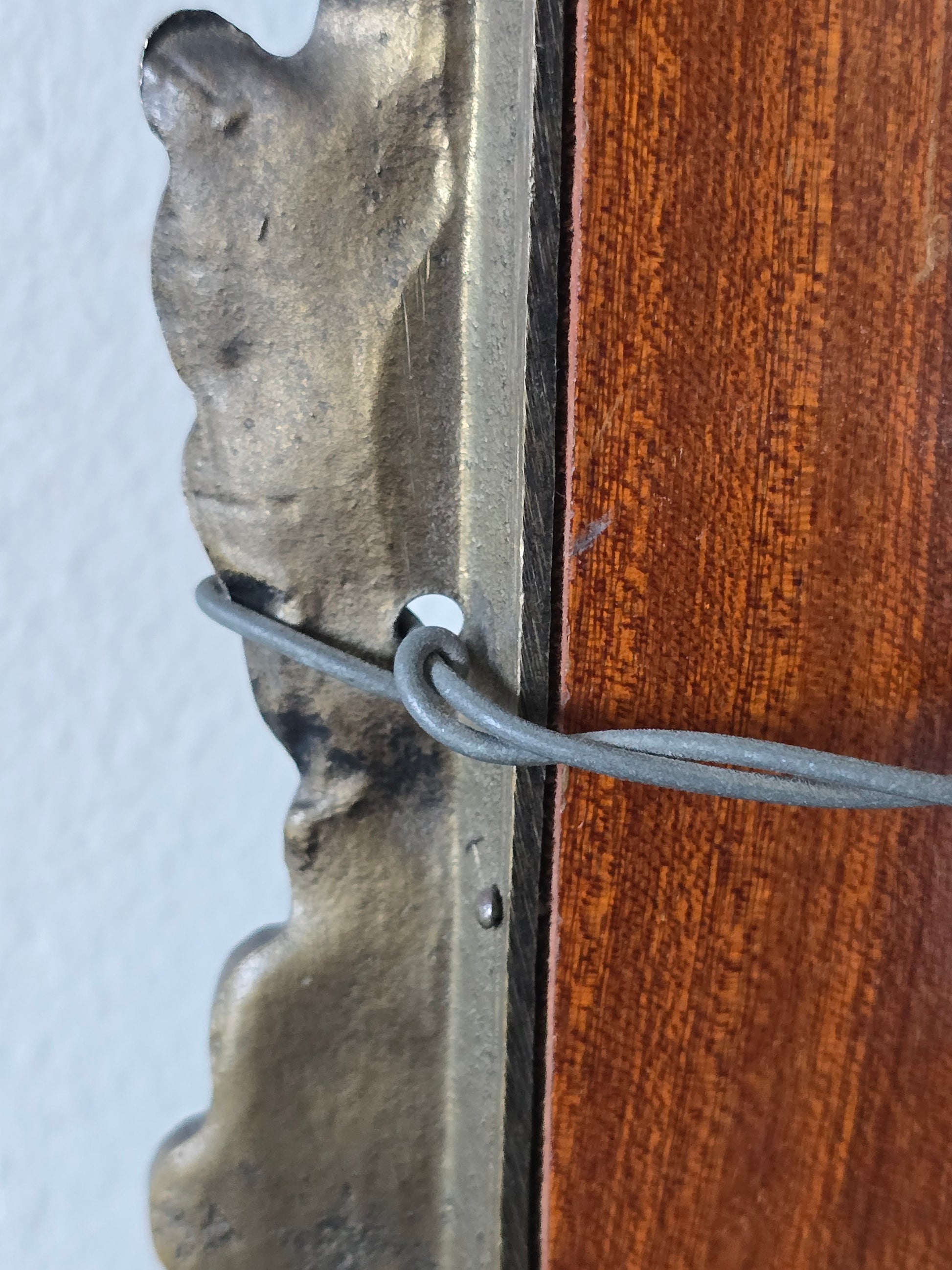 Tämä alun perin jalalla seisova simpukkakoristeinen peili toimii tänä päivänä seinäpeilinä. Messinginvärinen peili on kokoisekseen todella painava. Peiliosassa jonkin verran pieniä jälkiä, mutta yleisesti se on hyväkuntoinen. Peilin molemmissa reunoissa on reiät, johon voi valita rautalangan sijaan myös kettingin kannattelemaan sitä.