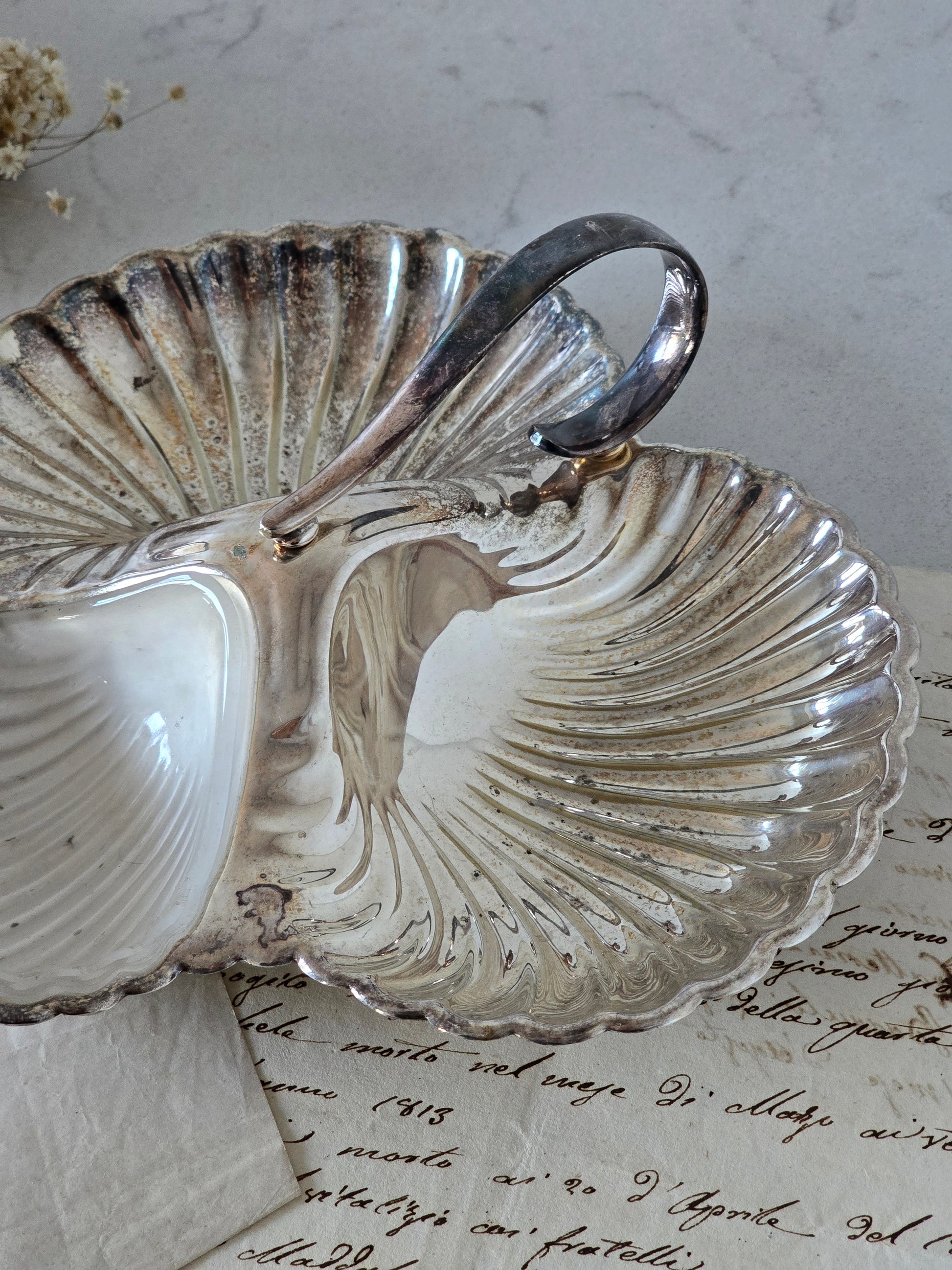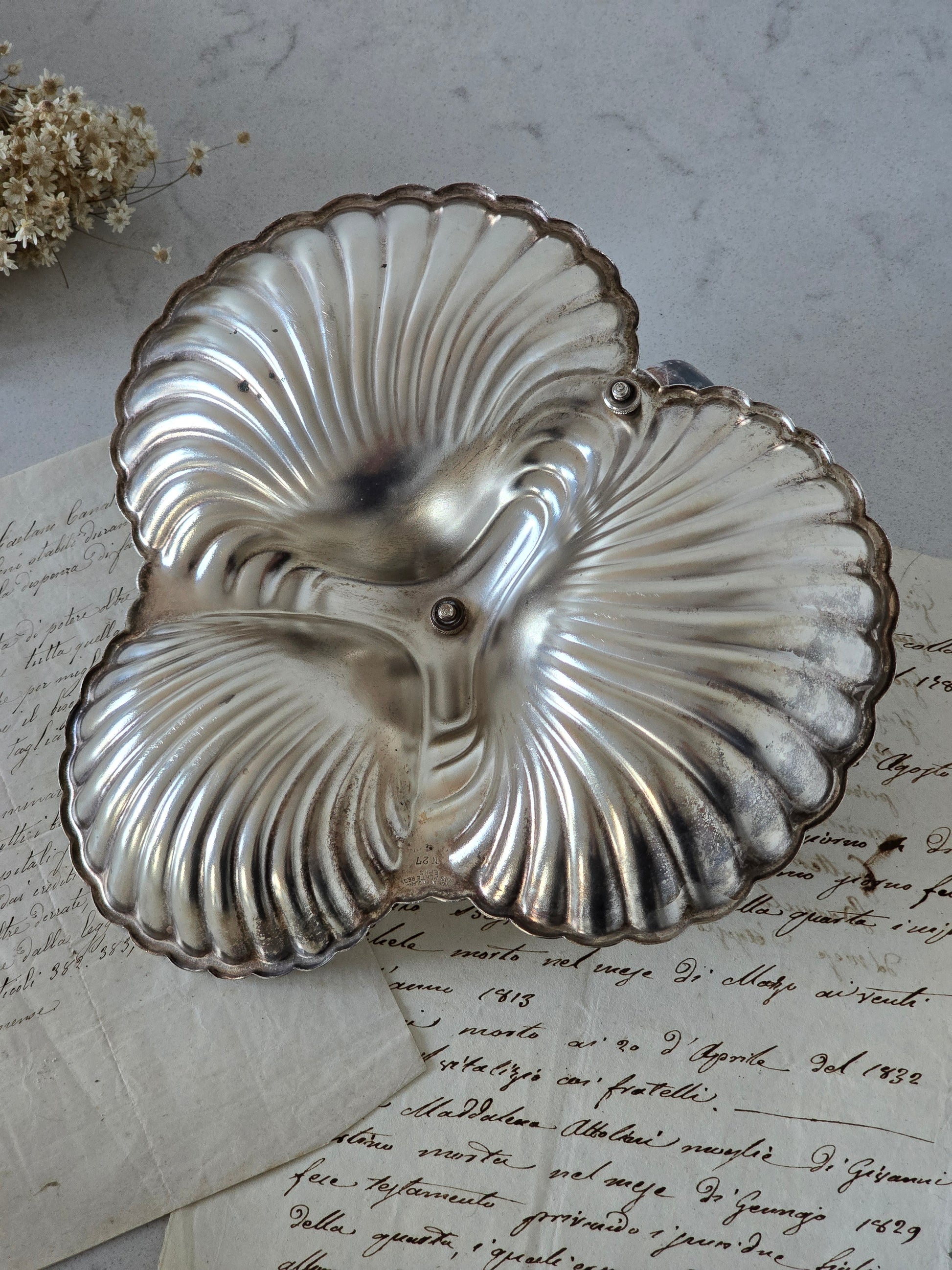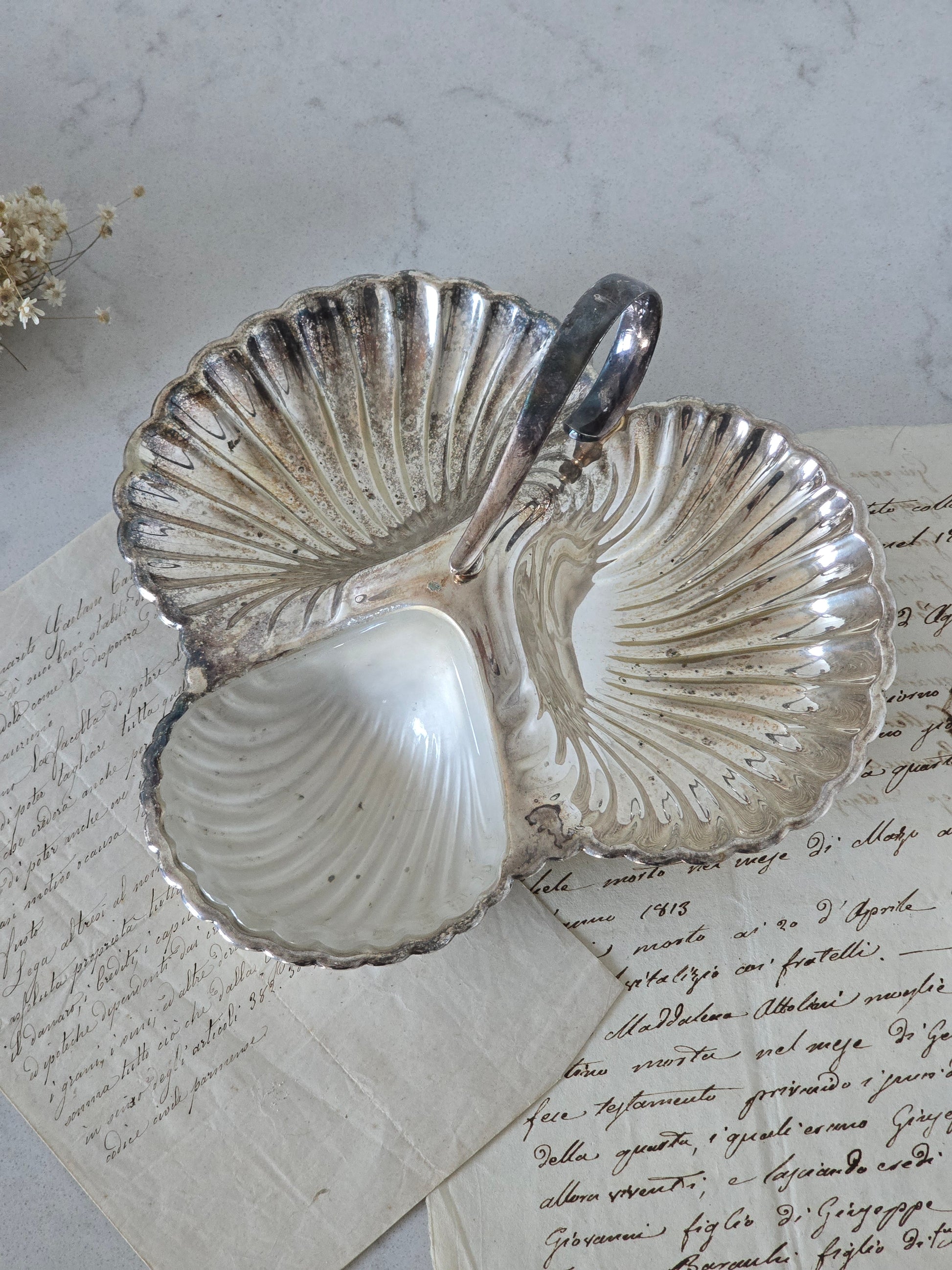 Tämä italialainen kaunokainen on patinoitunut kauniisti ja sen yhden osan tarjoiluastia on säilynyt täysin ehjänä. Tähän olisi upeaa laittaa ruoka-aineita tarjolle kattaukseen. Nämä moniosaiset simpukat ovat näyttäviä ja sopivat monenlaiseen käyttöön. Käsikahvan avulla astiaa voi liikutella helposti paikasta toiseen.