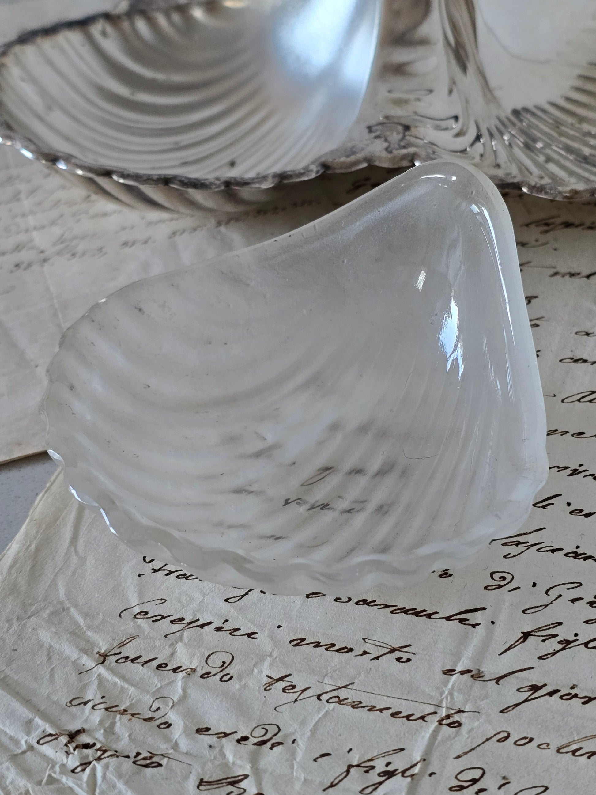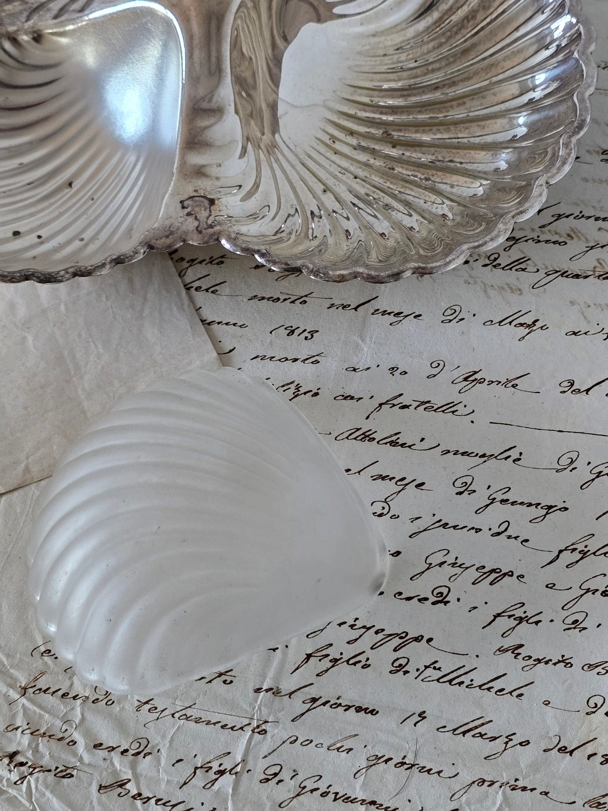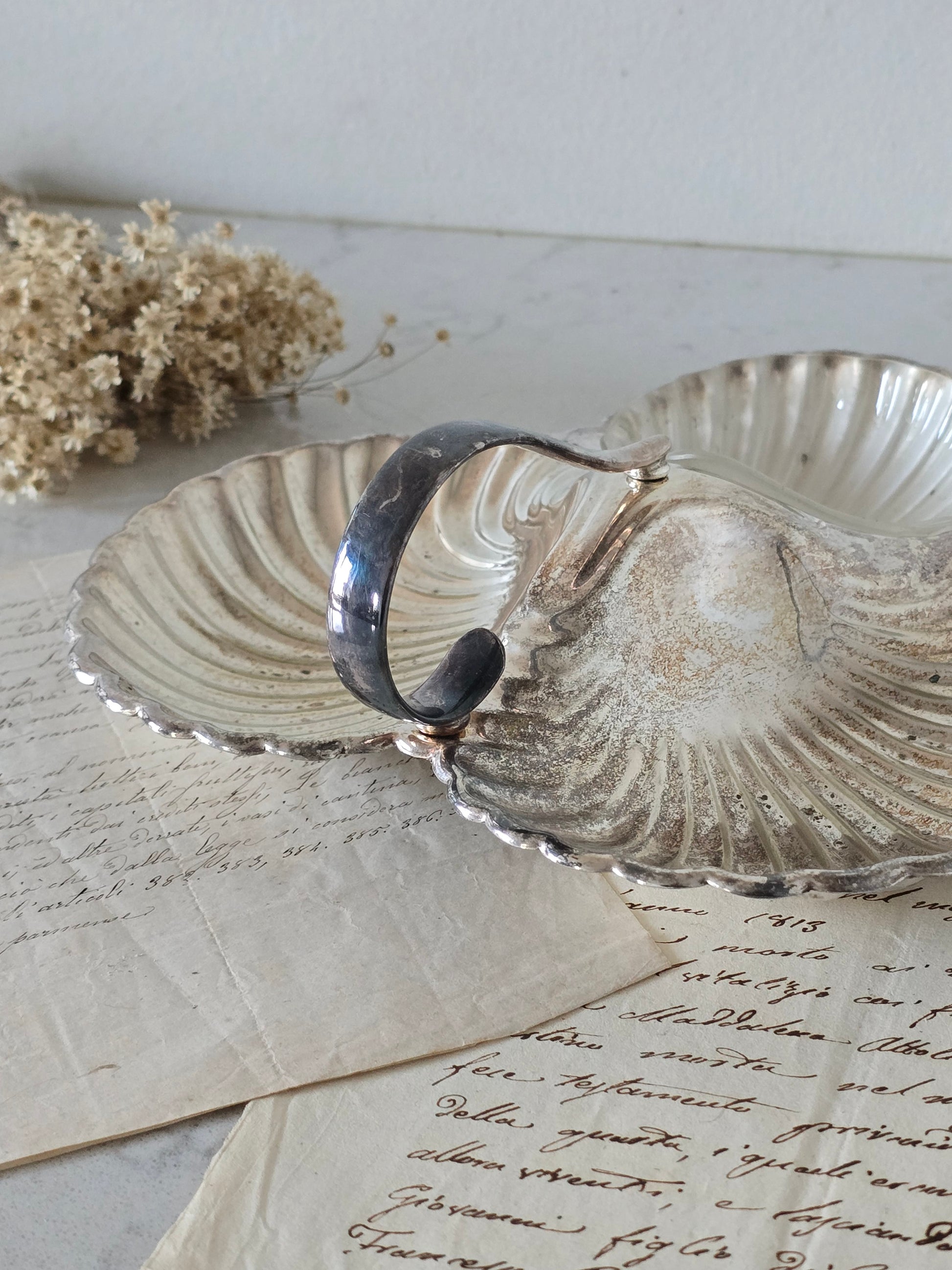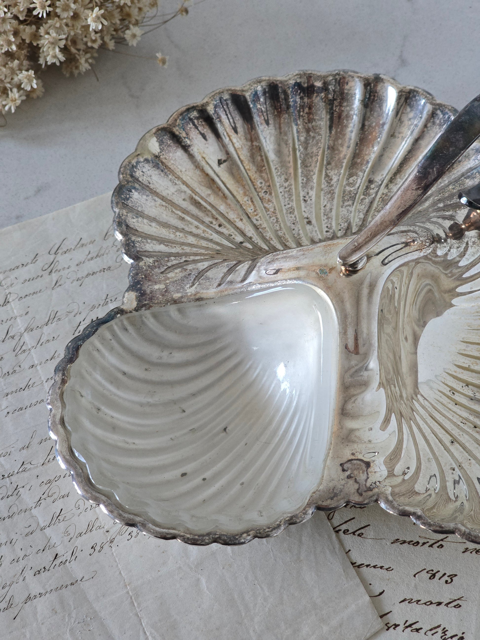 Tämä italialainen kaunokainen on patinoitunut kauniisti ja sen yhden osan tarjoiluastia on säilynyt täysin ehjänä. Tähän olisi upeaa laittaa ruoka-aineita tarjolle kattaukseen. Nämä moniosaiset simpukat ovat näyttäviä ja sopivat monenlaiseen käyttöön. Käsikahvan avulla astiaa voi liikutella helposti paikasta toiseen.