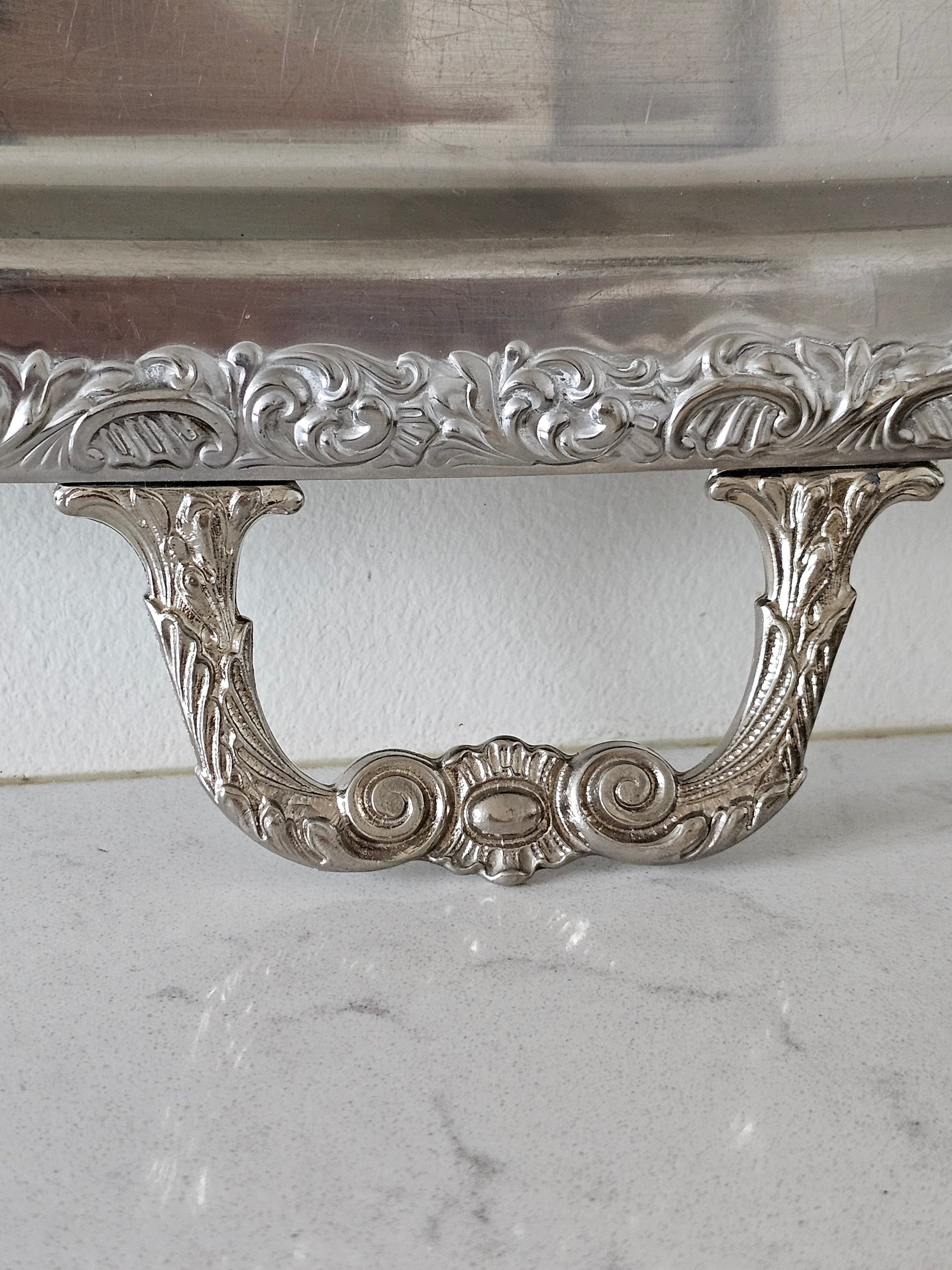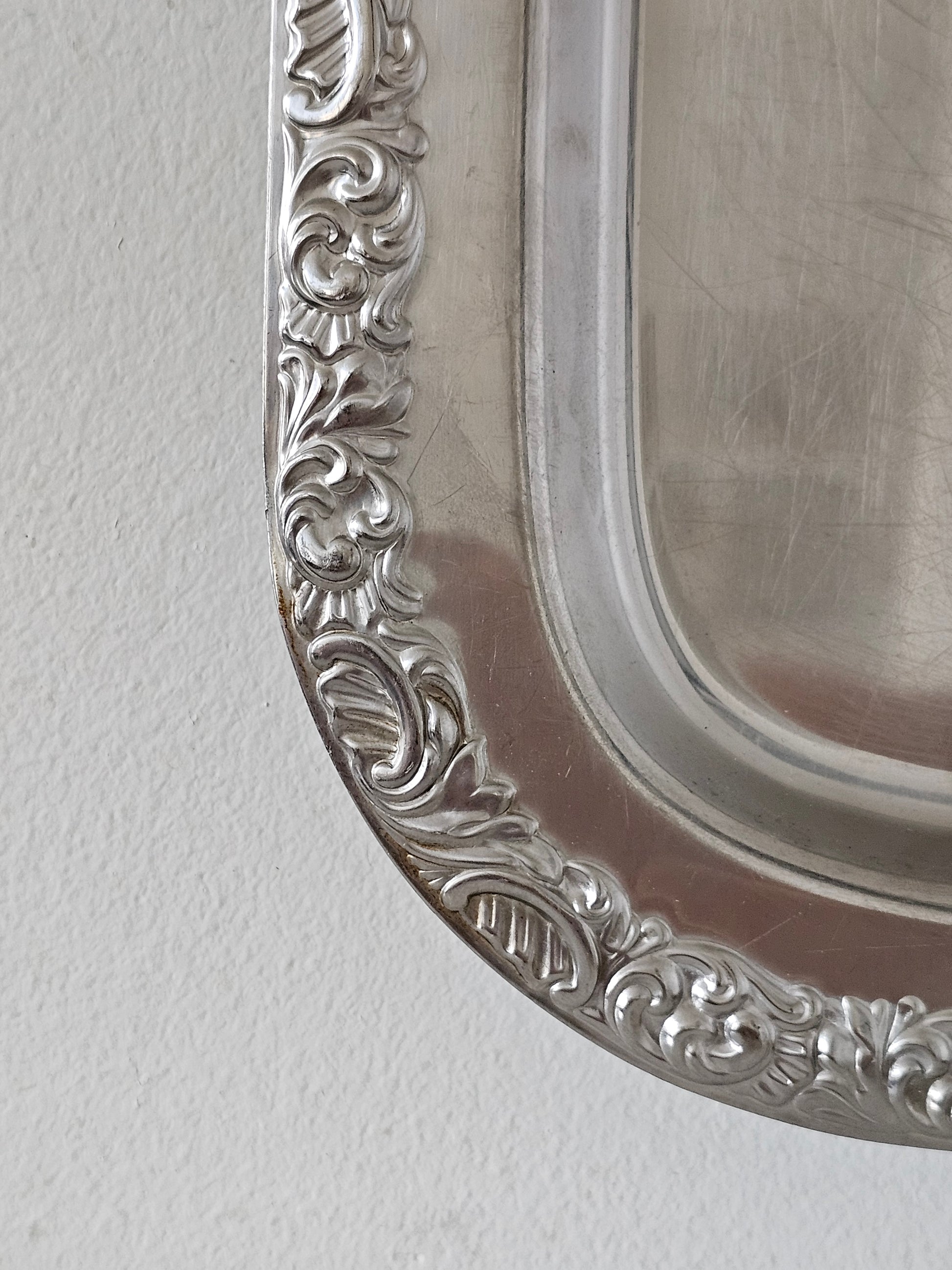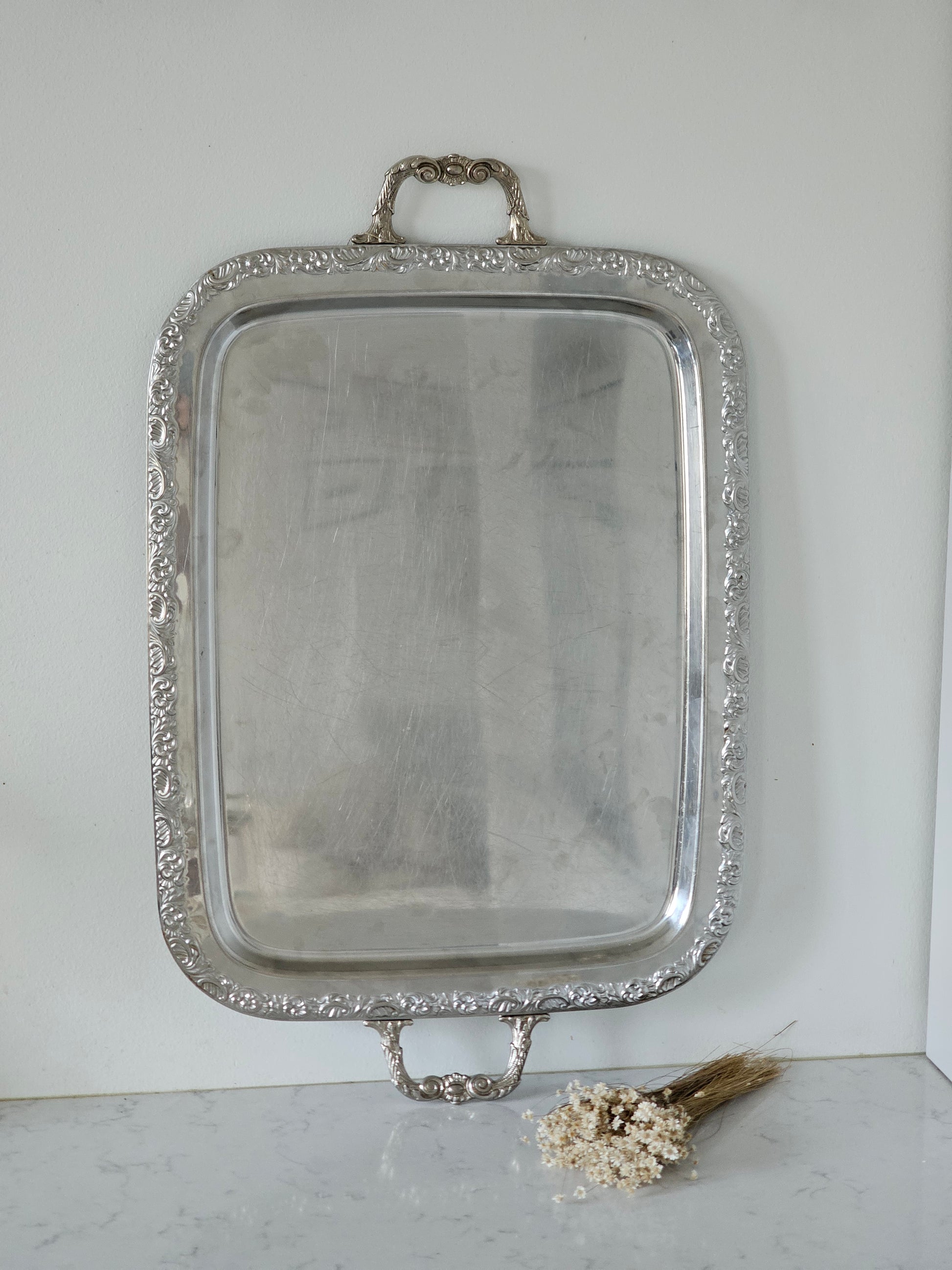 Iso tarjotin vaikkapa jouluruokien tarjoiluun. Yhdessä kulmassa hieman taipumista, mutta muuten hyvässä kunnossa. Käsikahvat ja reunat ovat kauniisti koristeltu.