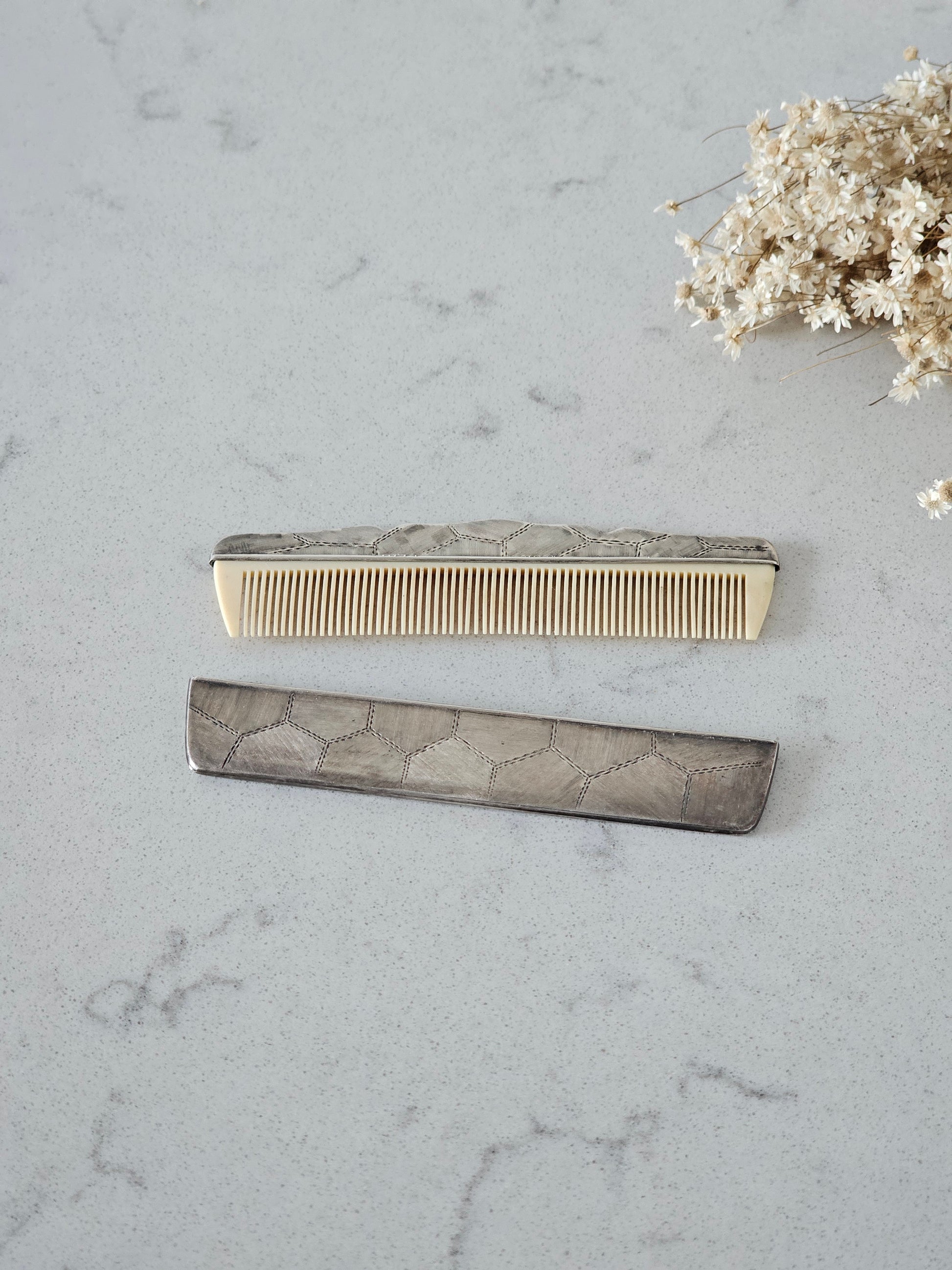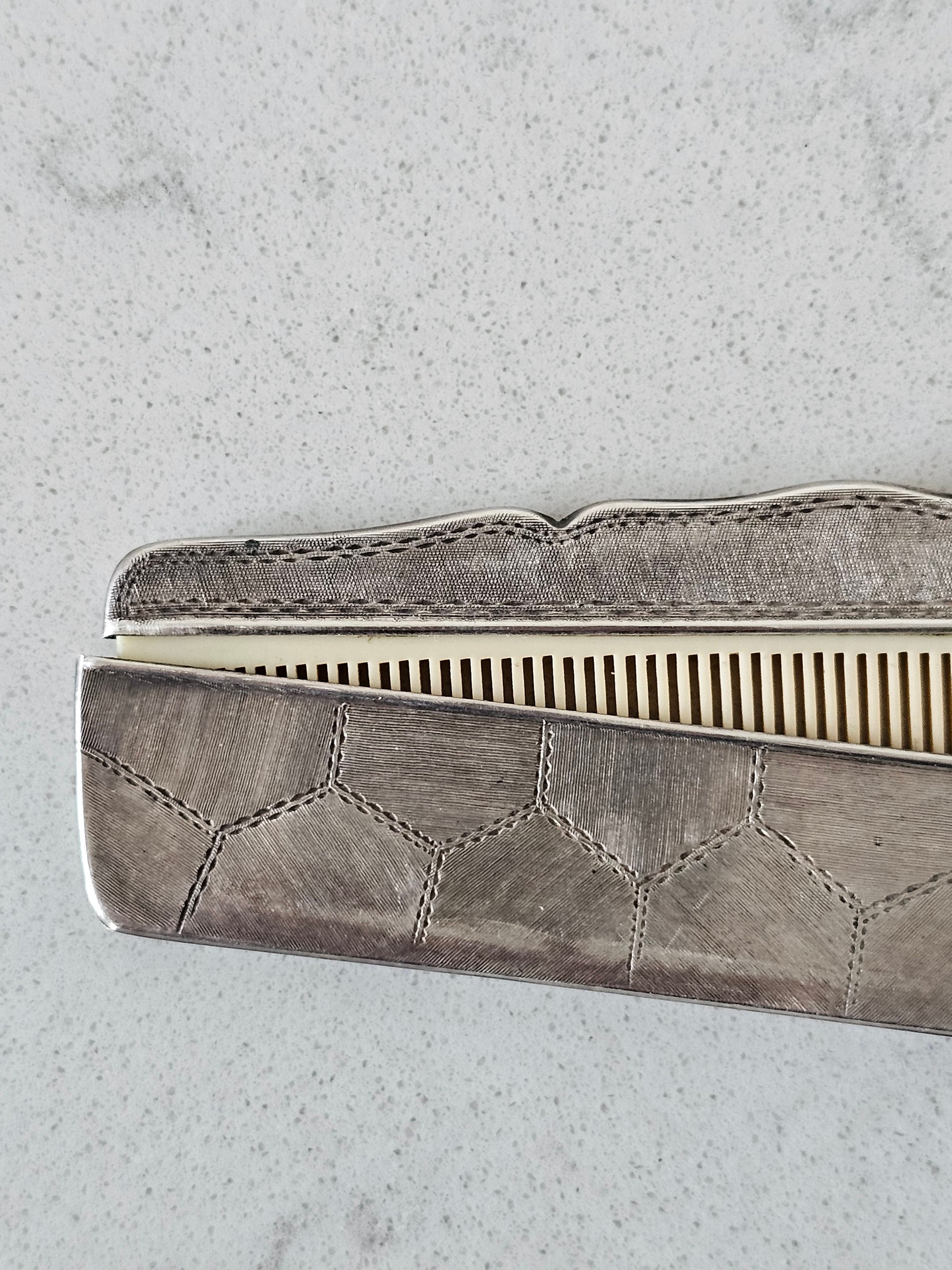 Vanha italialainen kampa uushopeisella kotelolla. Tämä viehättävä esine kulkee kätevästi pienessäkin käsilaukussa. Kampa on säilynyt ehjänä kotelon sisällä ja se on täysin käyttökelpoinen. Metallikotelossa on upeat koristelut.