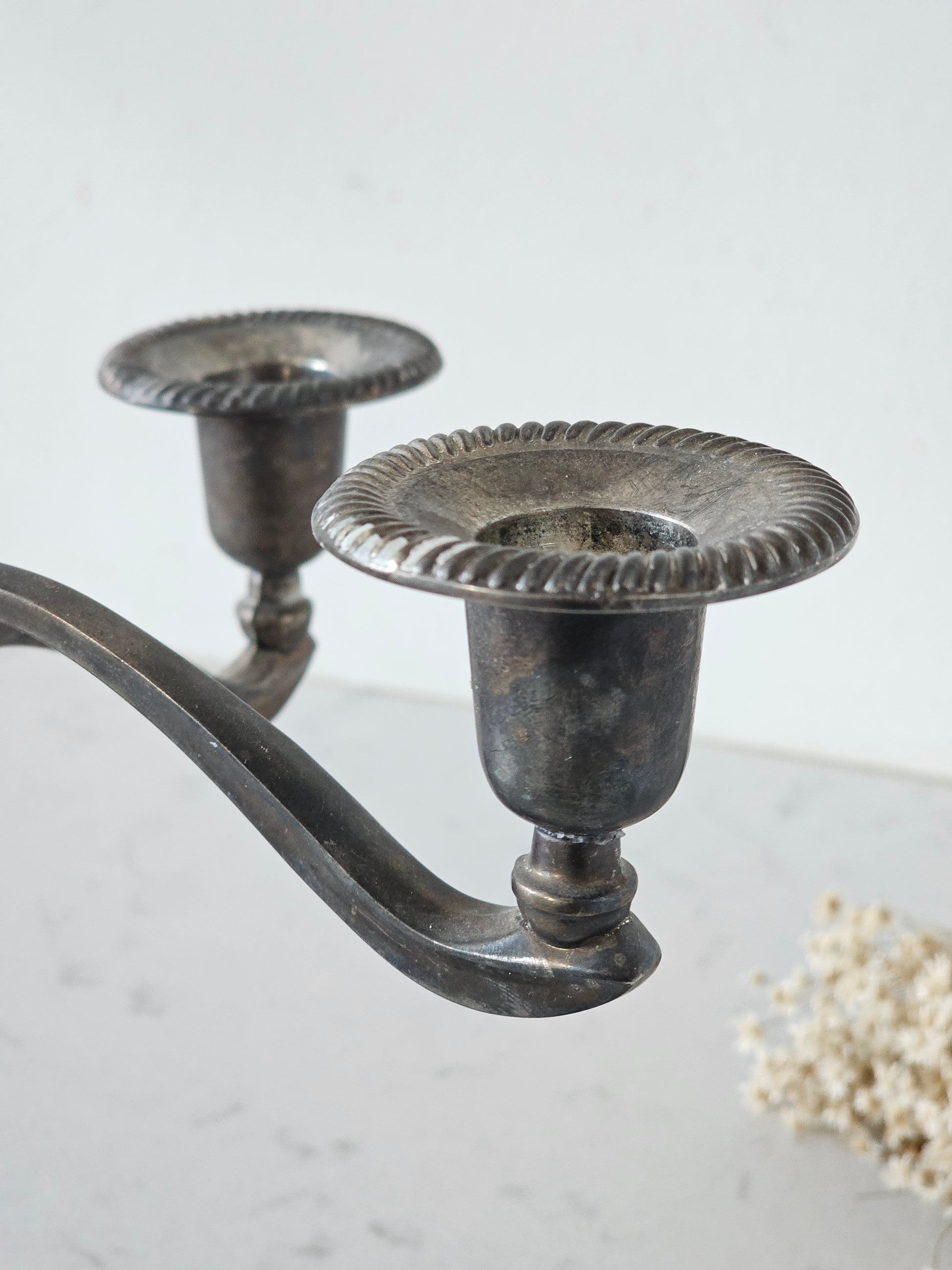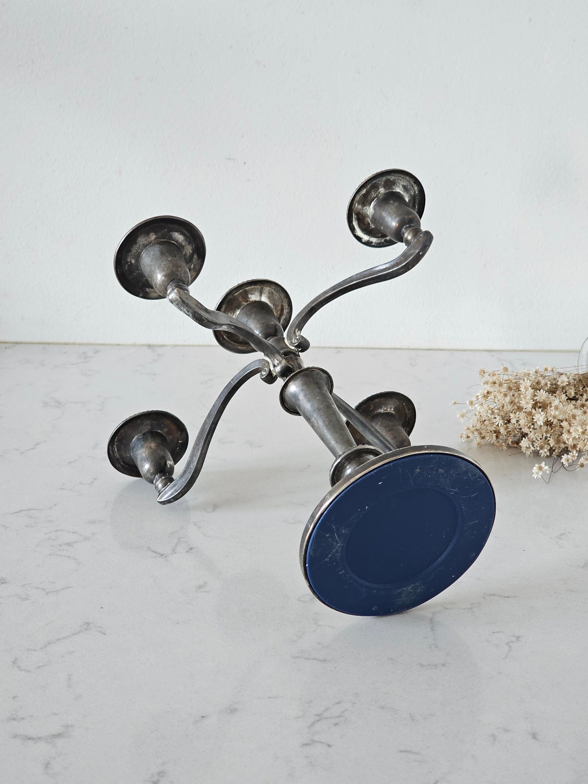 Kaunis painava kynttelikkö viidelle kynttilälle. Kynttelikössä on koristeelliset yksityiskohdat ja pinnassa ajanpatinaa.