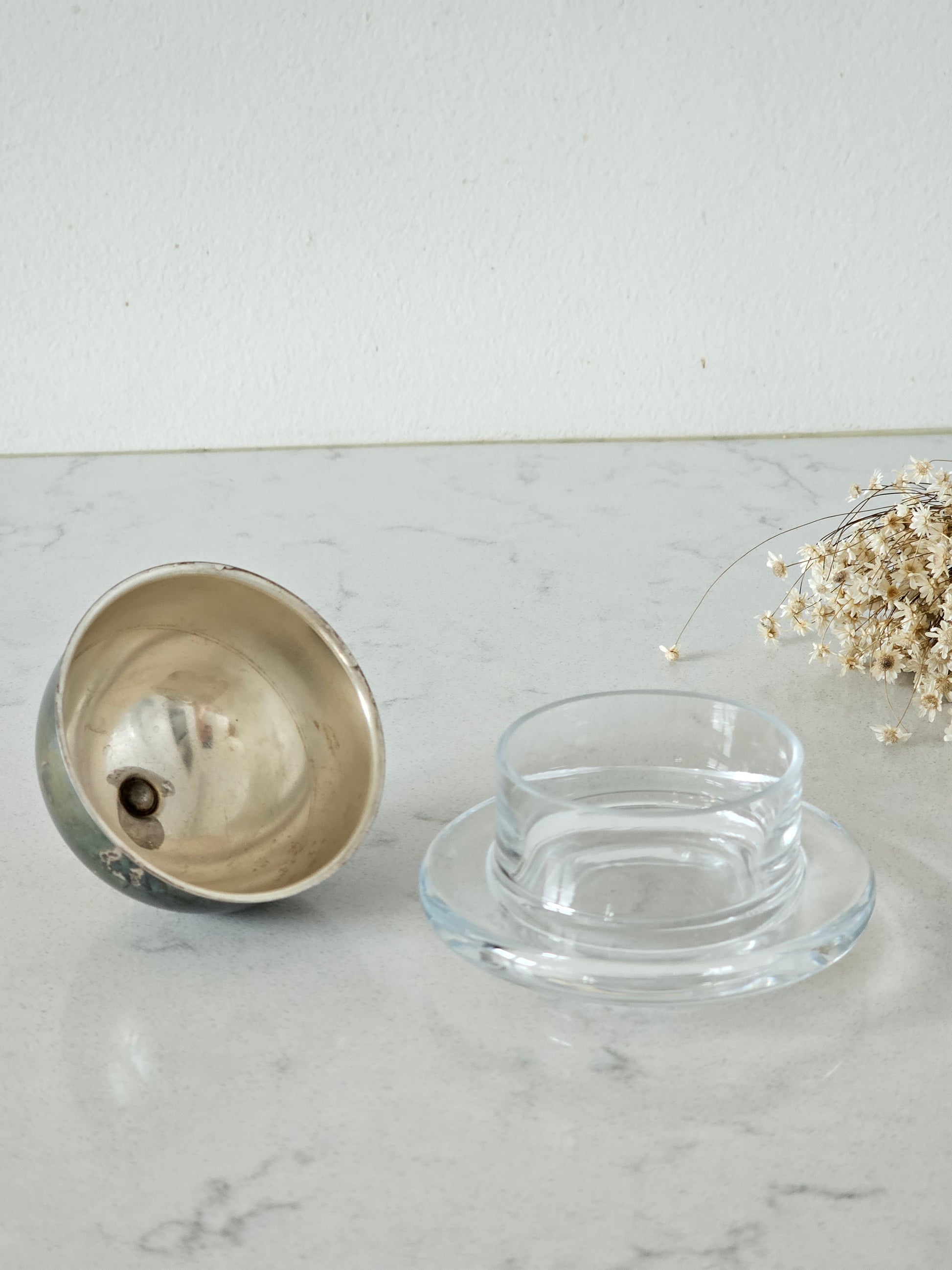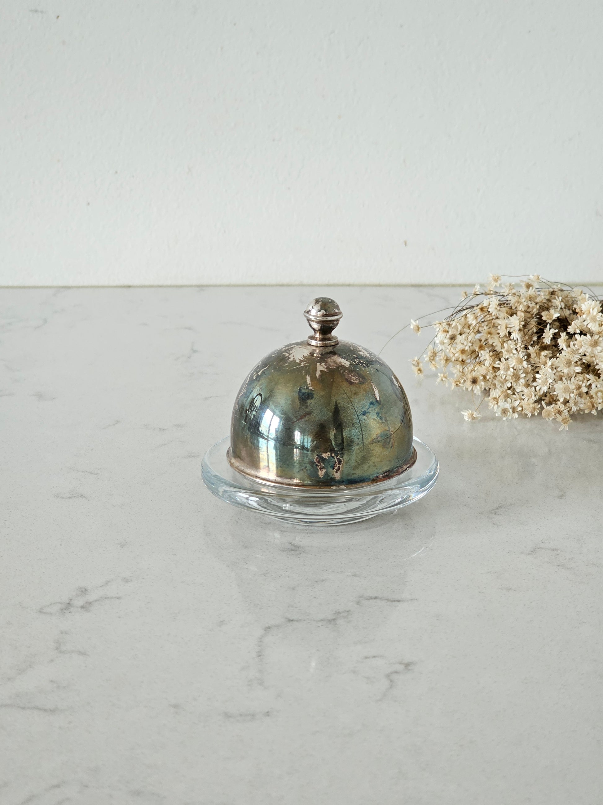 Vanha voiastia Keski-Euroopasta. Metallisen kuvun alla on lasinen astia. Kaunis siro kokonaisuus kattaukseen.